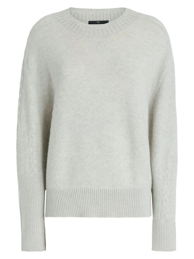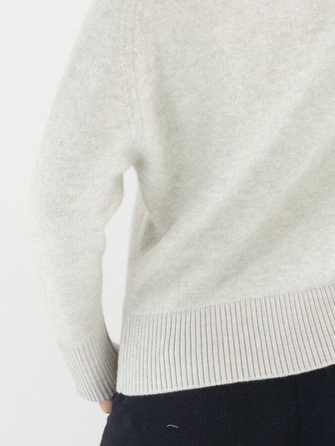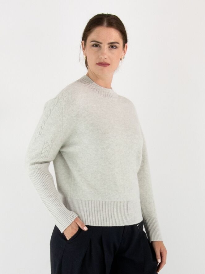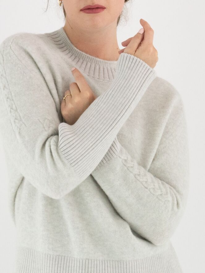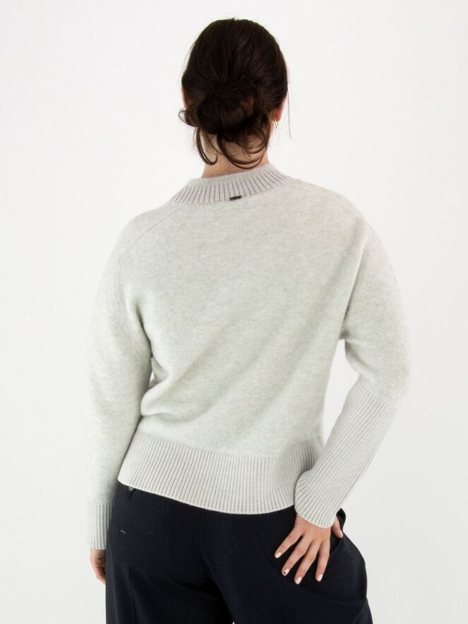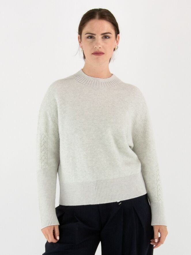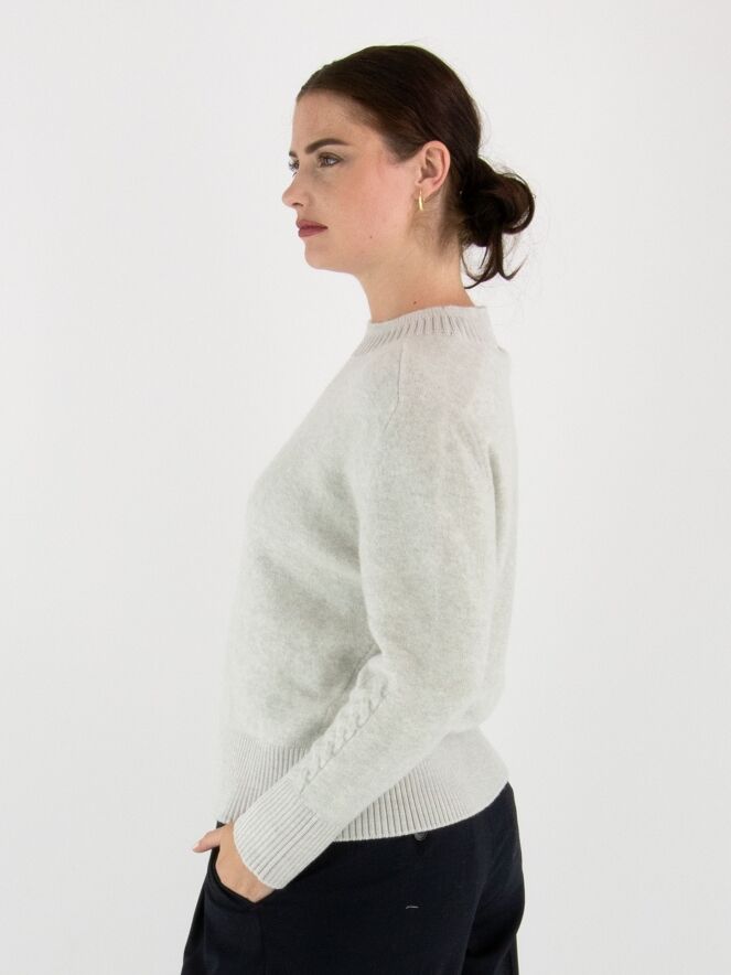 Een gemêleerde pullover van High in een lichtgrijze kleur. Langs de rand van de ronde hals zit een geribbelde boord. De uiteinden van de lange mouwen en de onderkant zijn afgewerkt met een fijn geribbelde structuur. Vanaf de schouders loopt er op enkele plaatsen een kabelpatroon door naar de mouwen. Deze pullover mag met de hand worden gewassen.