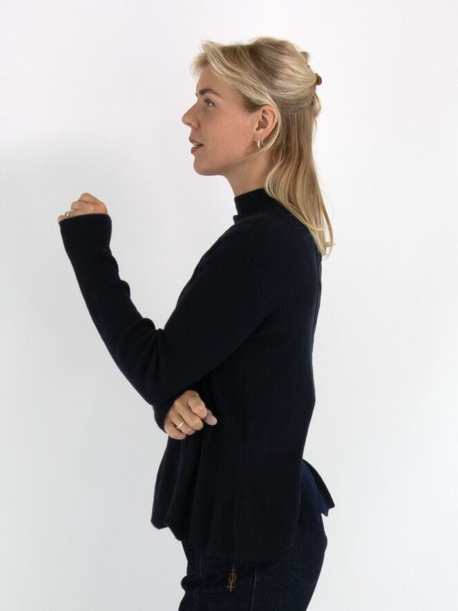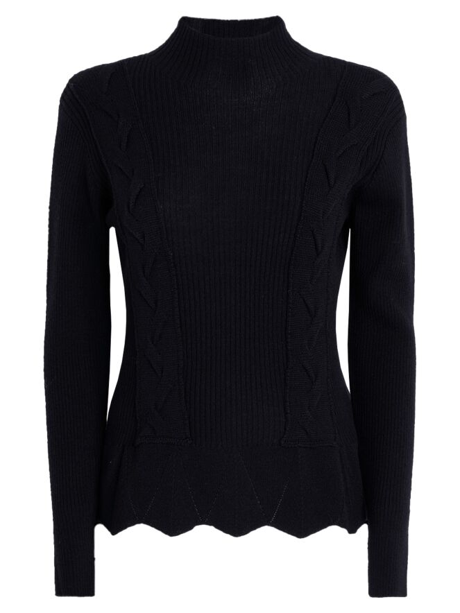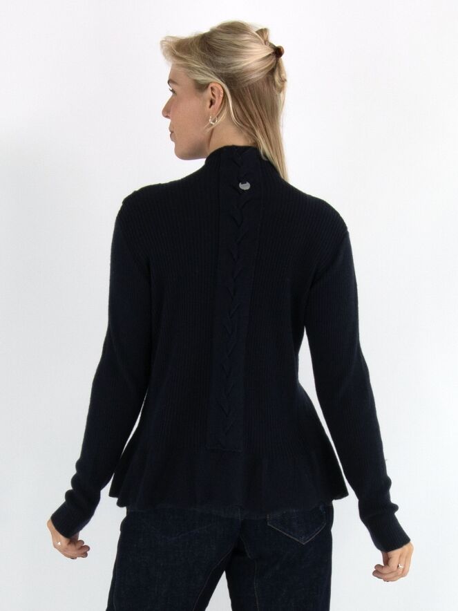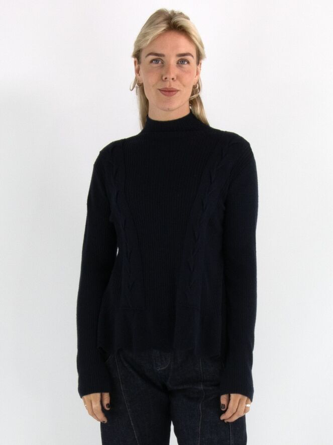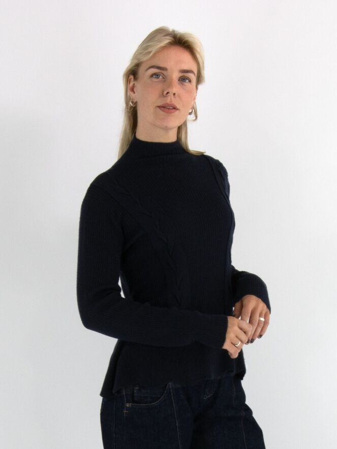 Een pullover van High in de kleur marineblauw, gebreid in meerdere patronen waaronder een kabelpatroon langs beide zijkanten. De pullover heeft een turtle hals en loopt vanaf de taille uit in een A-lijn. Deze pullover mag met de hand worden gewassen.