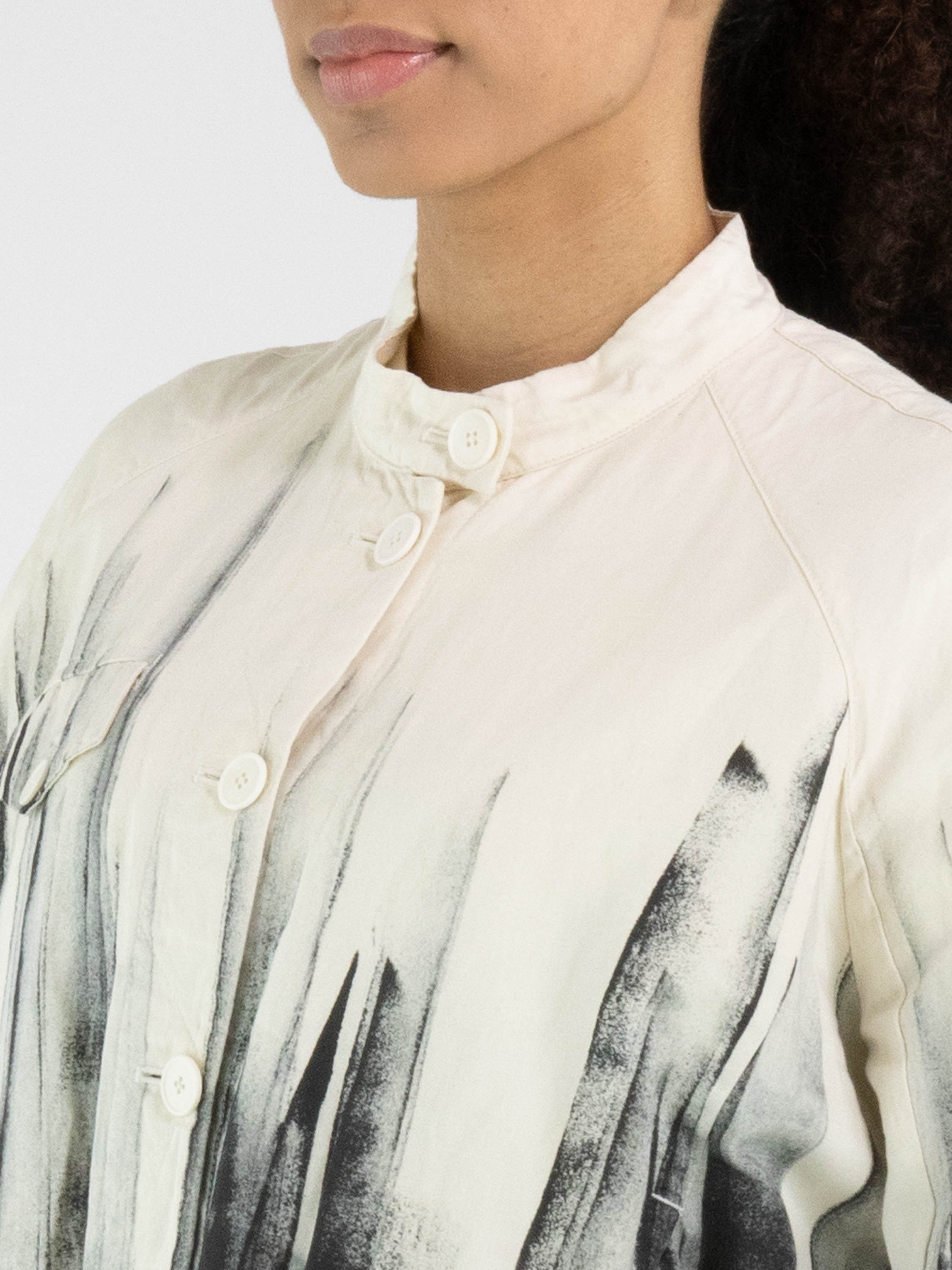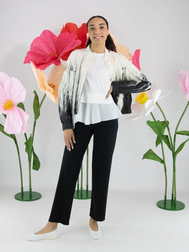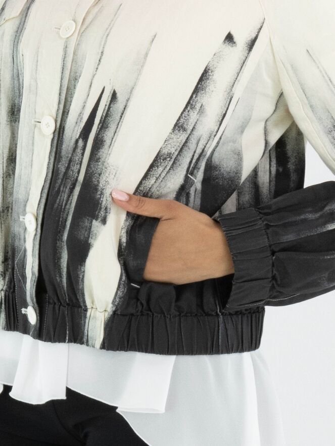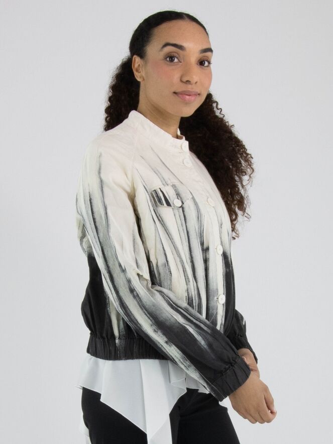 Korte blazer van High in een artistieke paintprint in de kleuren roomwit en zwart. De zwarte paintlook is vanuit de onderzijde naar boven toe verwerkt, wat het ontwerp een krachtig en eigentijds karakter geeft. De blazer sluit met zes knopen en is ter hoogte van de taille voorzien van steekzakken. Aan de onderzijde zorgt een fijn geplooide elastische boord voor een subtiele, moderne afwerking. Deze exclusieve designerblazer mag niet worden gewassen.