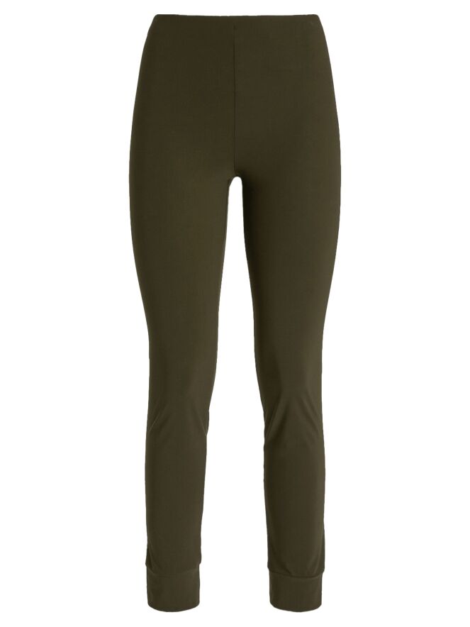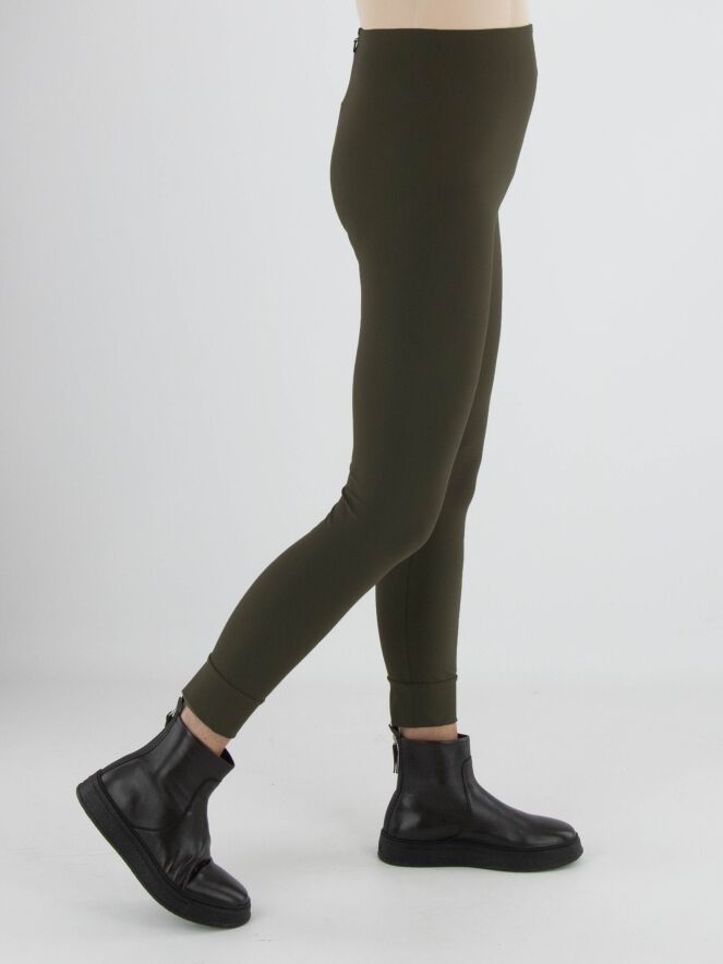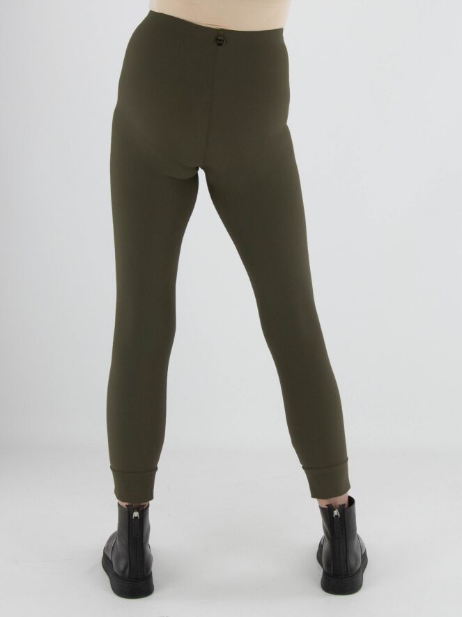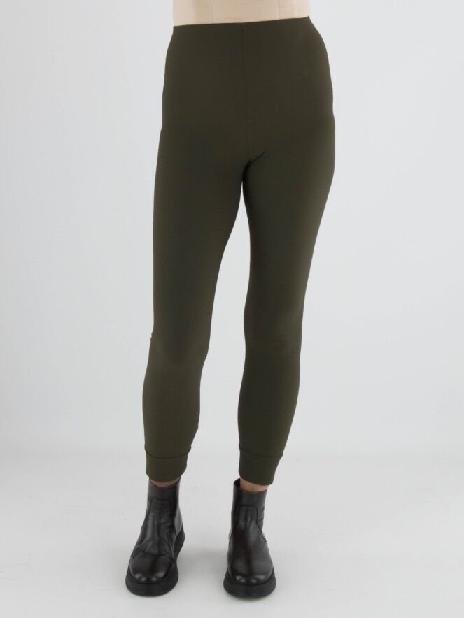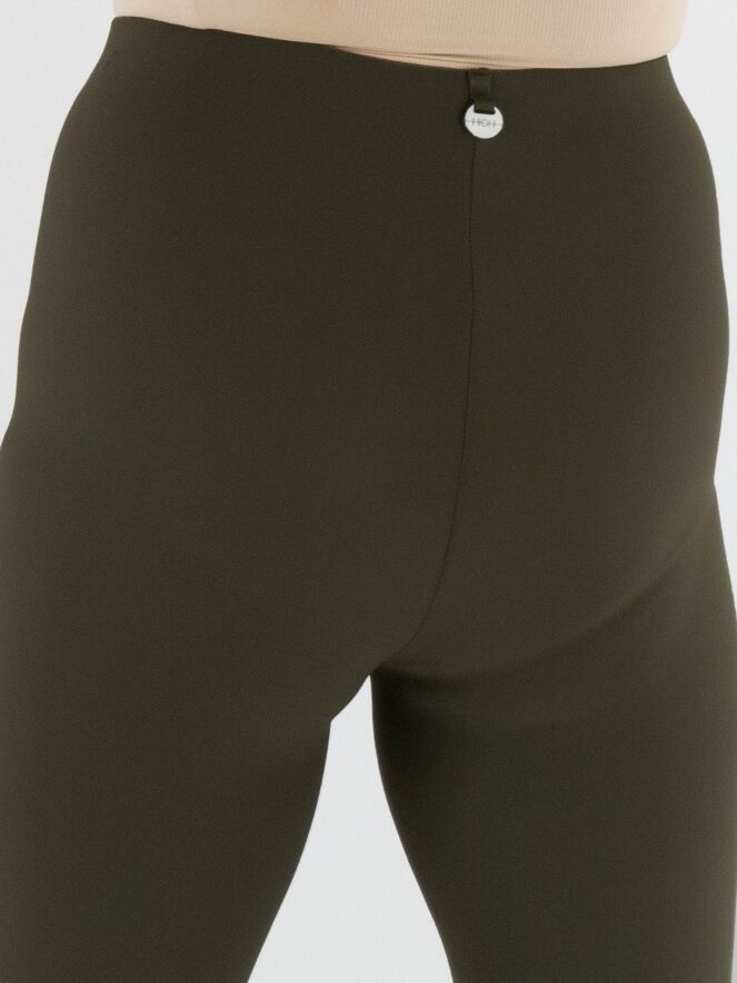 Een legging van High in de kleur olijfgroen. In de taille zit een elastische band. Aan de onderkant bevindt zich een brede bies met een stiknaad. Deze legging mag op 30 graden worden gewassen.