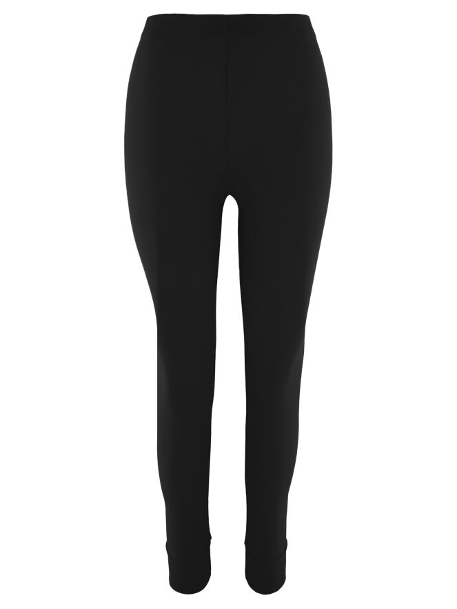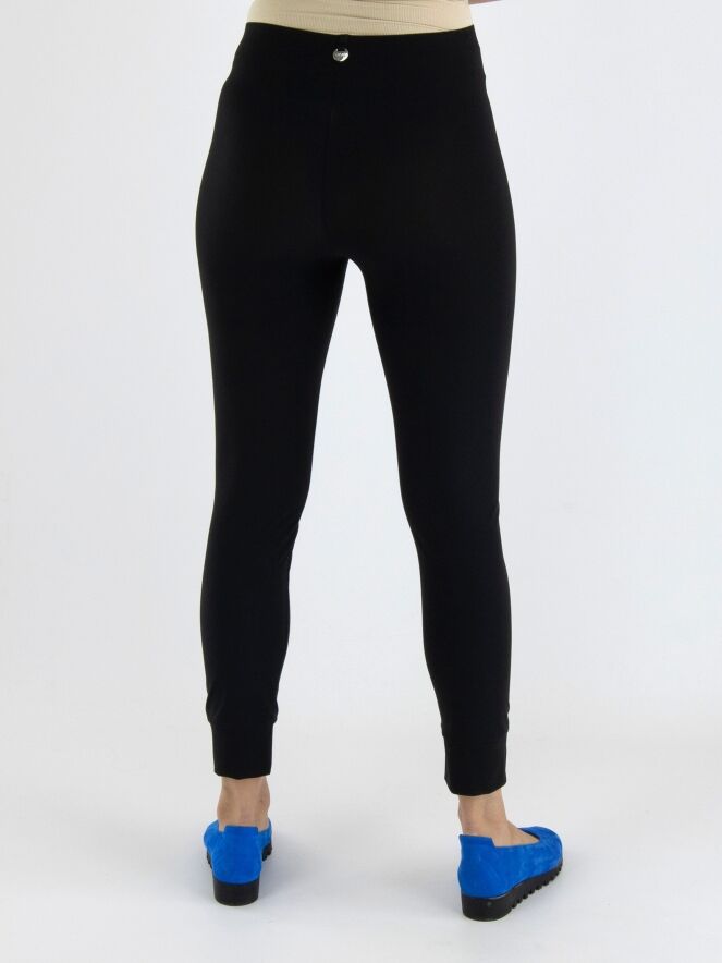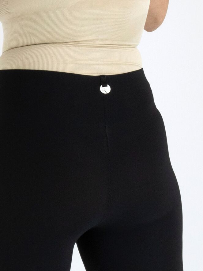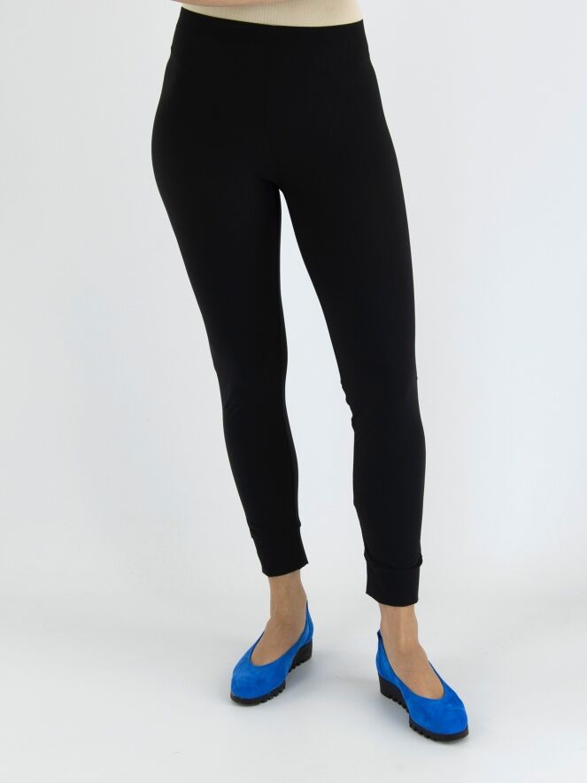 Een legging van High in de kleur zwart. In de taille is een elastieken band. Aan de onderkant is een brede bies met een stiknaad. deze legging mag op 30 graden worden gewassen.