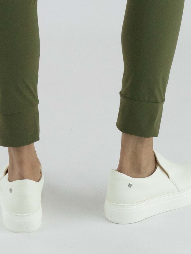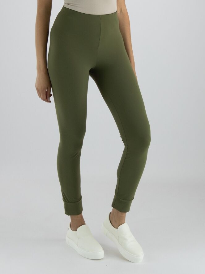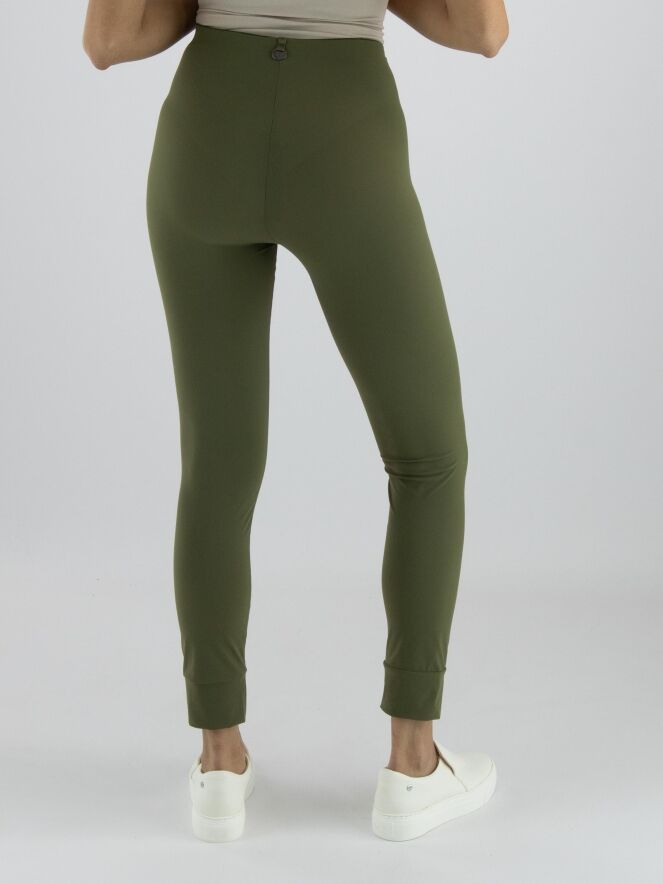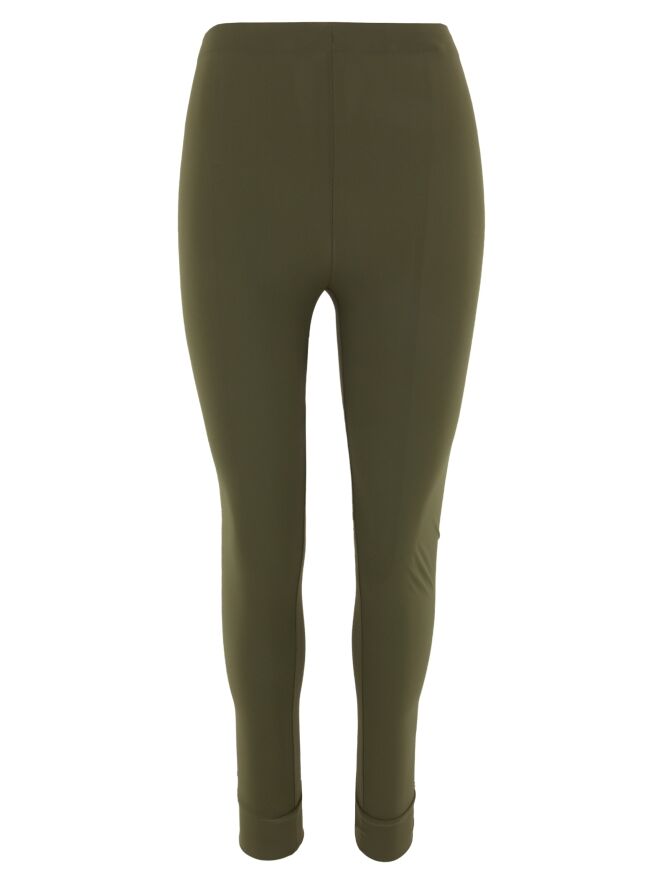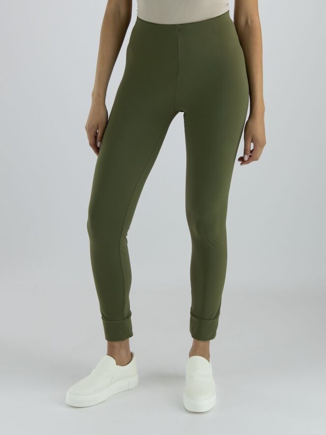 Een legging van High in de kleur olijfgroen. In de taille is een elastieken band. Aan de onderkant is een brede bies met een stiknaad. deze legging mag op 30 graden worden gewassen.