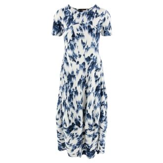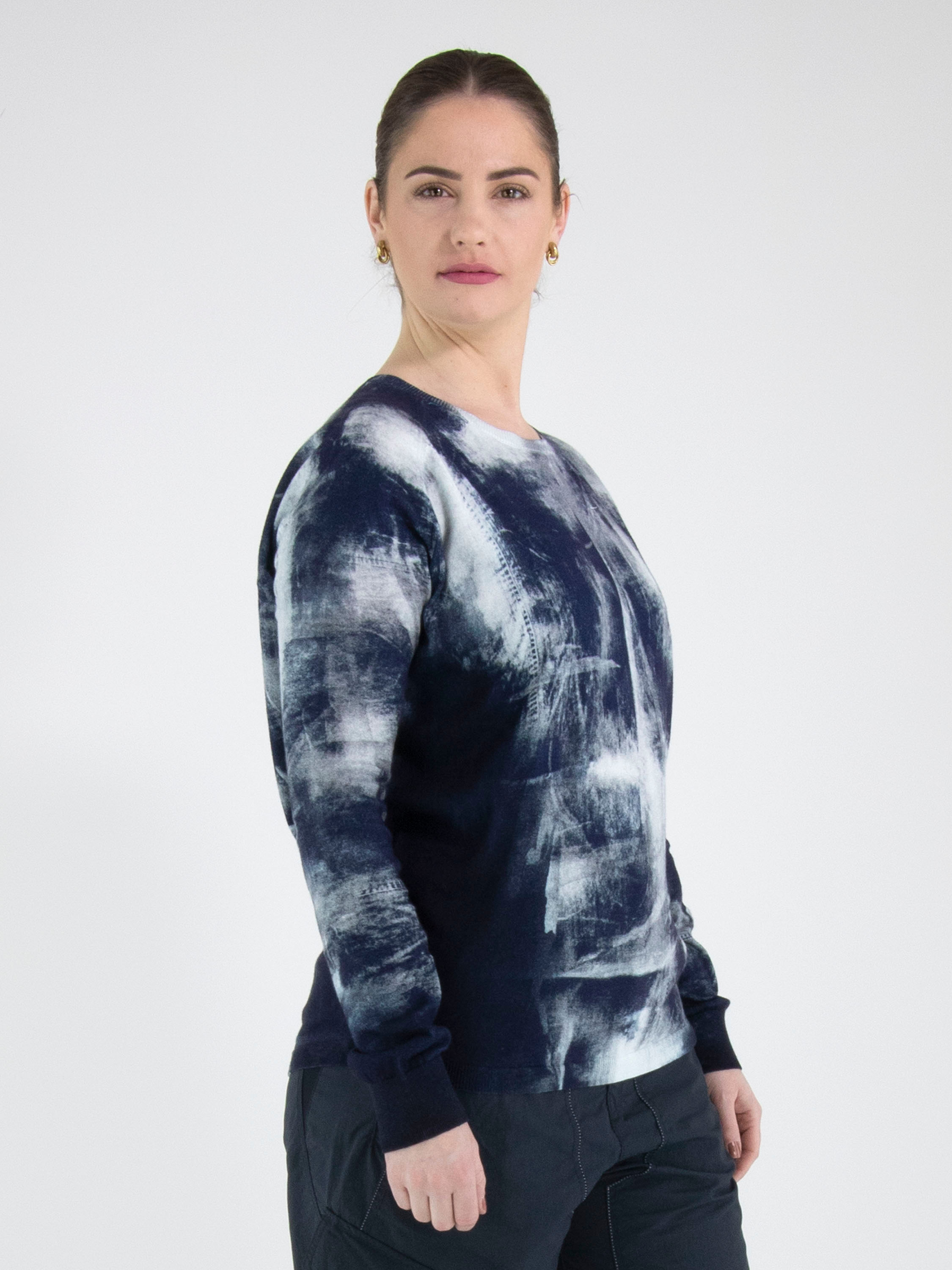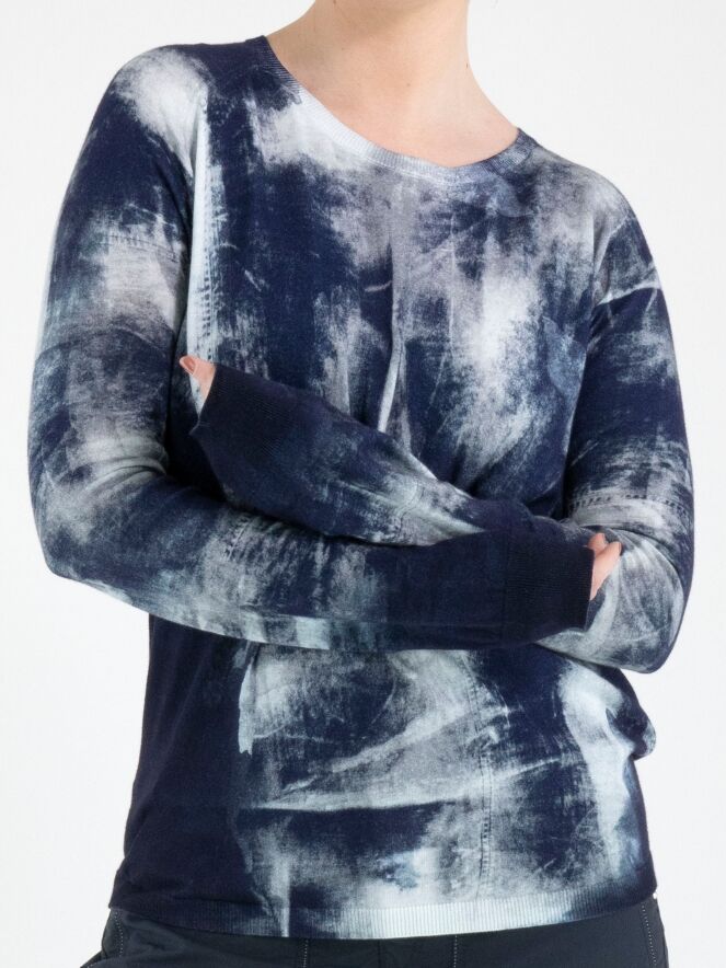 Een pullover van High in een grafische print met meerdere tinten blauw. Langs de rand van de ronde hals, de uiteinden van de lange mouwen en de onderkant is een fijn geribbelde tricot boord. Deze pullover mag niet worden gewassen.