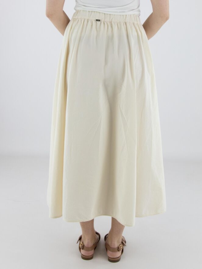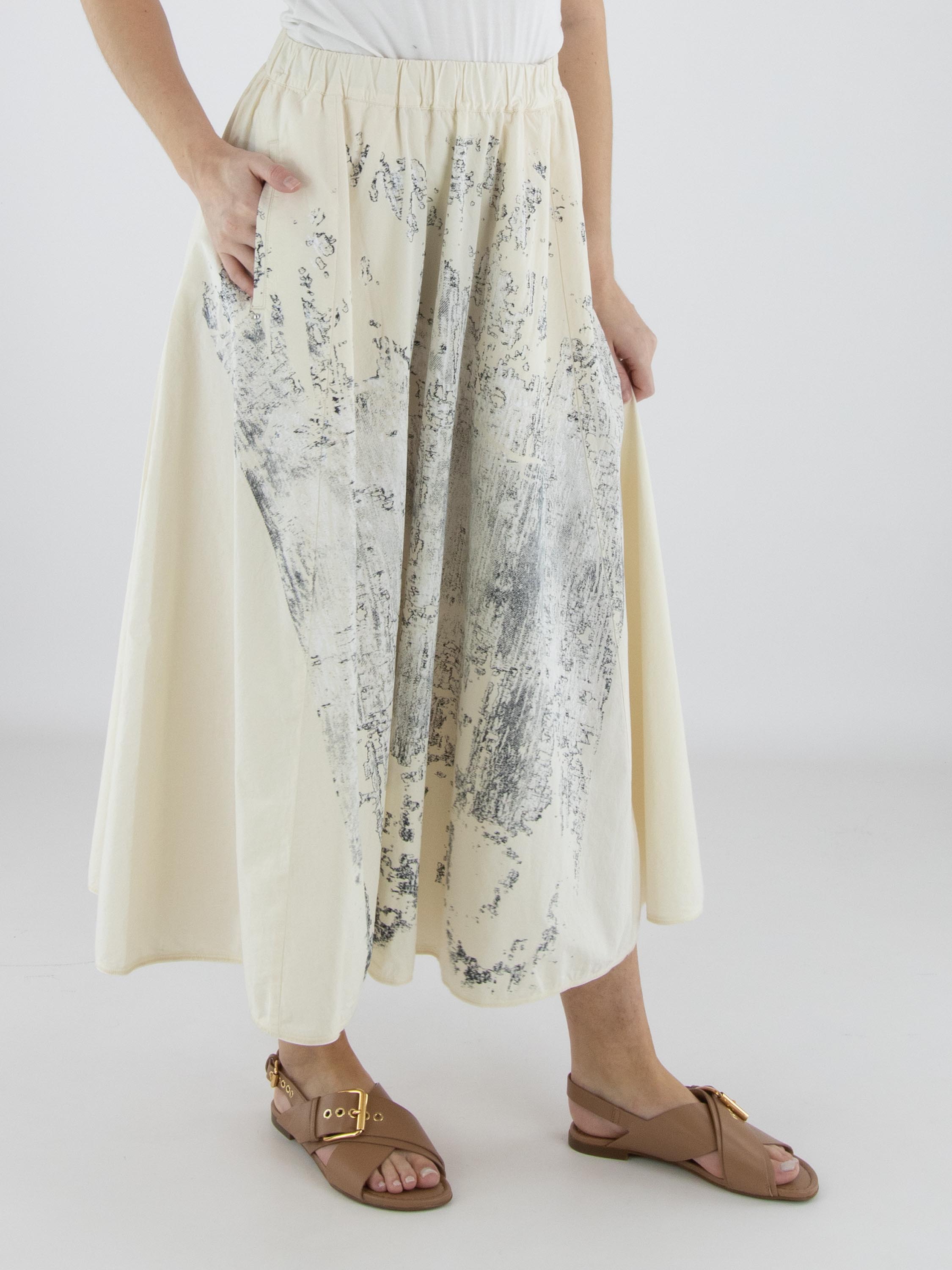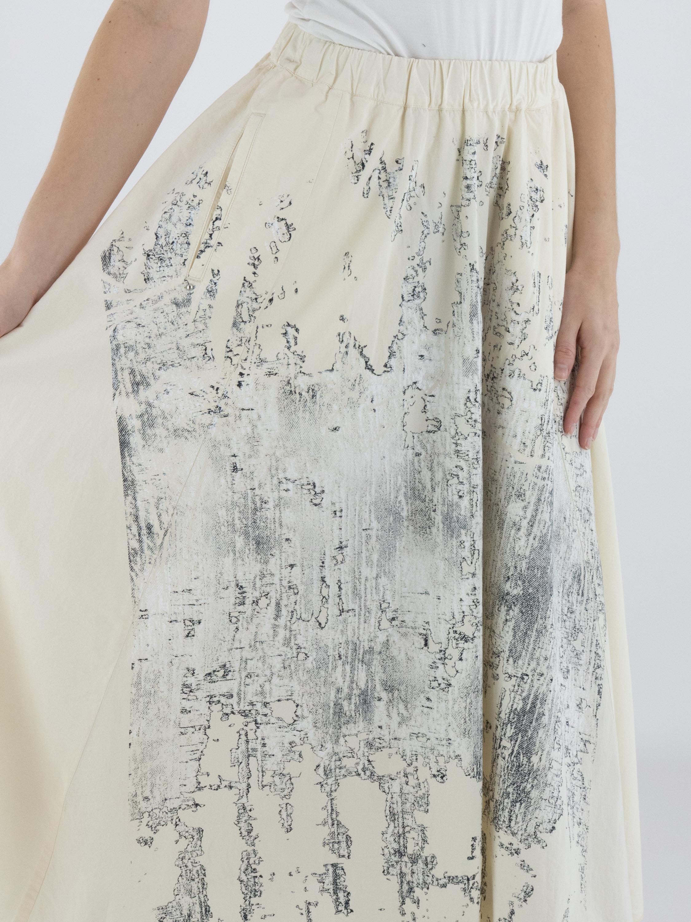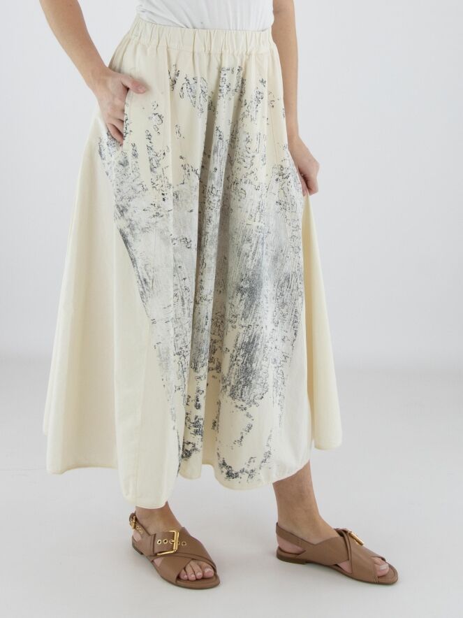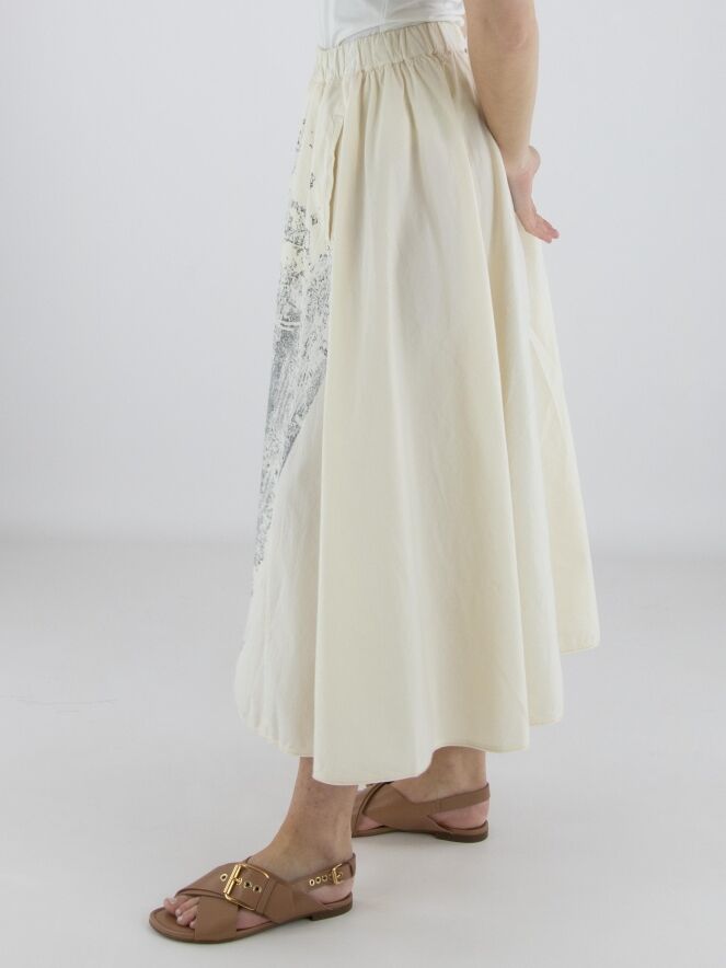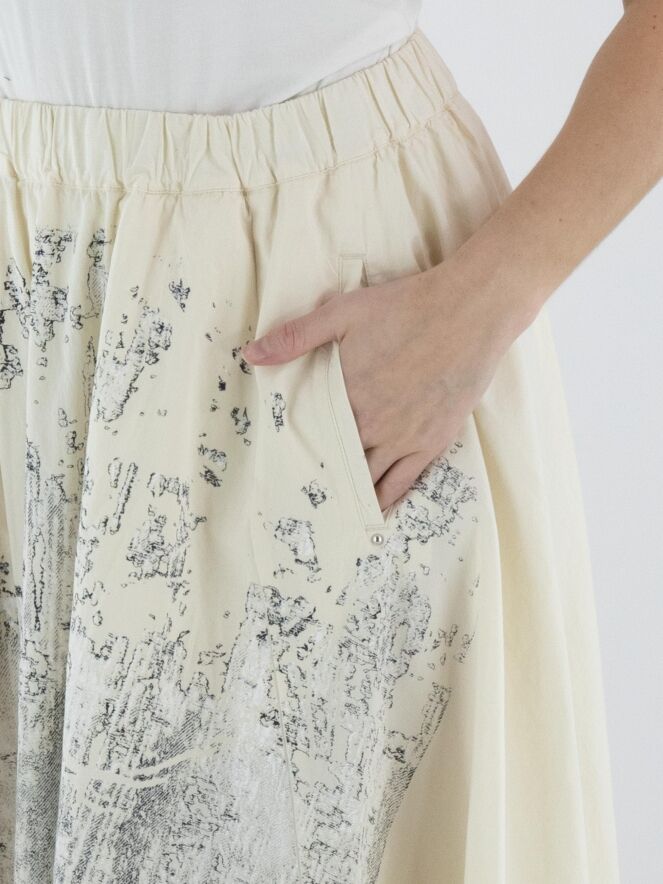Rok van High met aan de voorzijde een grafische print in meerdere tinten wit en zwart op een roomwitte achtergrond. De achterzijde is uitgevoerd in een effen roomwitte kleur, wat zorgt voor een stijlvol contrast. In de taille is een fijn geplooide elastische band verwerkt voor een comfortabele pasvorm. De rok heeft steekzakken, is ongevoerd en kan met de hand worden gewassen.
