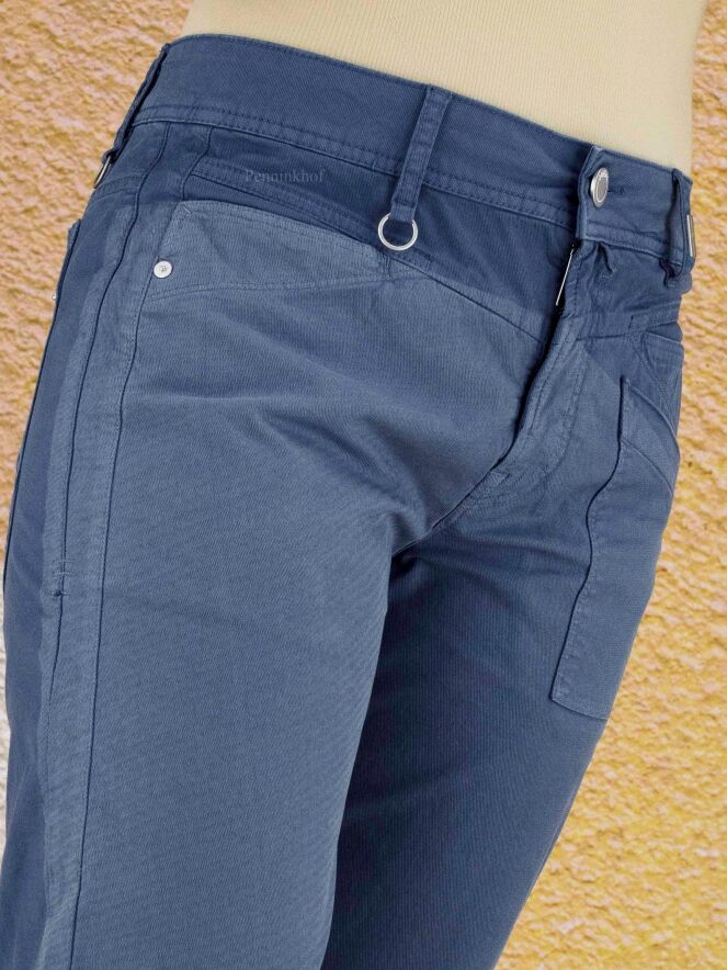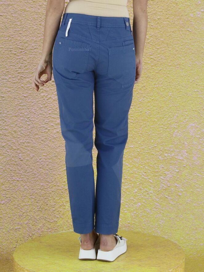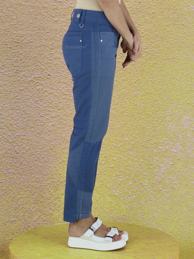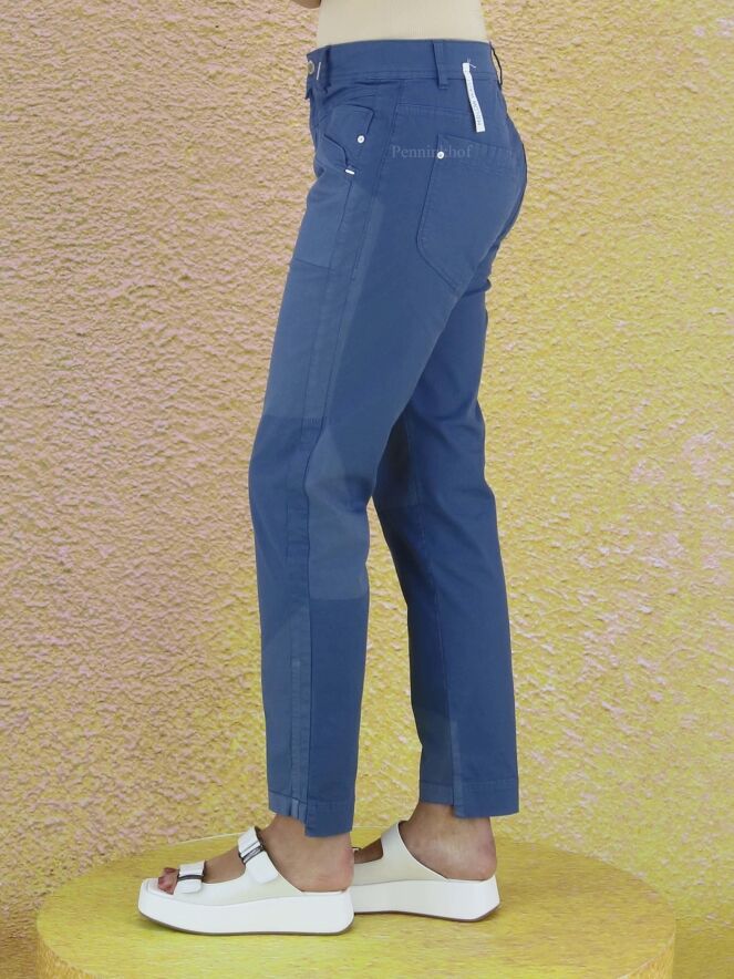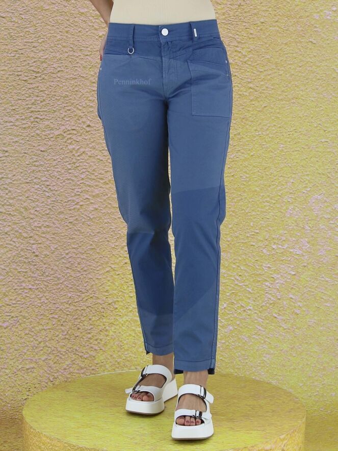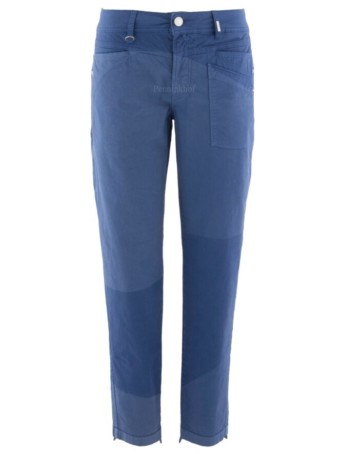 Een broek van High in de kleur blauw. De broek heeft meerdere vlakken met tint verschillen en op de linker pijp is op het bovenbeen een licht streep patroon. Deze broek mag op 30 graden worden gewassen.