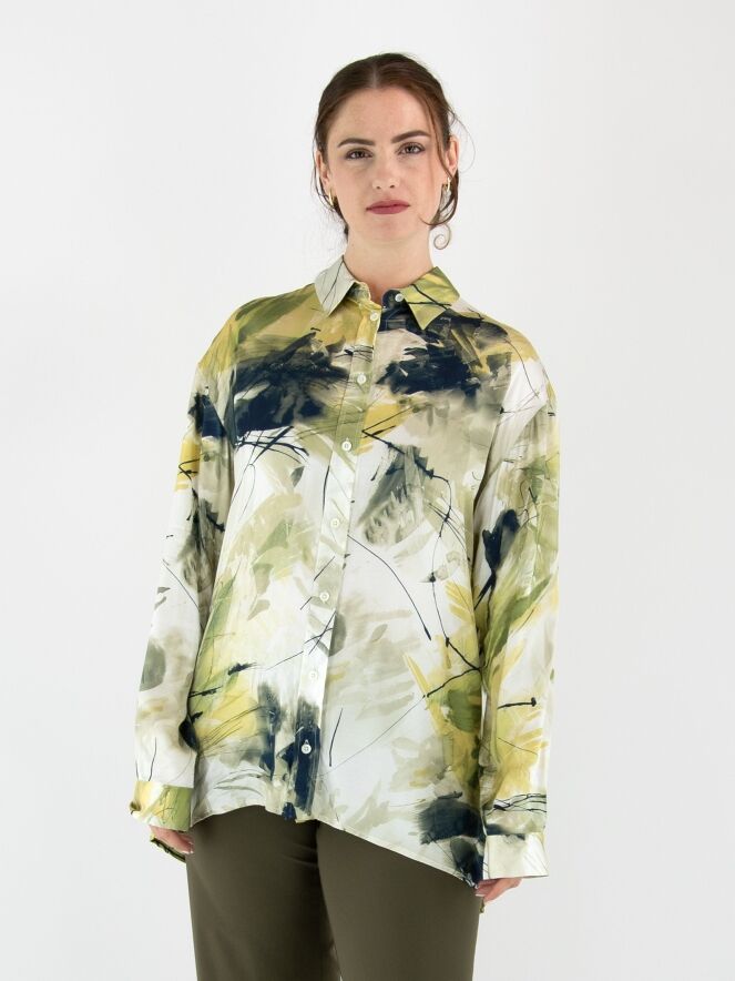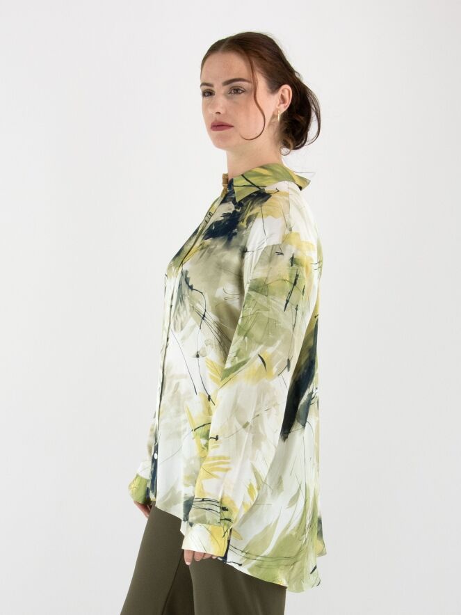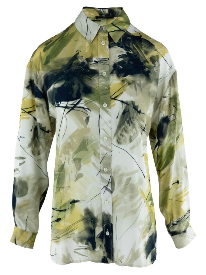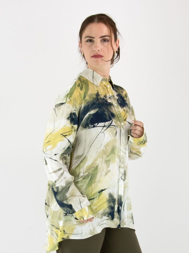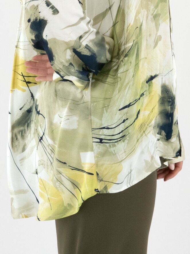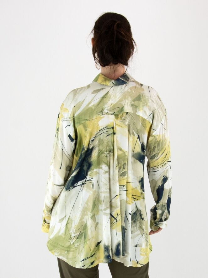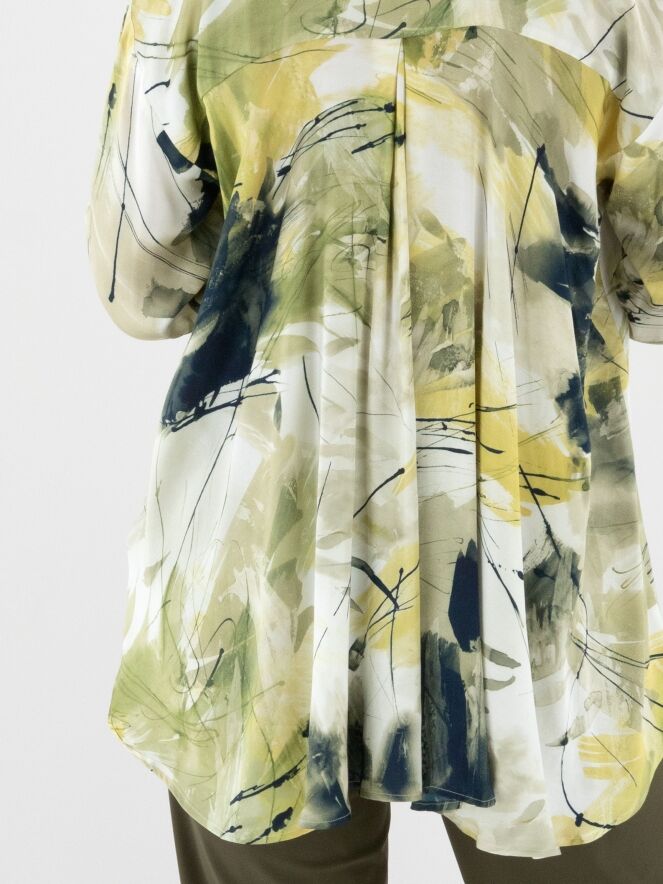 Een blouse van High in een grafische print met meerdere tinten limegroen, beige, antraciet en roomwit. Aan de achterkant loopt vanuit de stiknaad onder de schouderbladen een dubbele plooi. Deze blouse mag met de hand worden gewassen.
