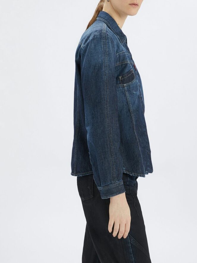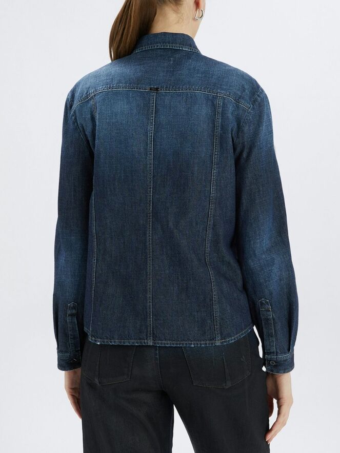 Een jeansblouse van High in een basic jeanskleur. Op beide voorpanden van de blouse zijn decoratieve kleine zakken bevestigd in een diagonale positie. Deze blouse kan op 30 graden worden gewassen.