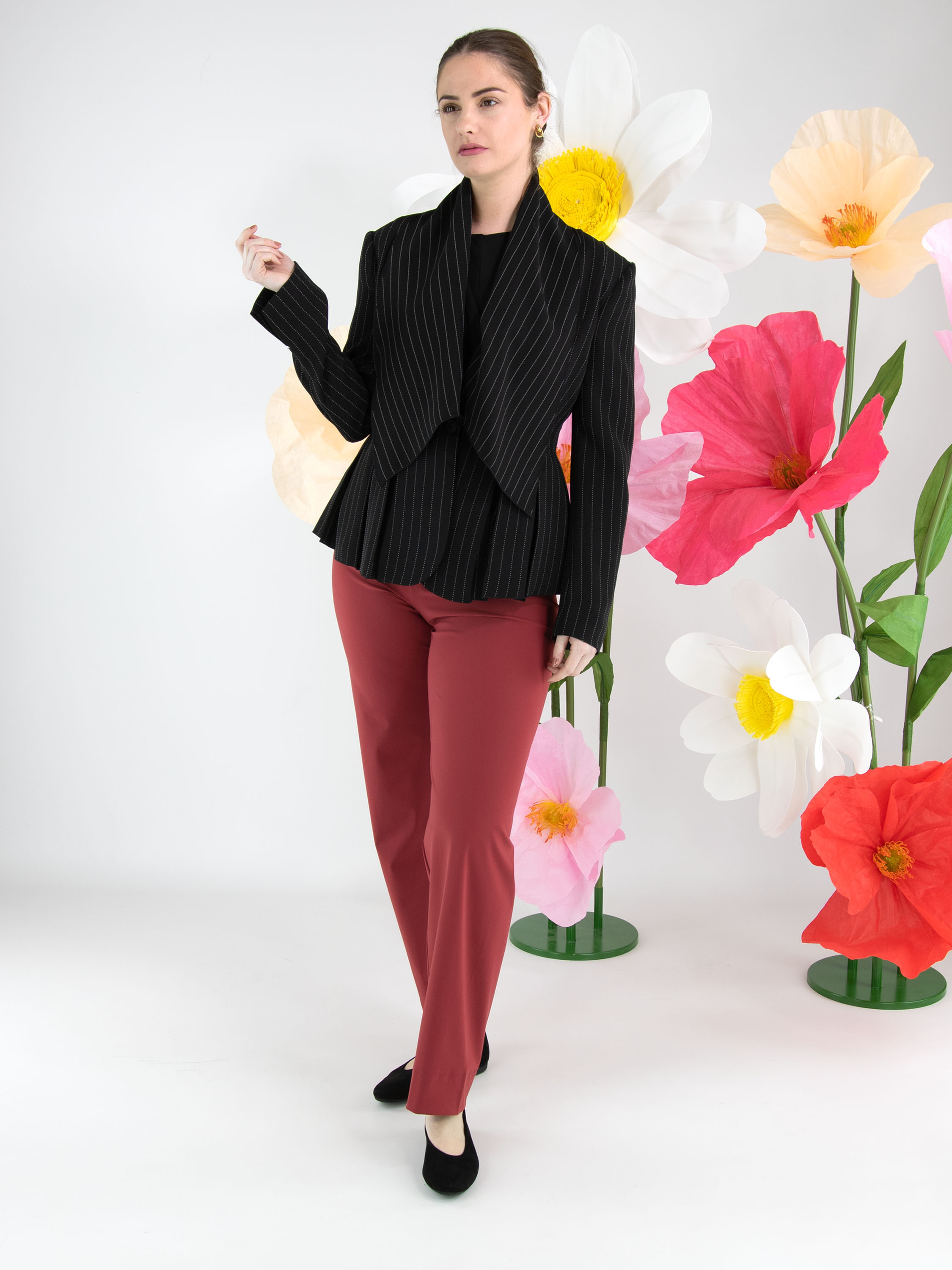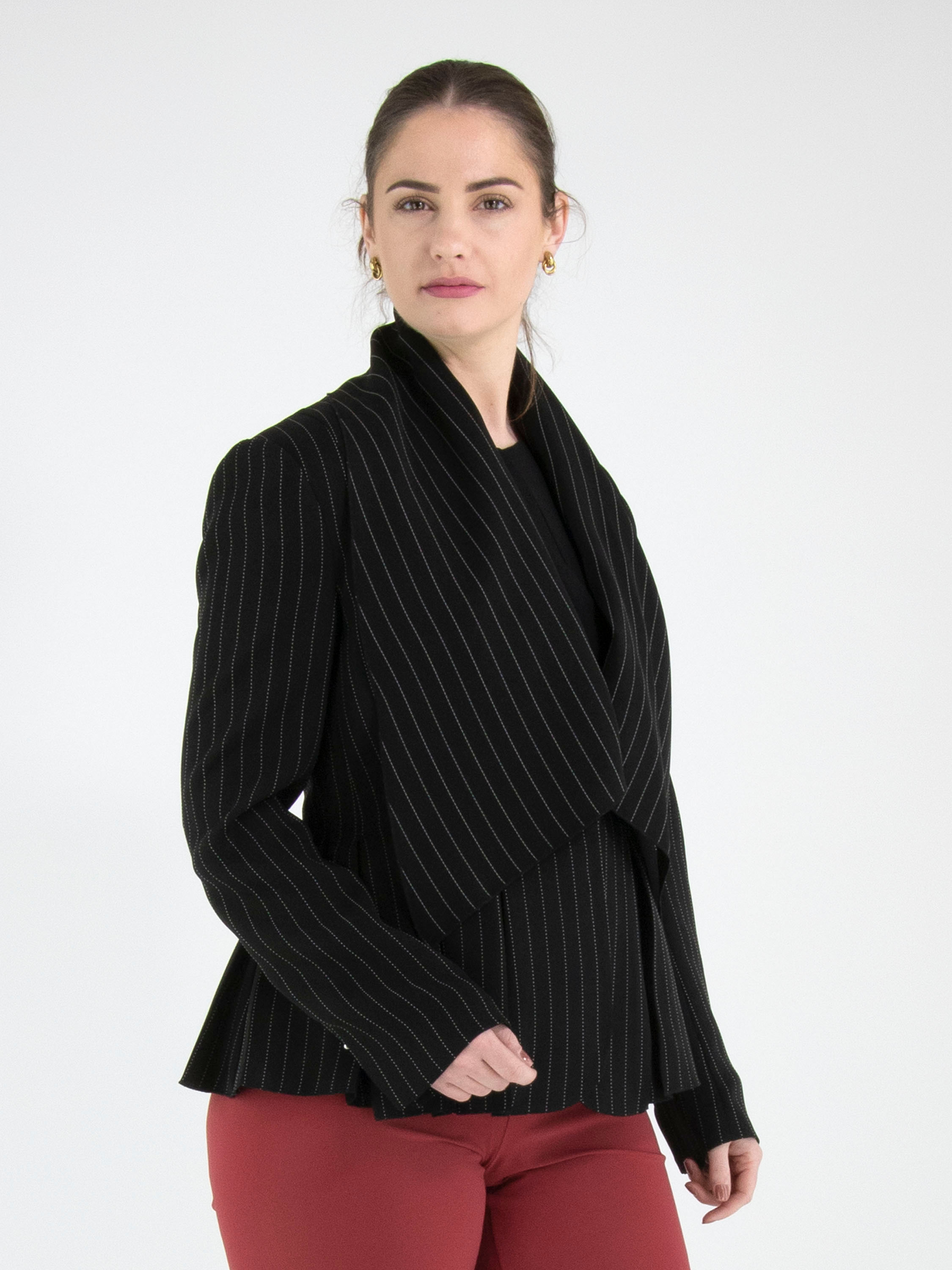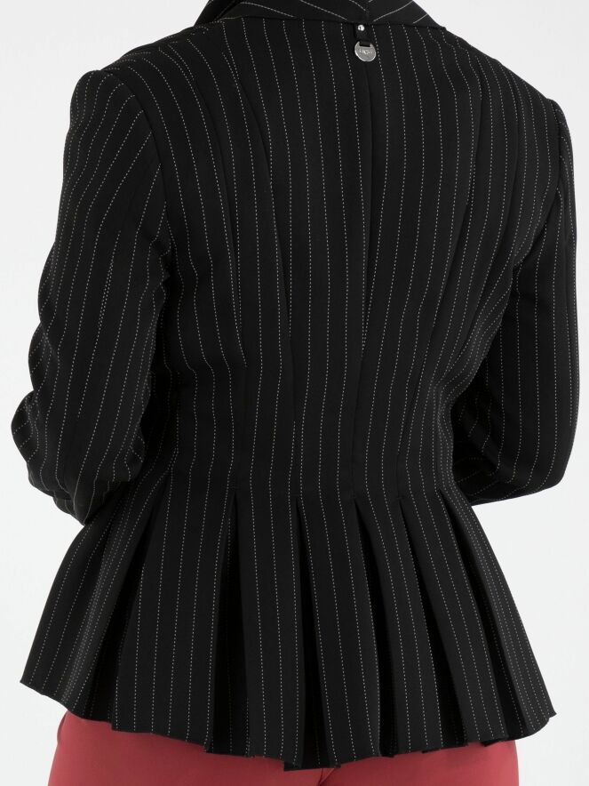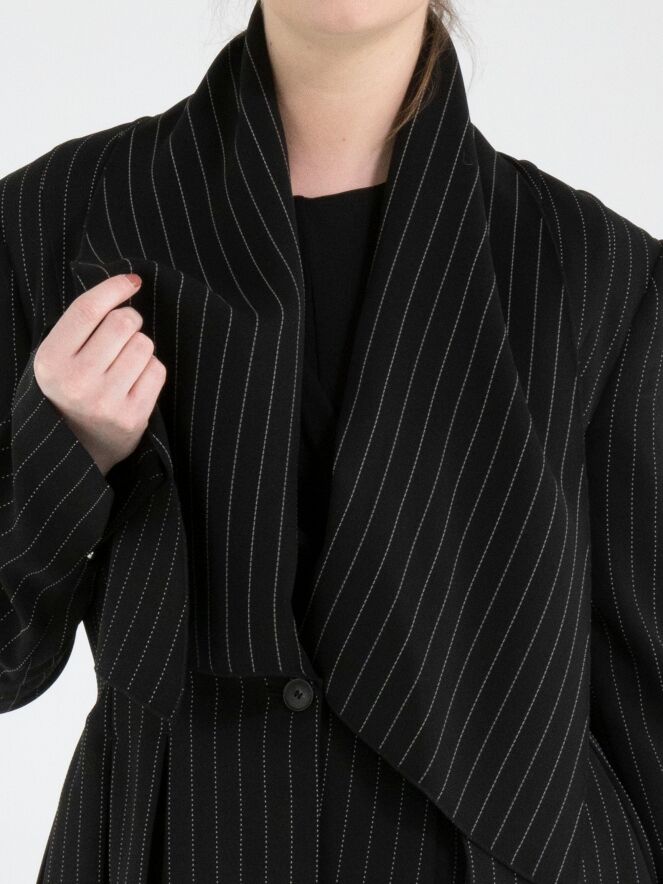 Een blazer van High in een krijtstreep met de kleuren zwart en een witte stiknaad. De blazer heeft een brede shawlkraag en een sluiting met één knoop. Aan het uiteinde van de lange mouwen is een korte split met een zilverkleurige stud. Ter hoogte van de taille zijn steekzakken. Aan de achterkant zijn vanuit de taille meerdere plissés verwerkt. Deze blazer mag niet worden gewassen.