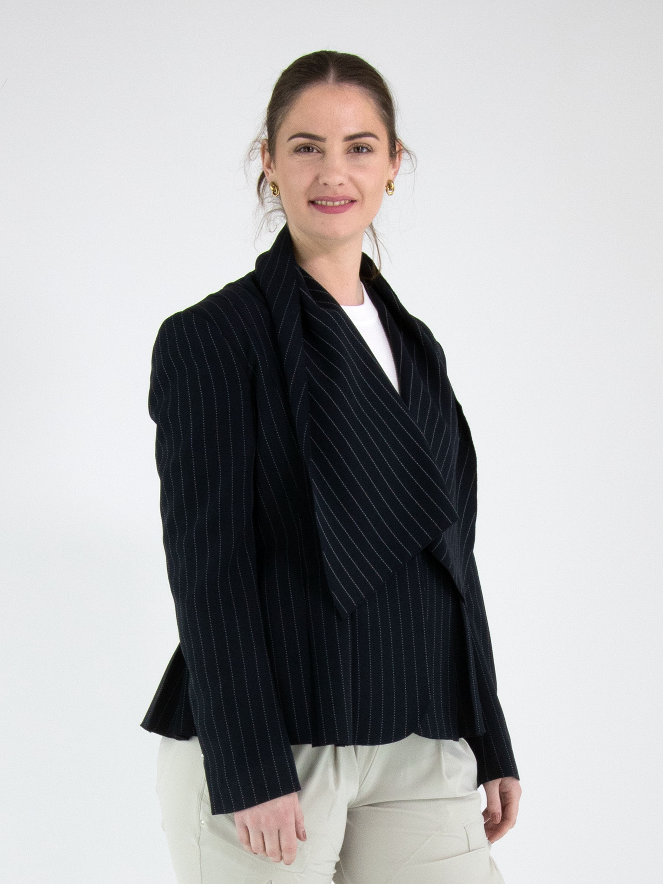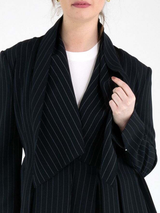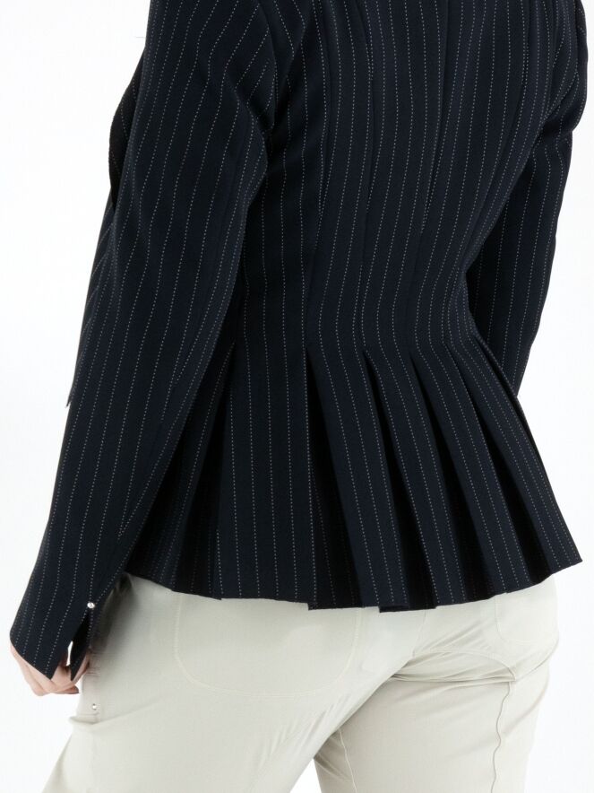 Een blazer van High in een krijtstreep met de kleuren marineblauw en een witte stiknaad. De blazer heeft een brede shawlkraag en een sluiting met één knoop. Aan het uiteinde van de lange mouwen is een korte split met een zilverkleurige stud. Ter hoogte van de taille zijn steekzakken. Aan de achterkant zijn vanuit de taille meerdere plissés verwerkt. Deze blazer mag niet worden gewassen.