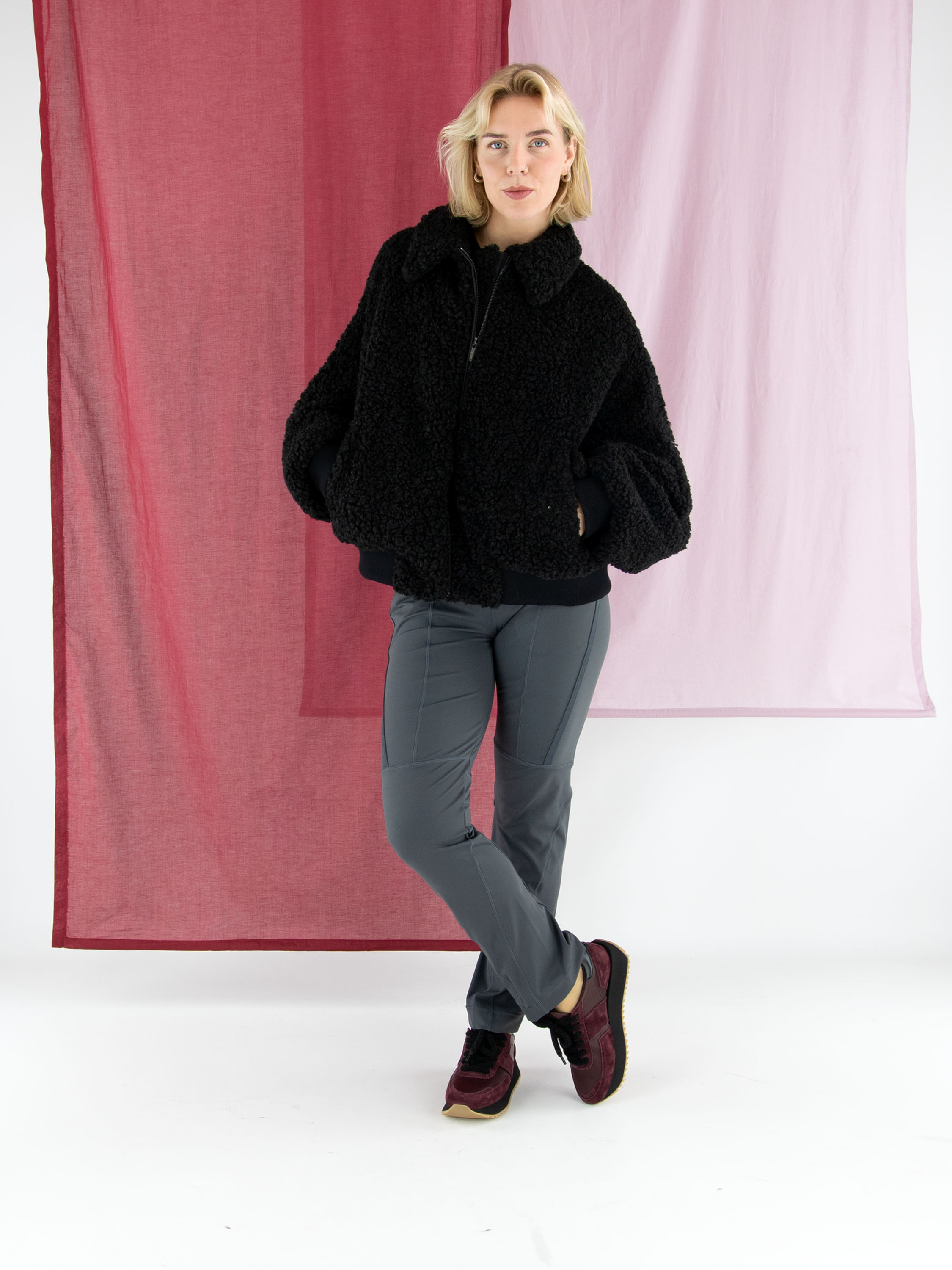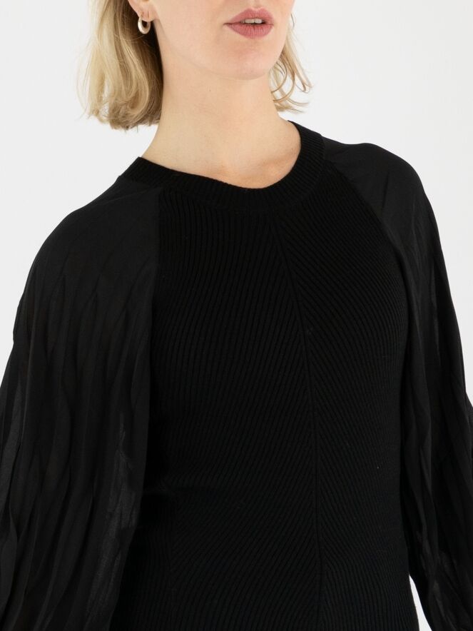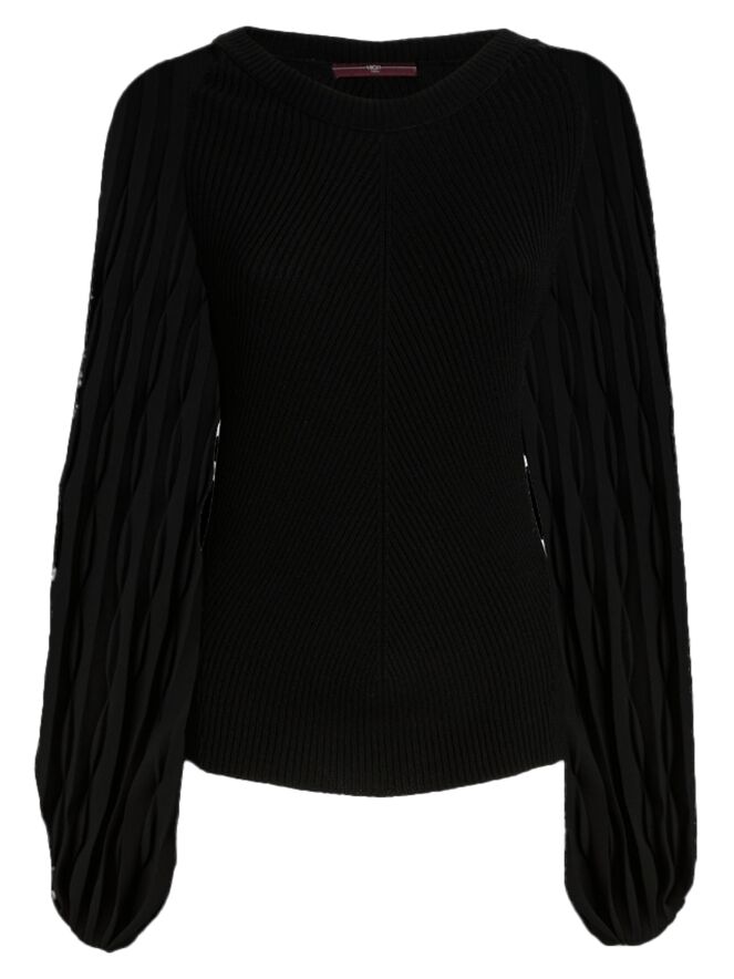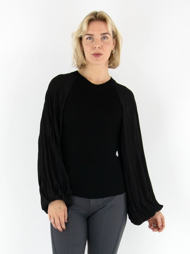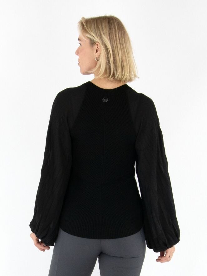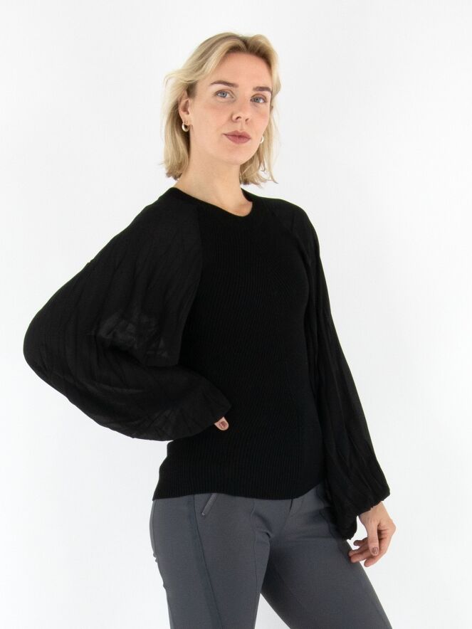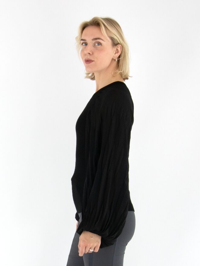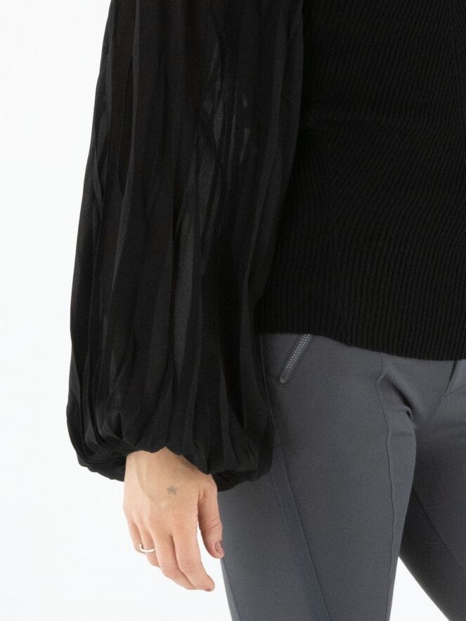 Een fijn geribbelde pullover van High in de kleur zwart. De geribbelde lijnen lopen vanuit het midden in een elegante visgraatstructuur. De wijde voile mouwen eindigen in een bies waarlangs de stof verfijnd is geplooid, wat een luchtig en vrouwelijk accent geeft. De pullover heeft een ronde hals en kan met de hand worden gewassen.
