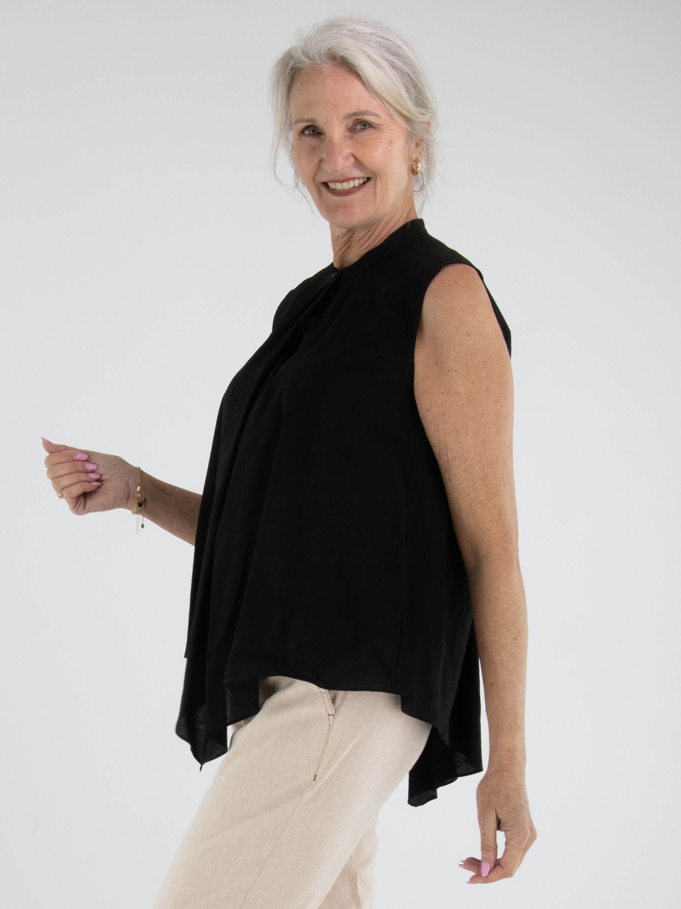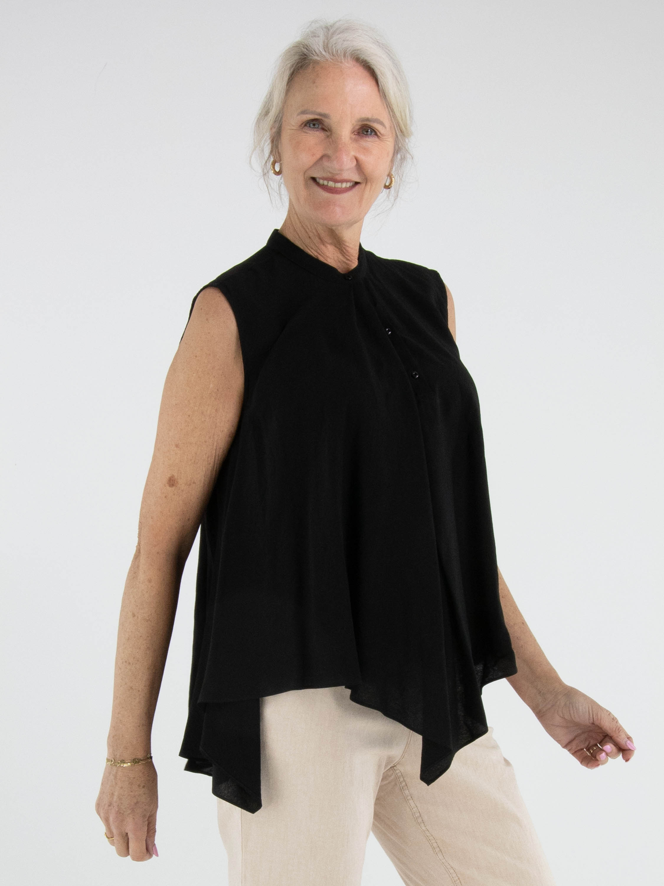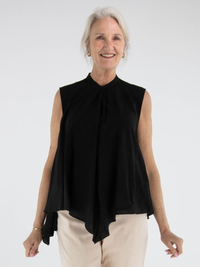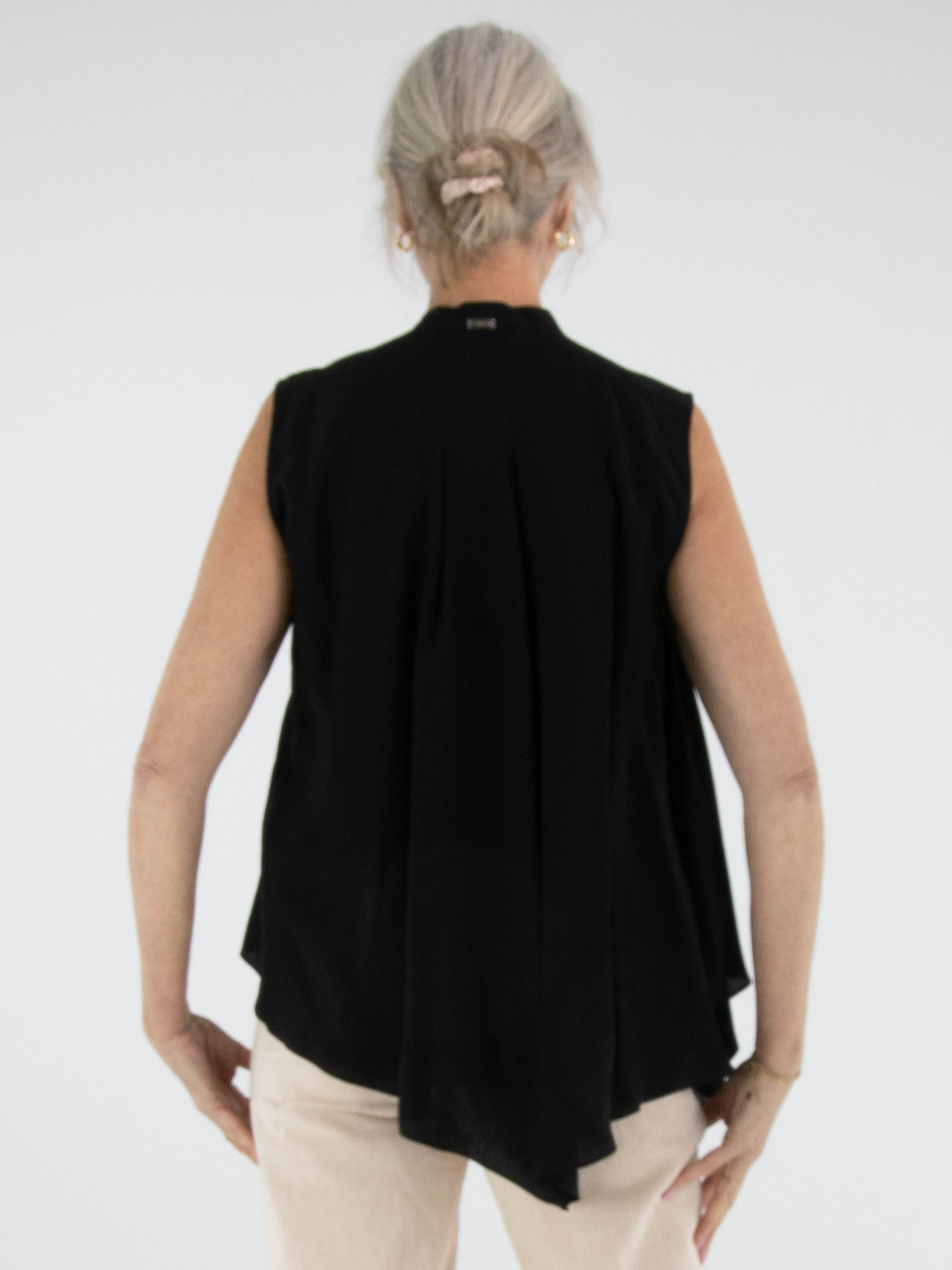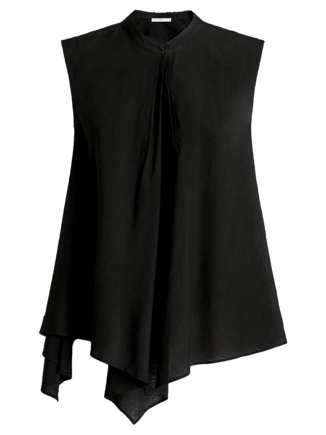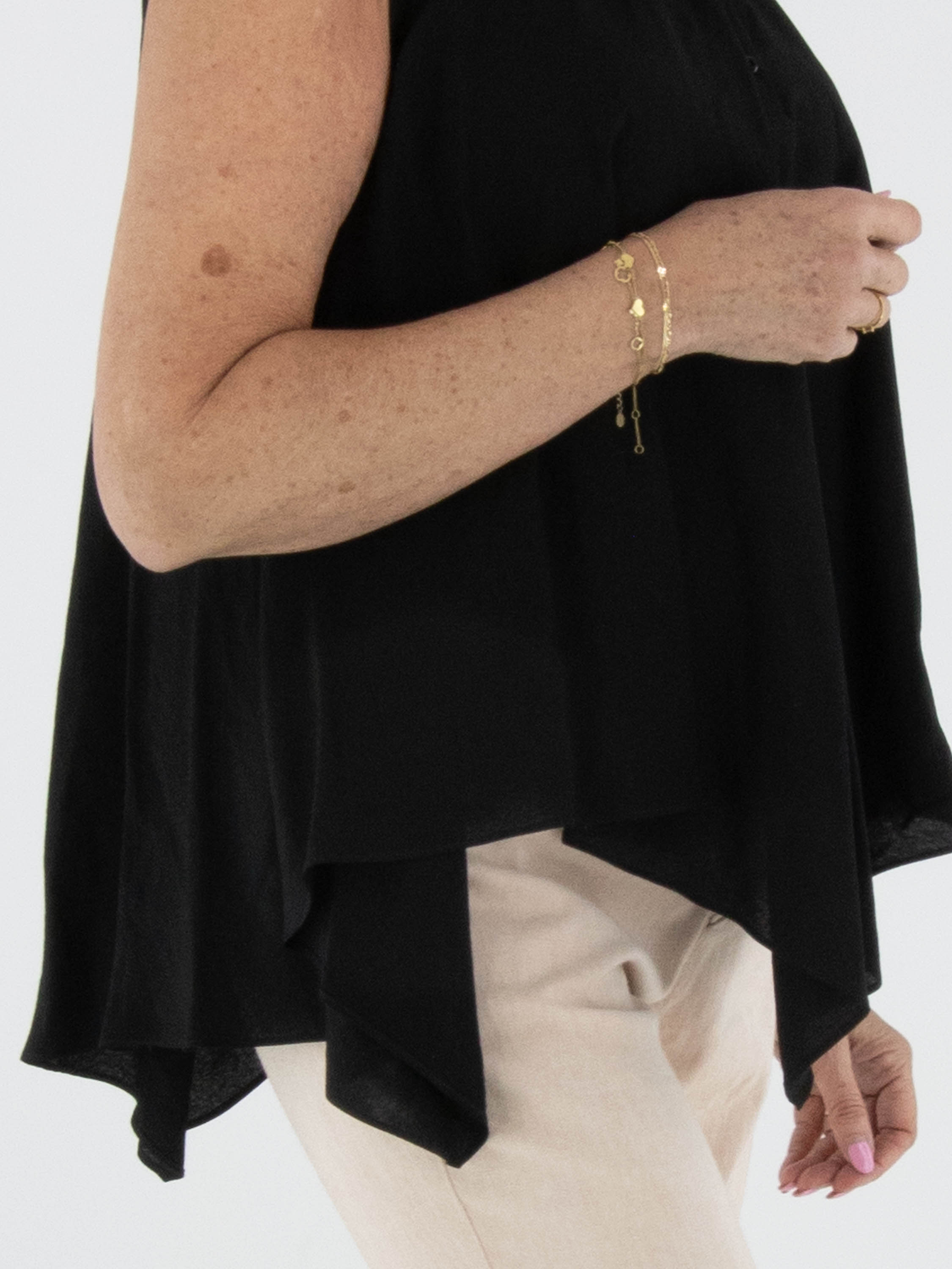 Een top van High in de kleur zwart. In het midden van de ronde hals aan de voorzijde bevindt zich een knoopsluiting tot boven de buste. Over de knoopsluiting loopt een overslag met een plooieffect naar de rechterzijde van de top. De achterzijde is iets langer dan de voorzijde. Deze top mag op de hand worden gewassen.