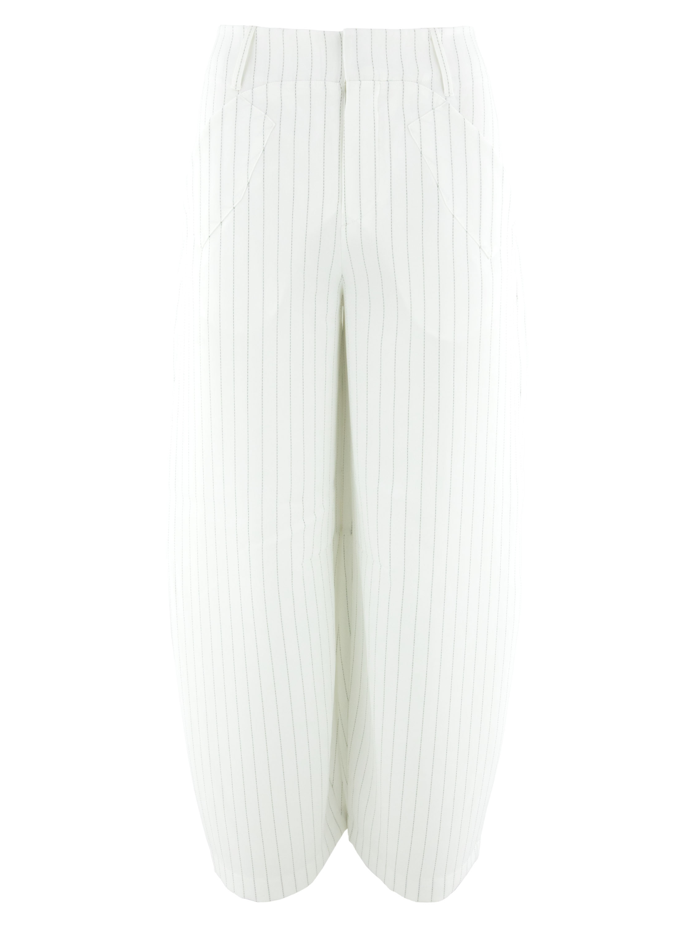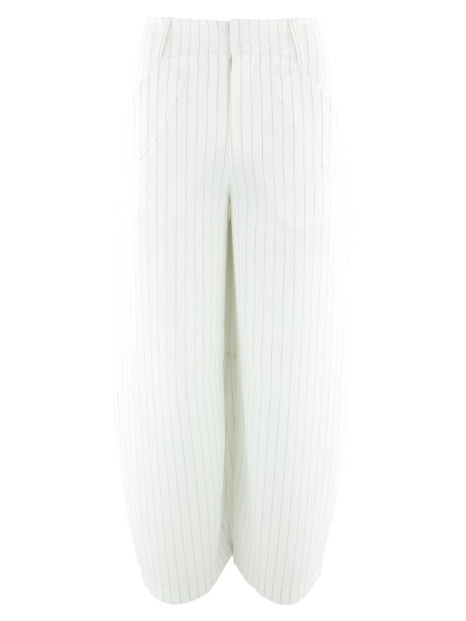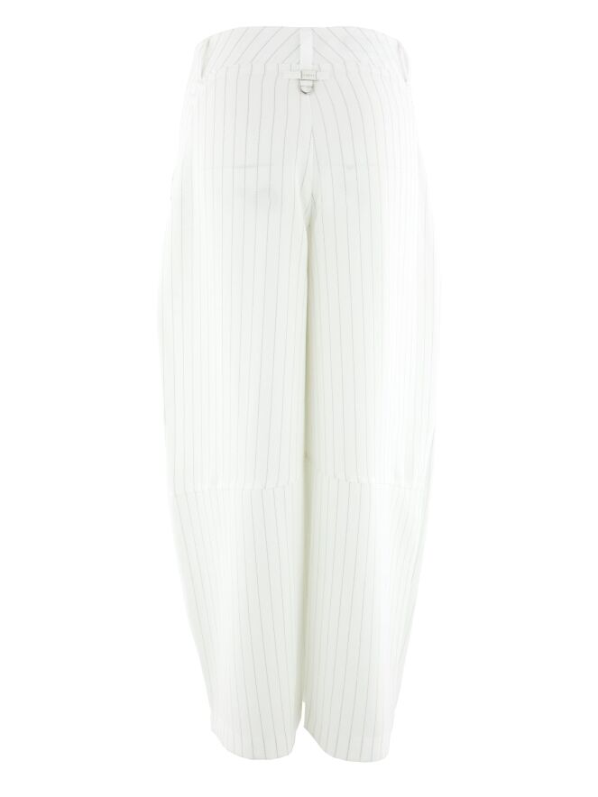 Een krijtstreepbroek van High Tech in een roomwitte kleur met zwarte stiknaden. Bij de knie is een horizontale stiknaad. De broek heeft steekzakken waarvan de randen diagonaal zijn gesneden. Deze broek mag op de hand worden gewassen.