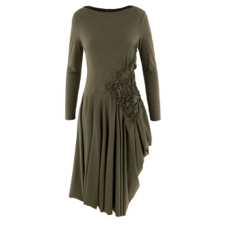 Een rok van High in een grafische print met de kleuren olijfgroen, okergeel en zwart. In de taille is een elastieken band. Aan de achterkant is aan de linker zijde een verticale fijn geplooide stiknaad vanaf kniehoogte naar beneden. Aan de rachter zijkant is vanuit de taille een rits en aan de linker zijde een steekzak. Deze rok mag op de hand worden gewassen.