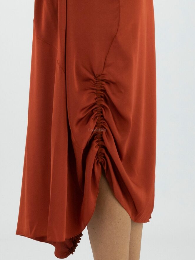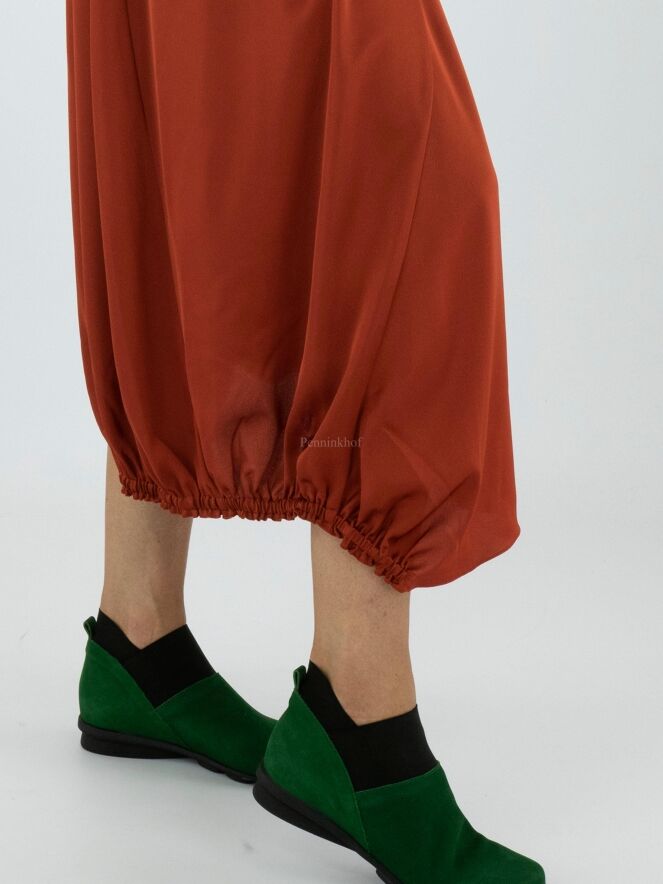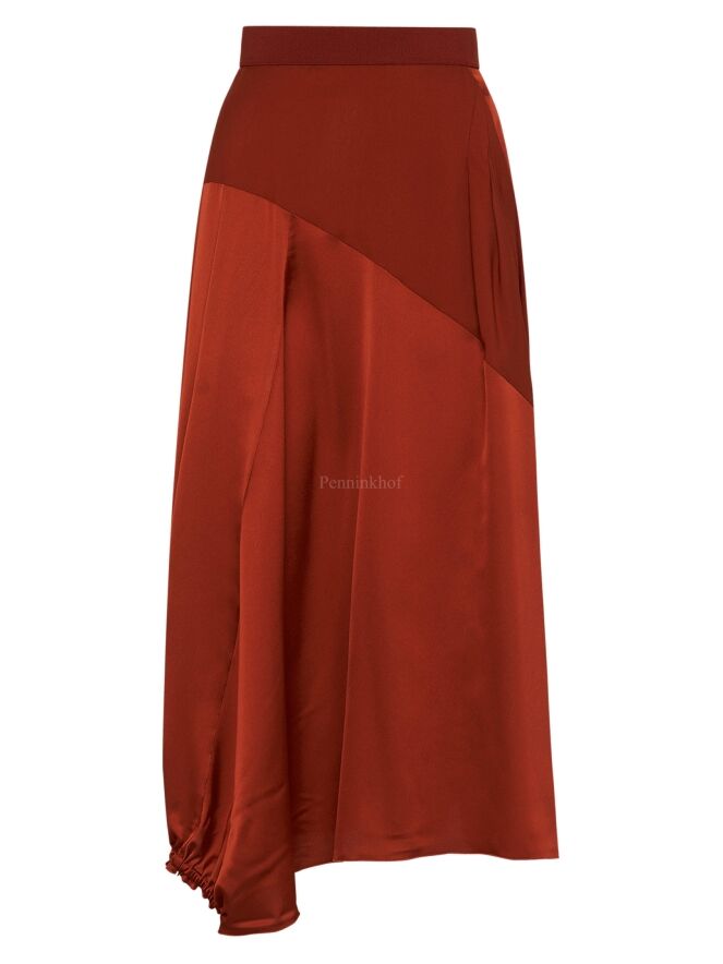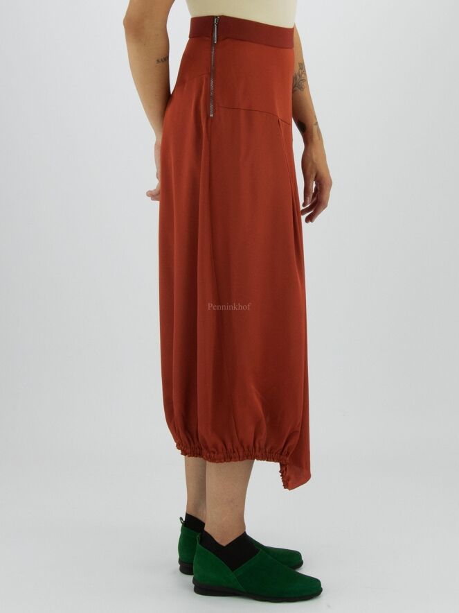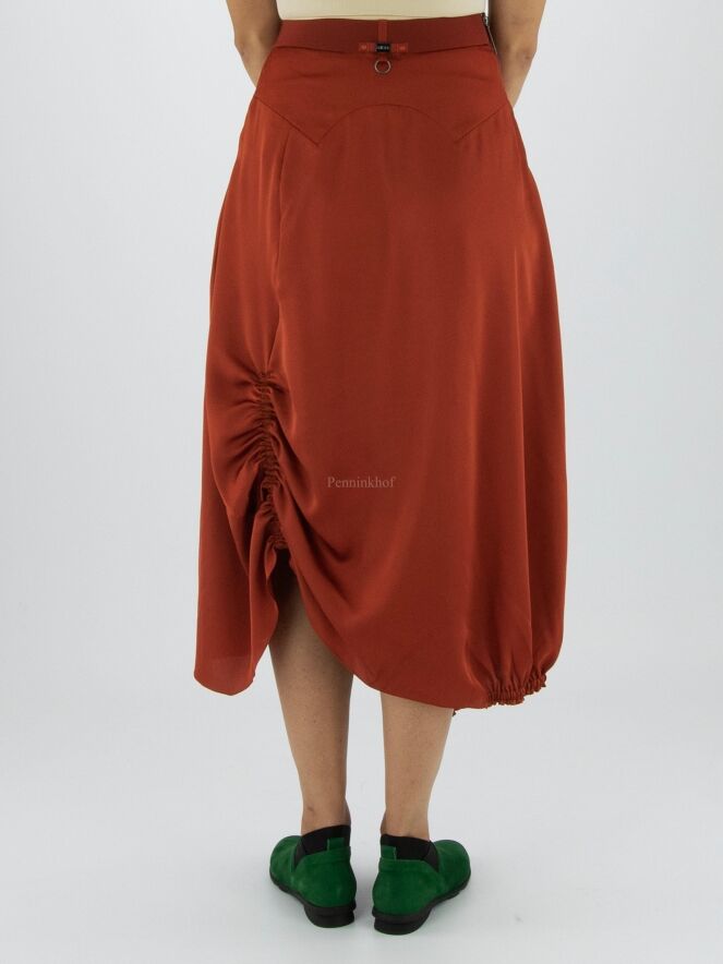 Een rok van High in een roest kleur. In de taille is een elastieken band. Aan de achterkant is aan de linker zijde een verticale fijn geplooide stiknaad vanaf kniehoogte naar beneden. Aan de rachter zijkant is vanuit de taille een rits en aan de linker zijde een steekzak. Deze rok mag op de hand worden gewassen.