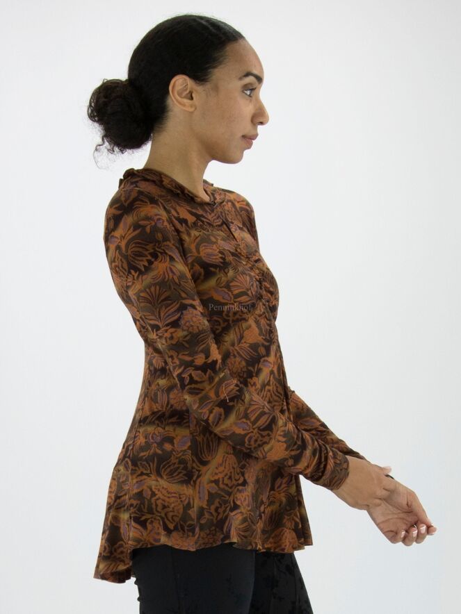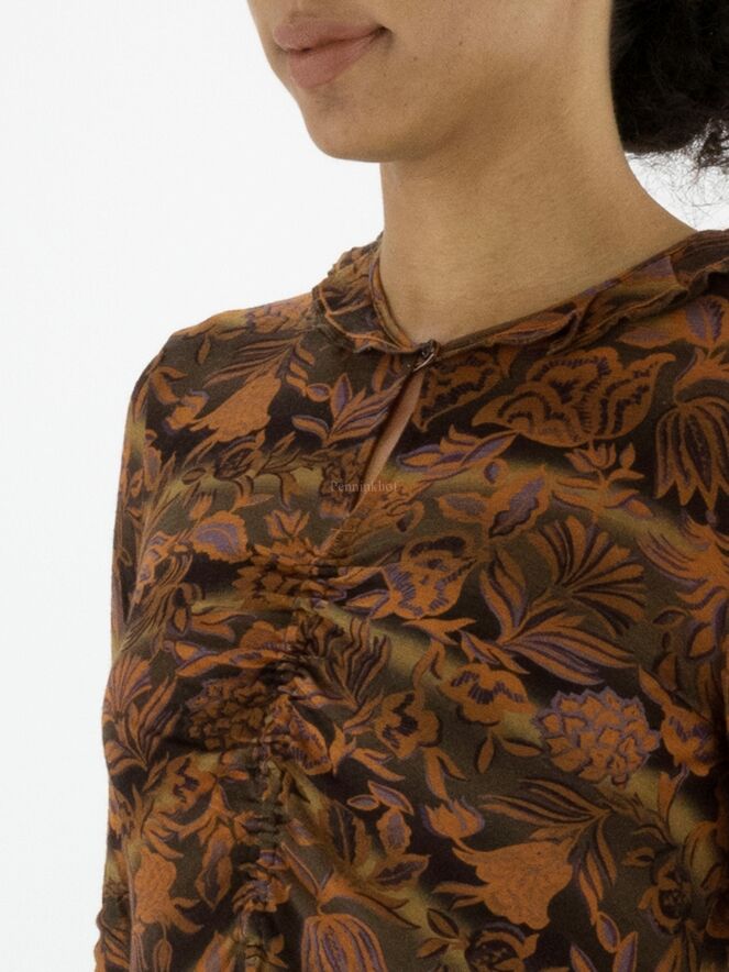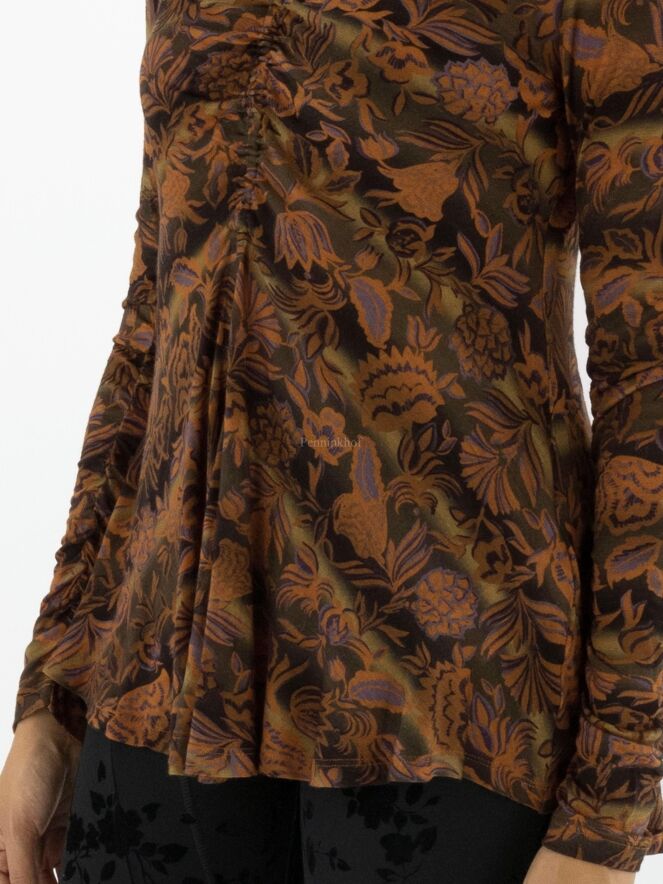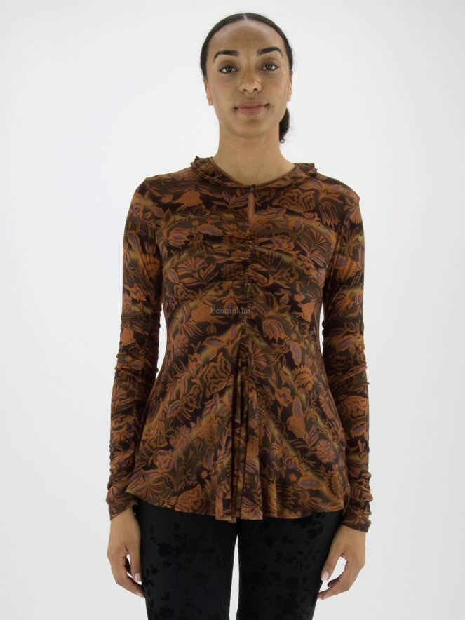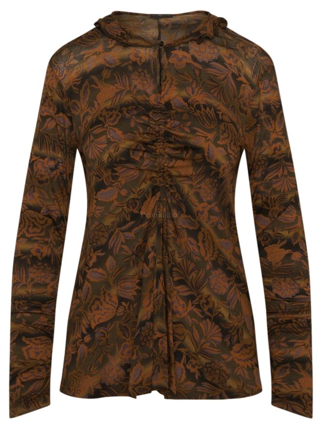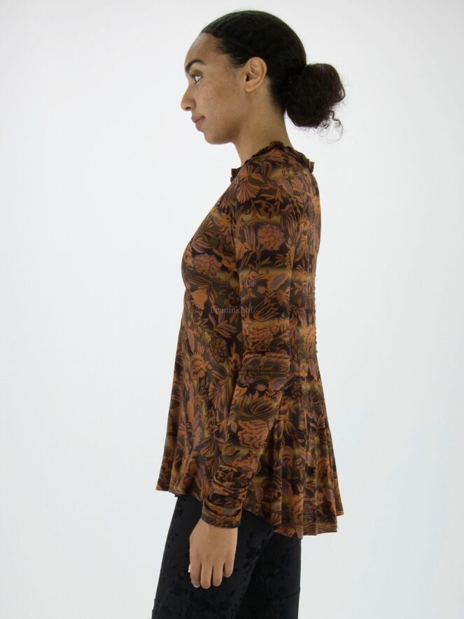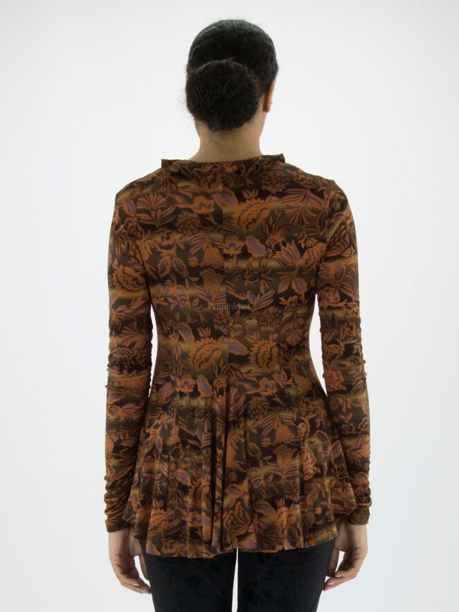 Een shirt van High in een bloemenprint met meerdere tinten groen en oranje met paarse details. Het shirt heeft een ronde hals met een korte ronde kraag die op enkele plaatsen is geplooid. De naden aan de onderzijde van de lange mouwen zijn fijn geplooid. Vanuit de taille heeft het shirt een A - Lijn. Dit shirt mag op de hand worden gewassen.