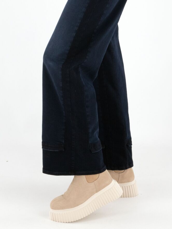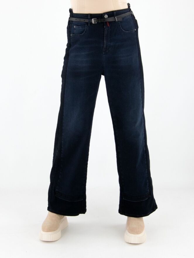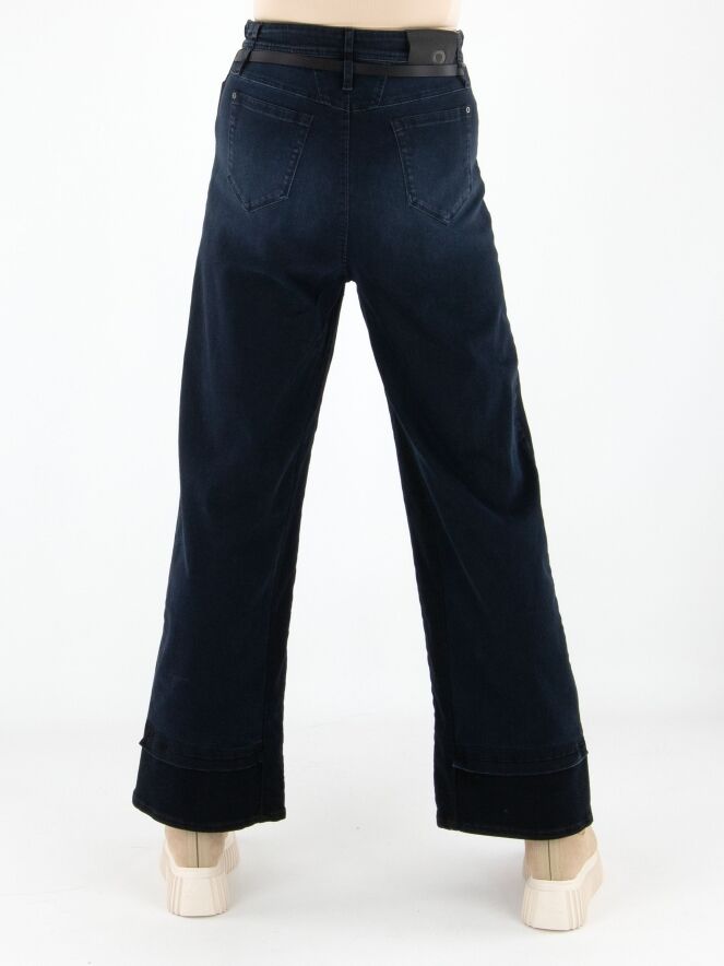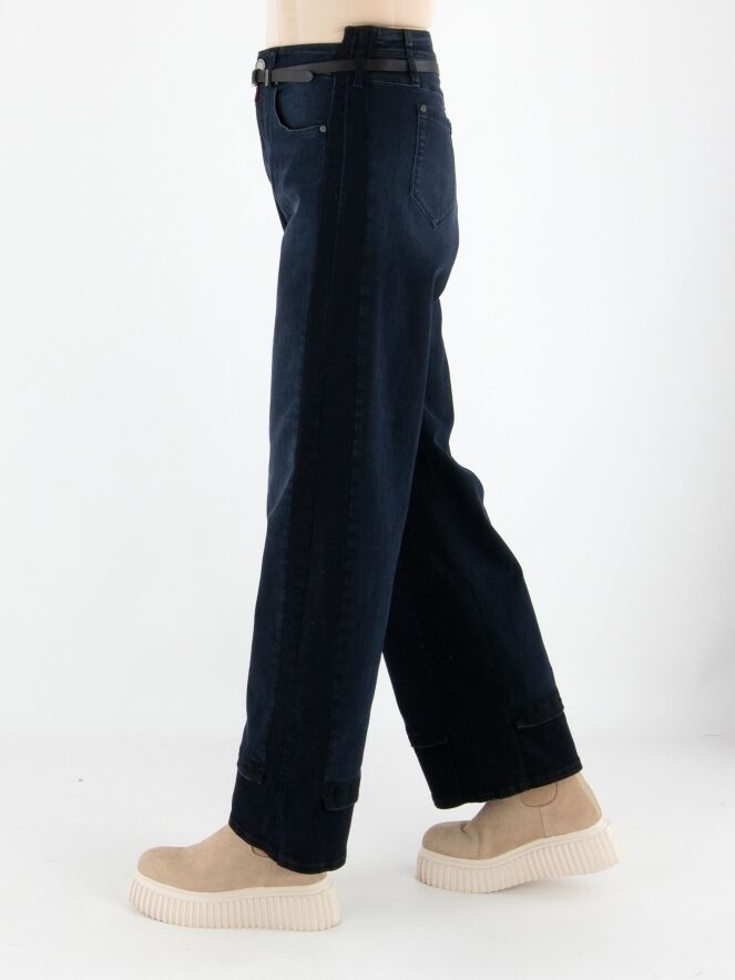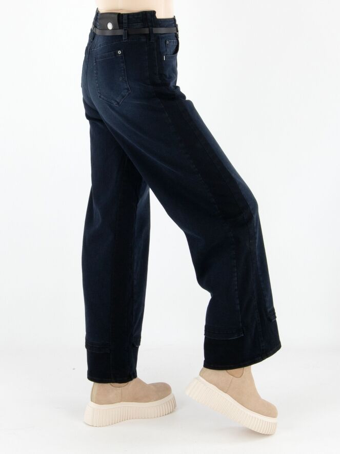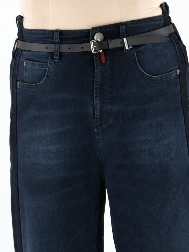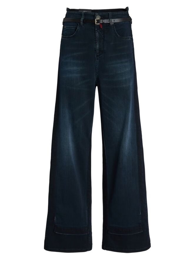 Een hooggesloten, wijde jeans van High in een donkere denimkleur. In de taille is de jeans voorzien van een smalle zwarte leren ceintuur. Het model is uitgevoerd in een klassiek 5-pocket design. Langs de binnen- en buitenzijden van de pijpen is de denim donkerder dan in het midden van de voorzijde, wat de jeans een modern schaduweffect geeft. Deze jeans kan op 30 graden worden gewassen.