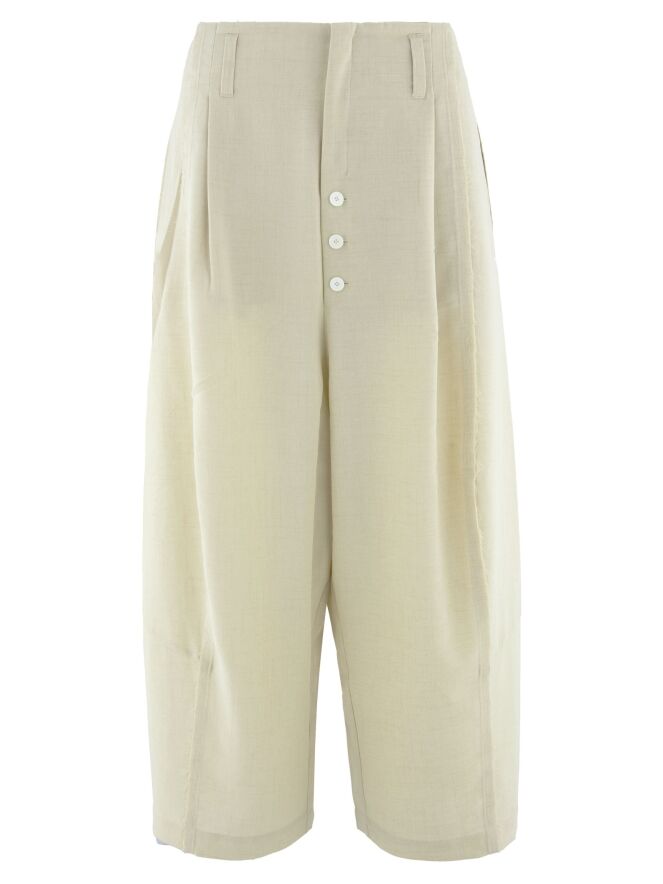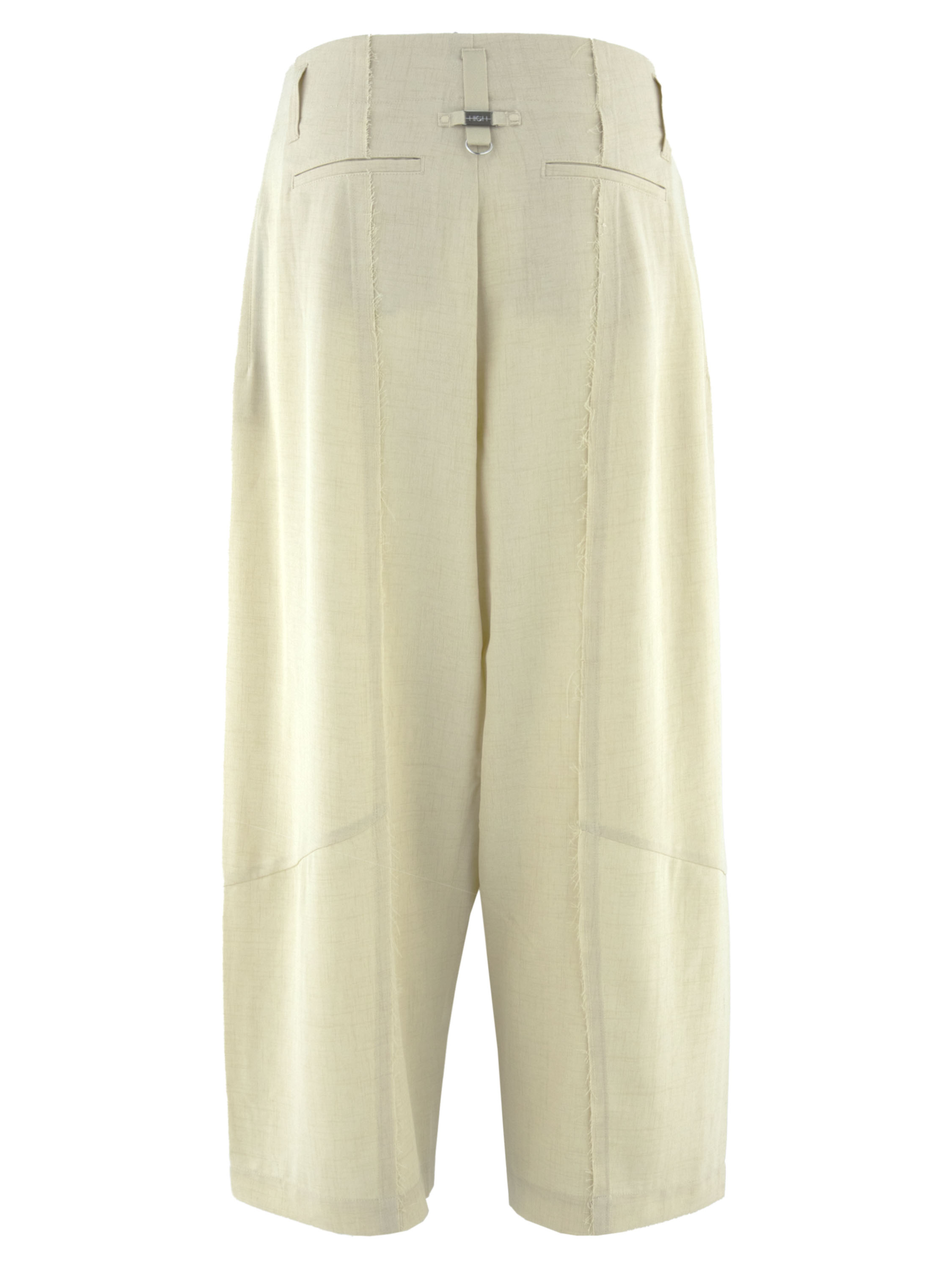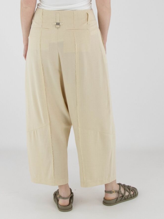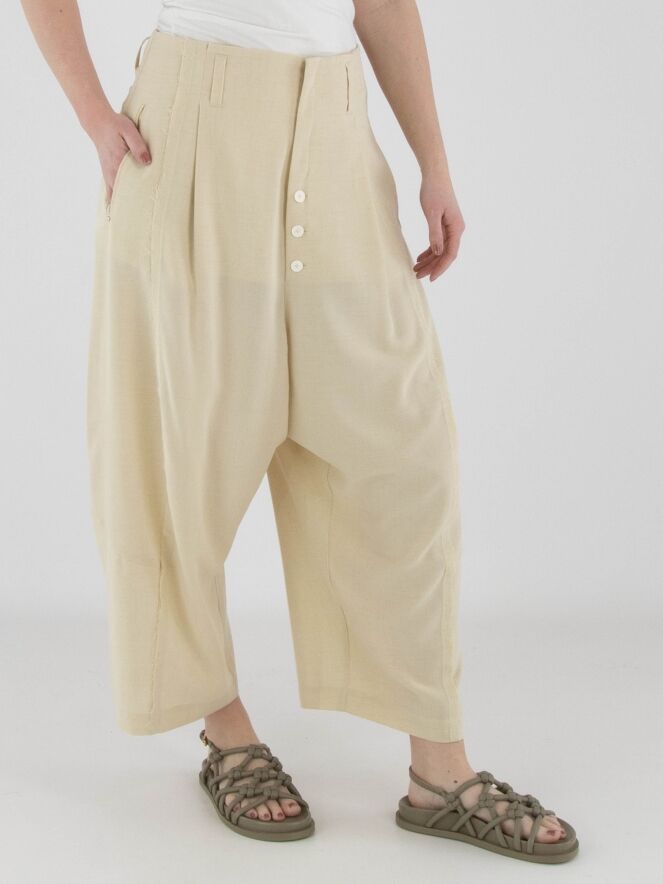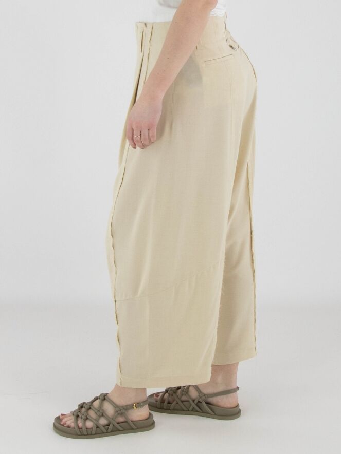 Een wijde broek van High in de kleur zand. De broek heeft een blinde ritssluiting met daaronder knoopsluitingen. De dubbele naad in het midden van de pijpen is langs de rand fijn gerafeld. Vanuit de taille lopen twee bandplooien. De broek heeft steekzakken en kan met de hand worden gewassen.