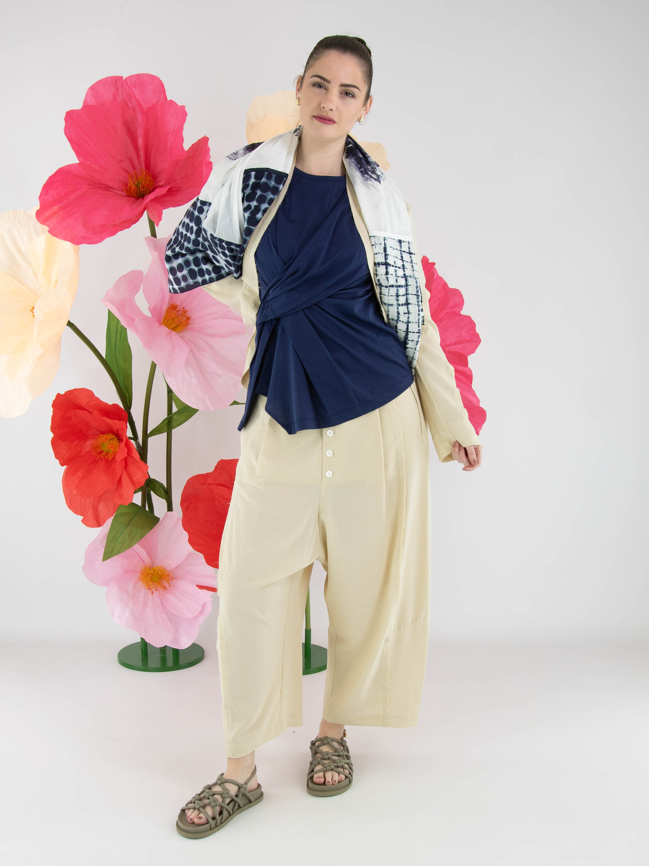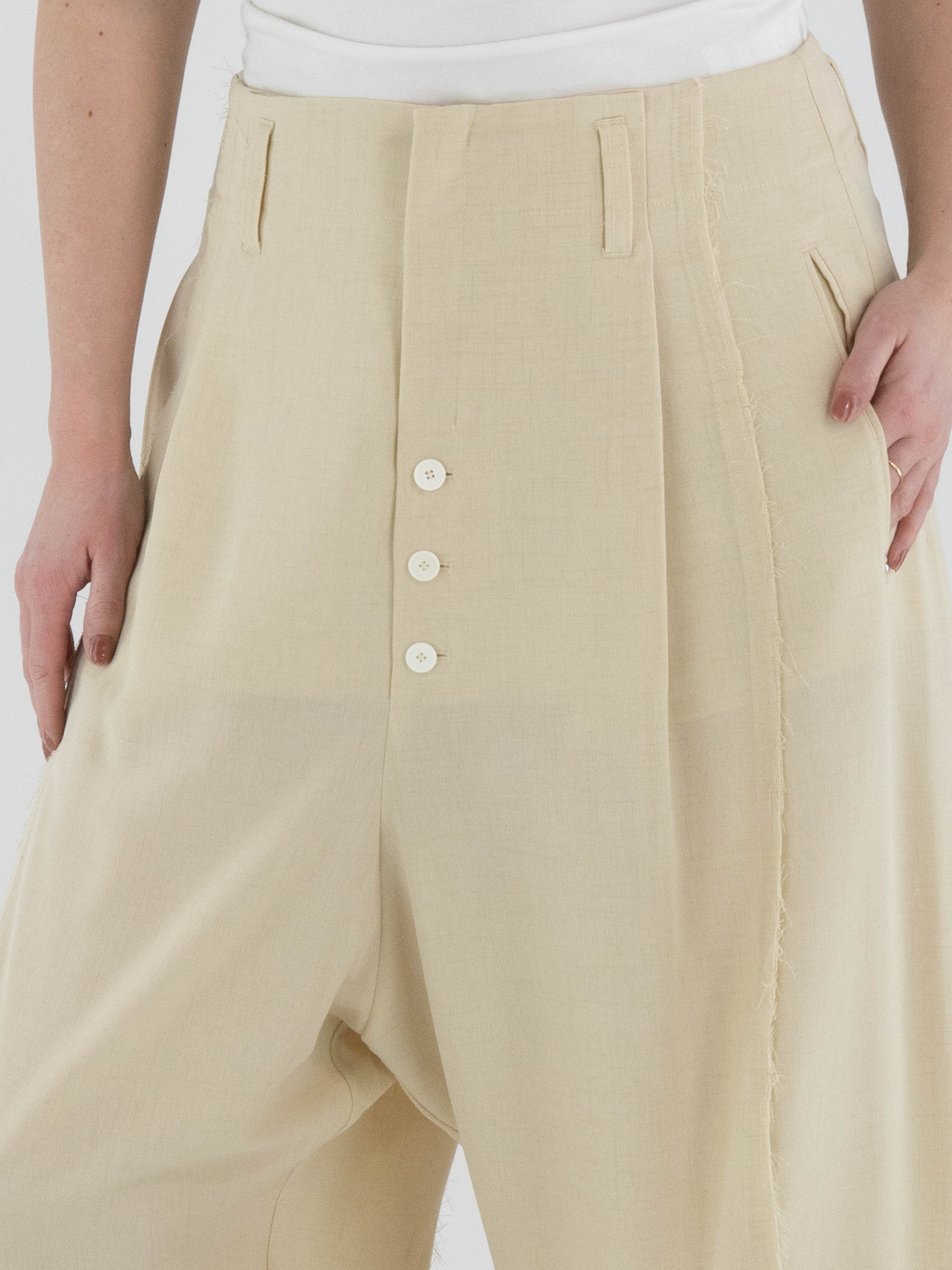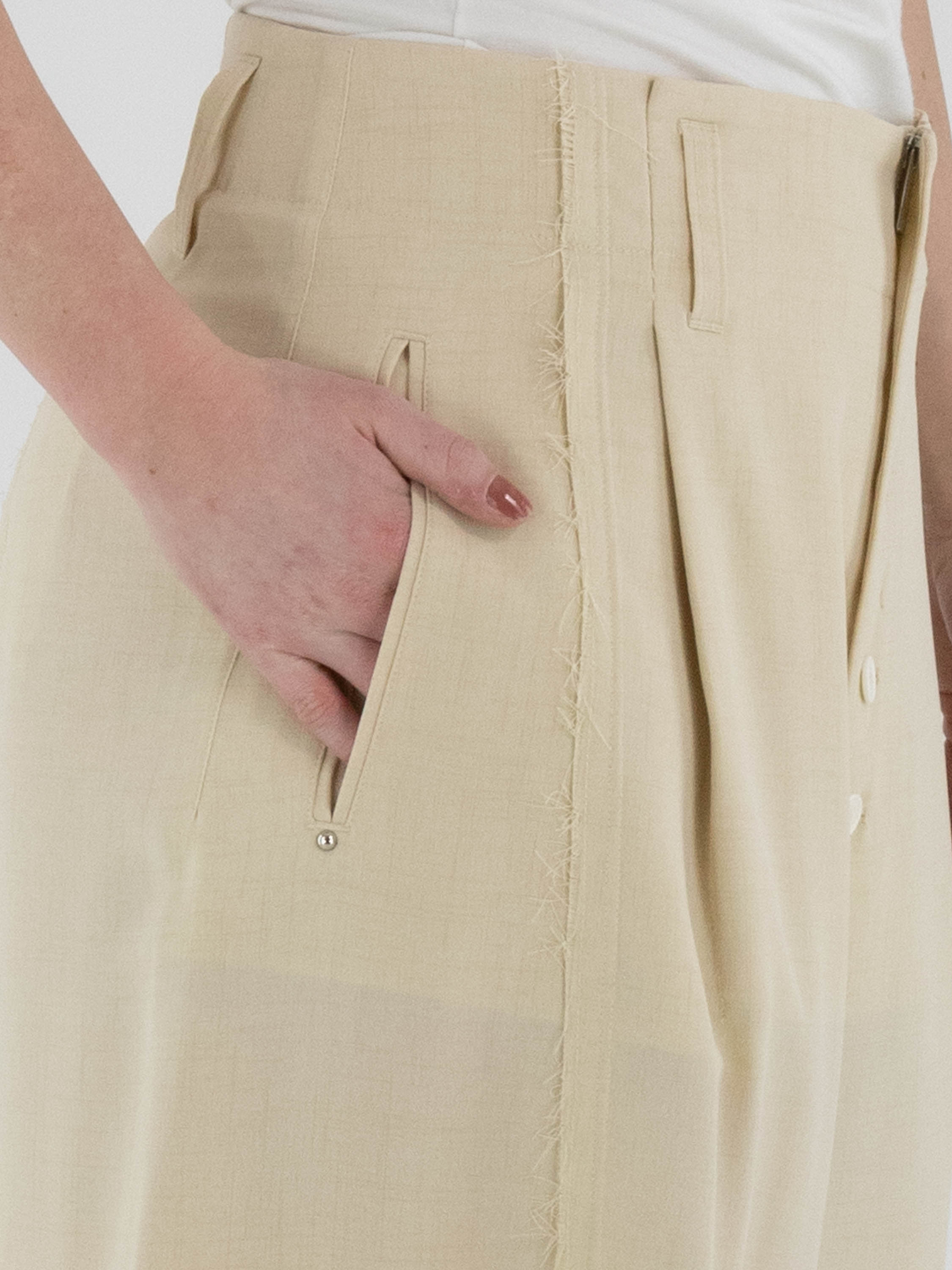 Een wijde broek van High in de kleur zand. De broek heeft een blinde ritssluiting met daaronder knoopsluitingen. De dubbele naad in het midden van de pijpen is langs de rand fijn gerafeld. Vanuit de taille lopen twee bandplooien. De broek heeft steekzakken en kan met de hand worden gewassen.