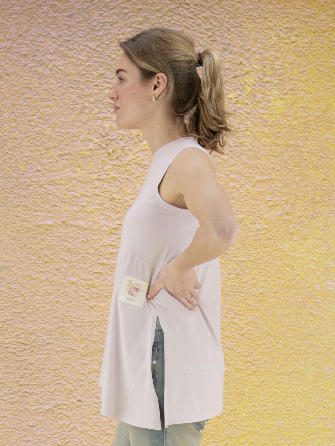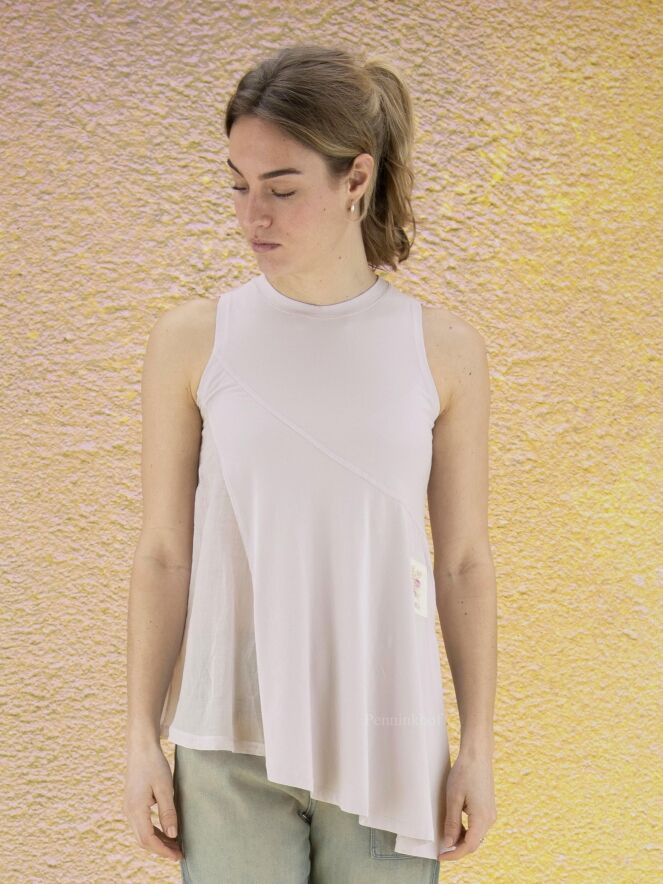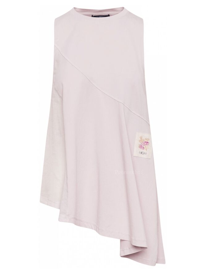 Een top van High in een lila kleur. De linker zijkant is licht transparant. Aan de rechterkant is een diepe split. De onderkant van de top is diagonaal gesneden. Deze top heeft een A - Lijn en mag op de hand worden gewassen.