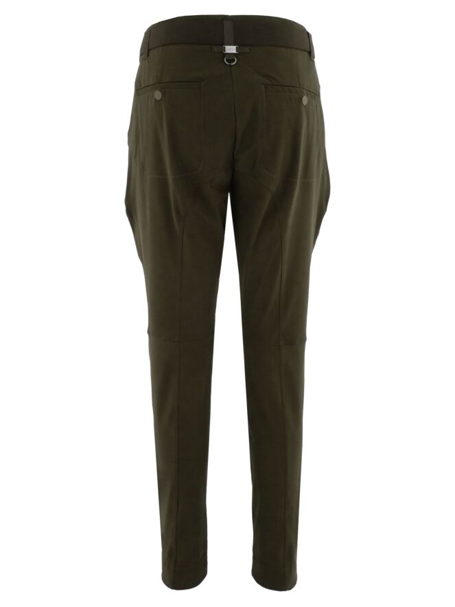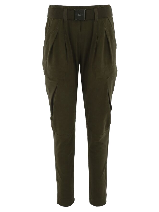 Een broek van High in de kleur olijfgroen. In de taille zit een olijfgroene elastische ceintuur met een rechthoekige zilverkleurige gesp, met daaronder enkele bandplooien. Aan de buitenzijde van het bovenbeen bevindt zich een bandplooi. De broek heeft steekzakken en dient met de hand te worden gewassen.