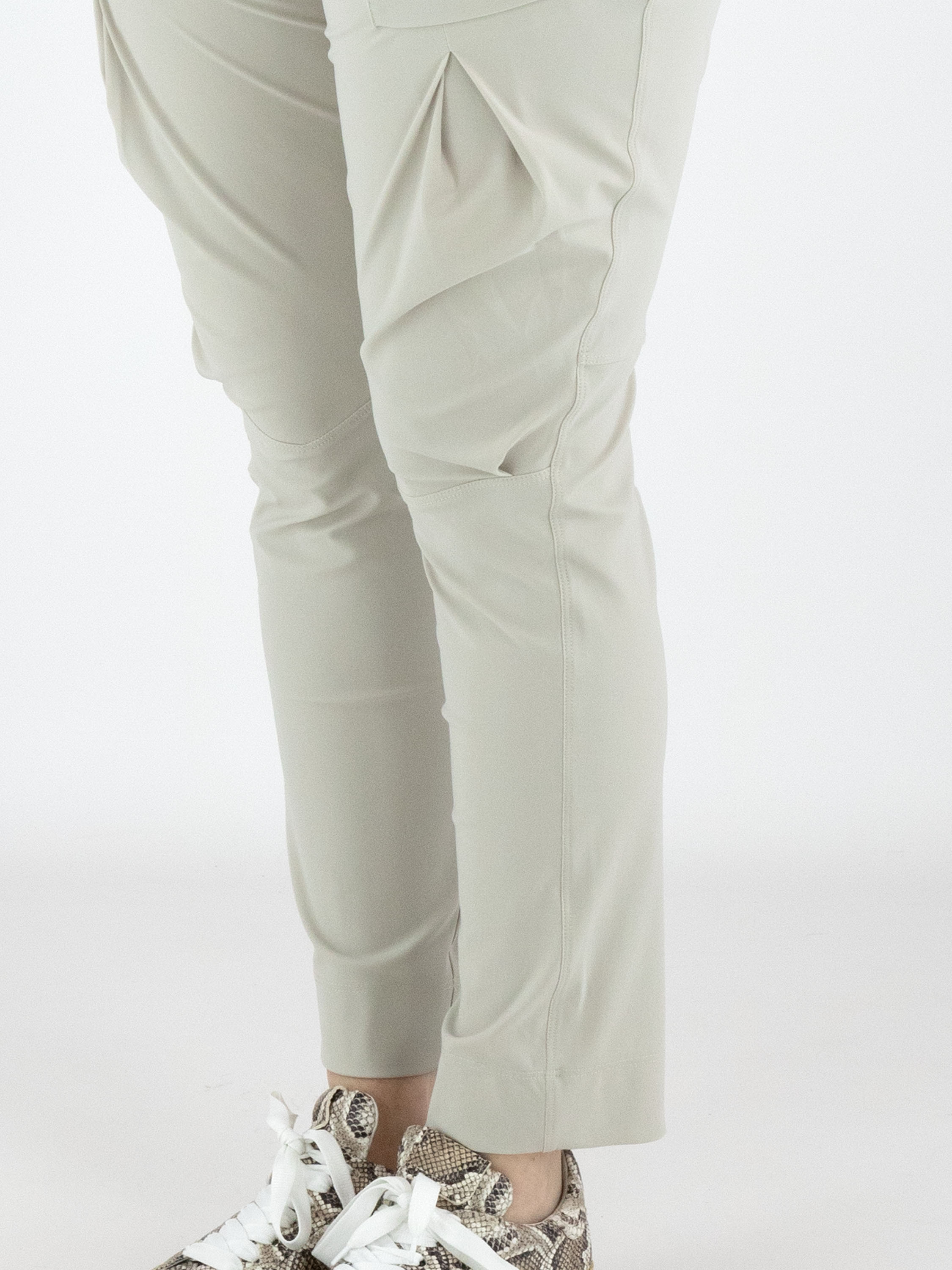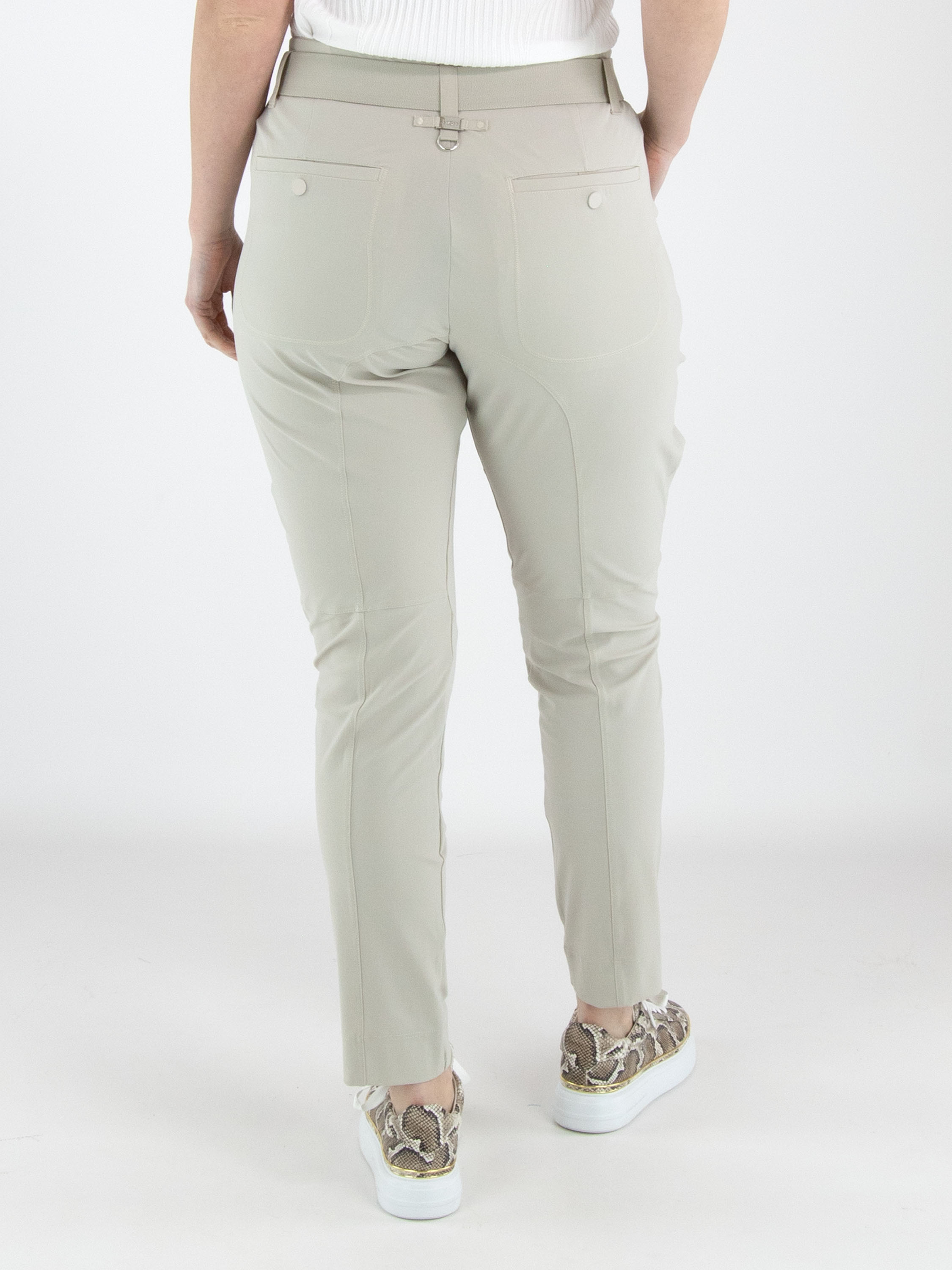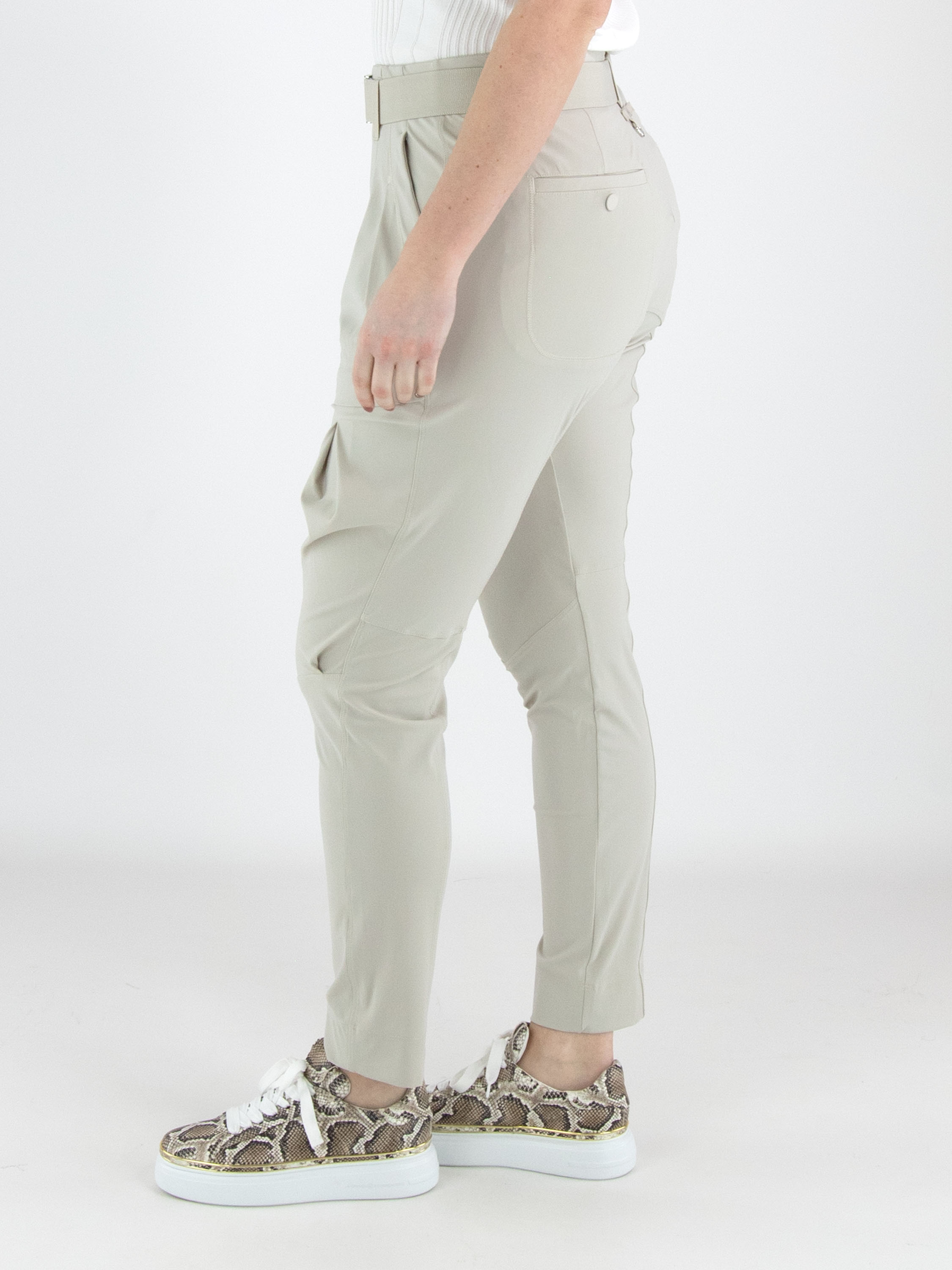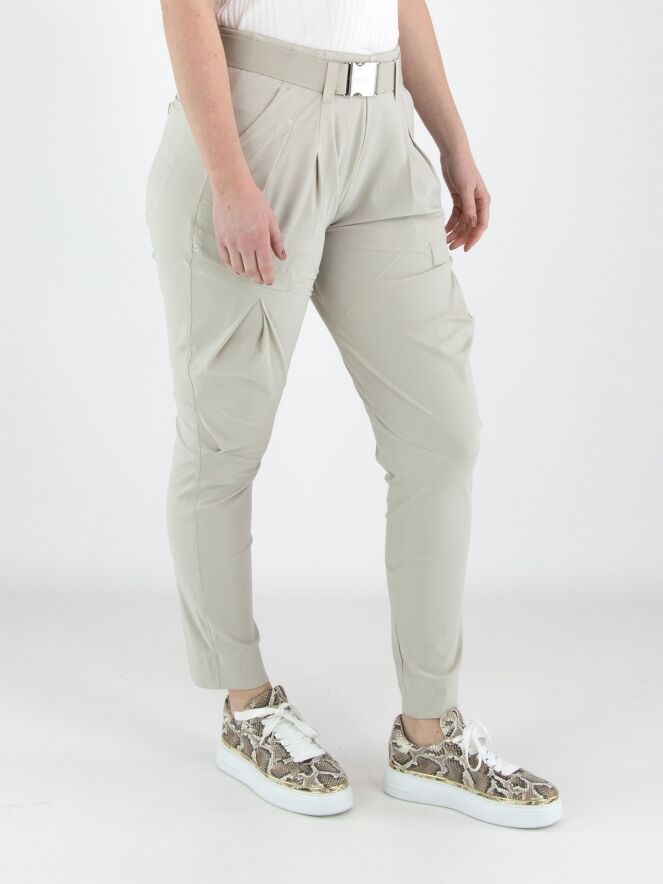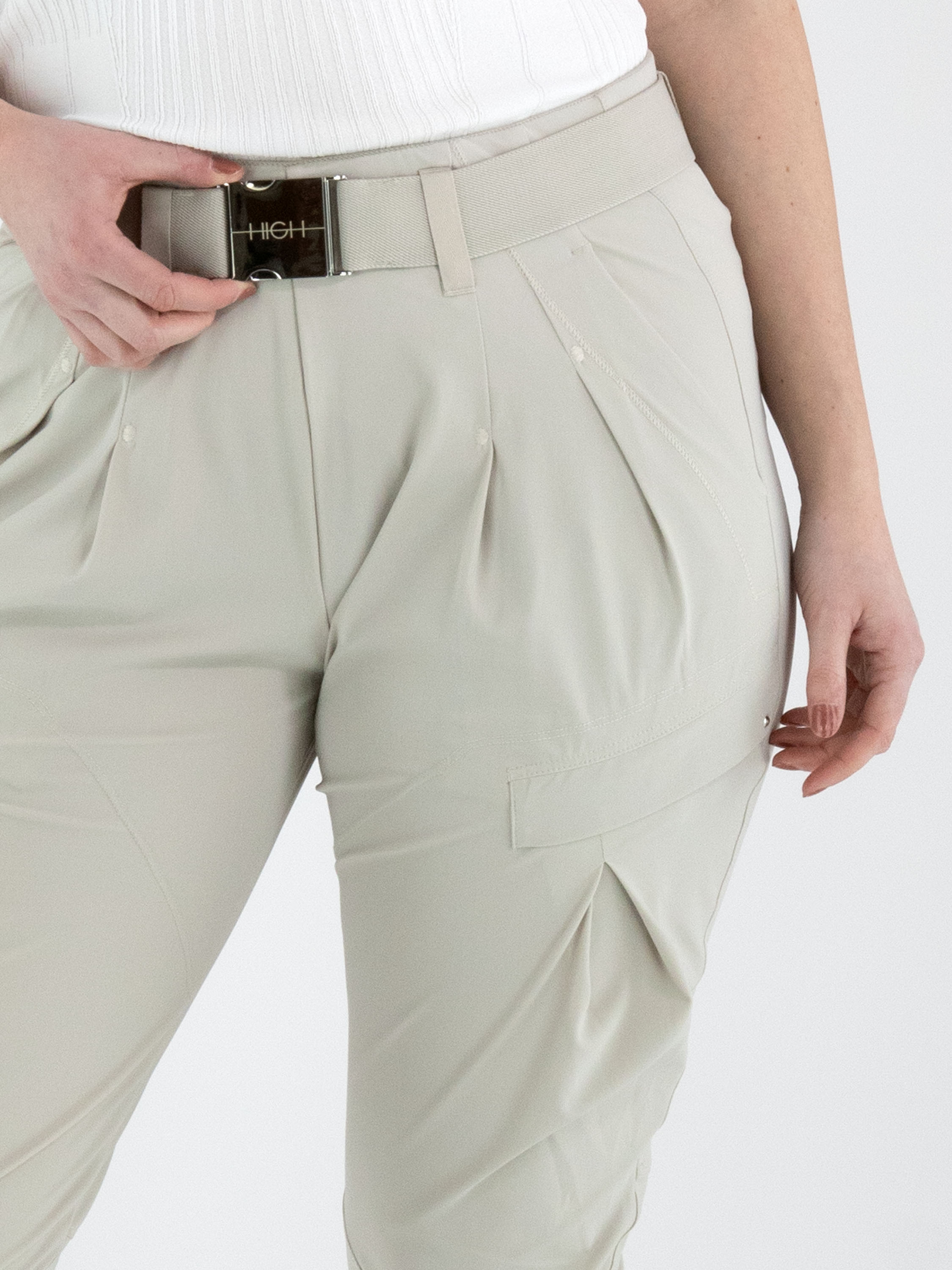 Een broek van High in de kleur kit. In de taille zit een elastische ceintuur met een rechthoekige zilverkleurige gesp, met daaronder enkele bandplooien. Aan de buitenzijde van het bovenbeen loopt eveneens een bandplooi. De broek heeft steekzakken en kan met de hand worden gewassen.