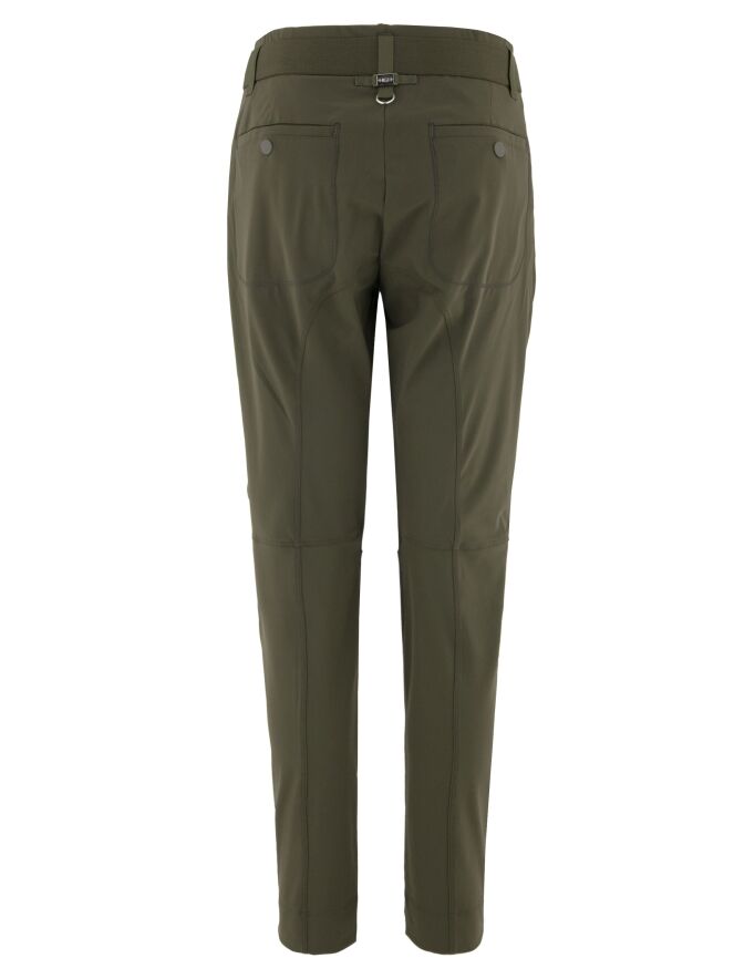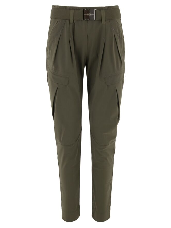 Een broek van High in de kleur olijfgroen. In de taille zit een elastische ceintuur met een rechthoekige zilverkleurige gesp, met daaronder enkele bandplooien. Aan de buitenzijde van het bovenbeen loopt een bandplooi. De broek heeft steekzakken en kan met de hand worden gewassen.