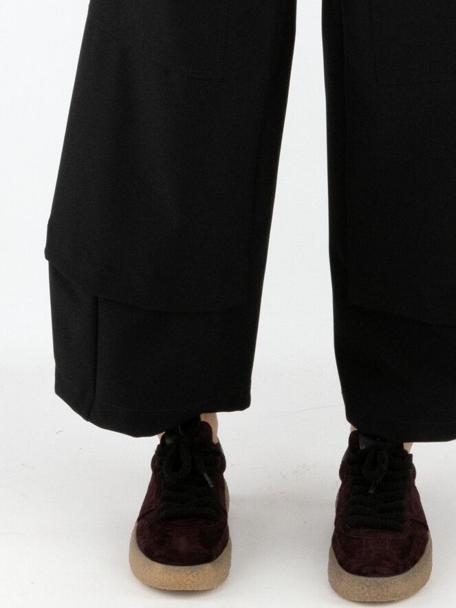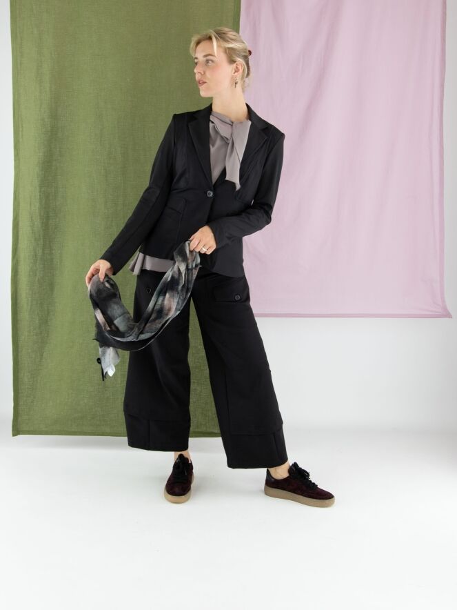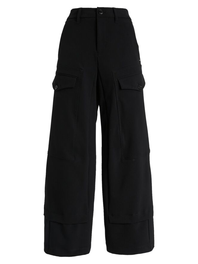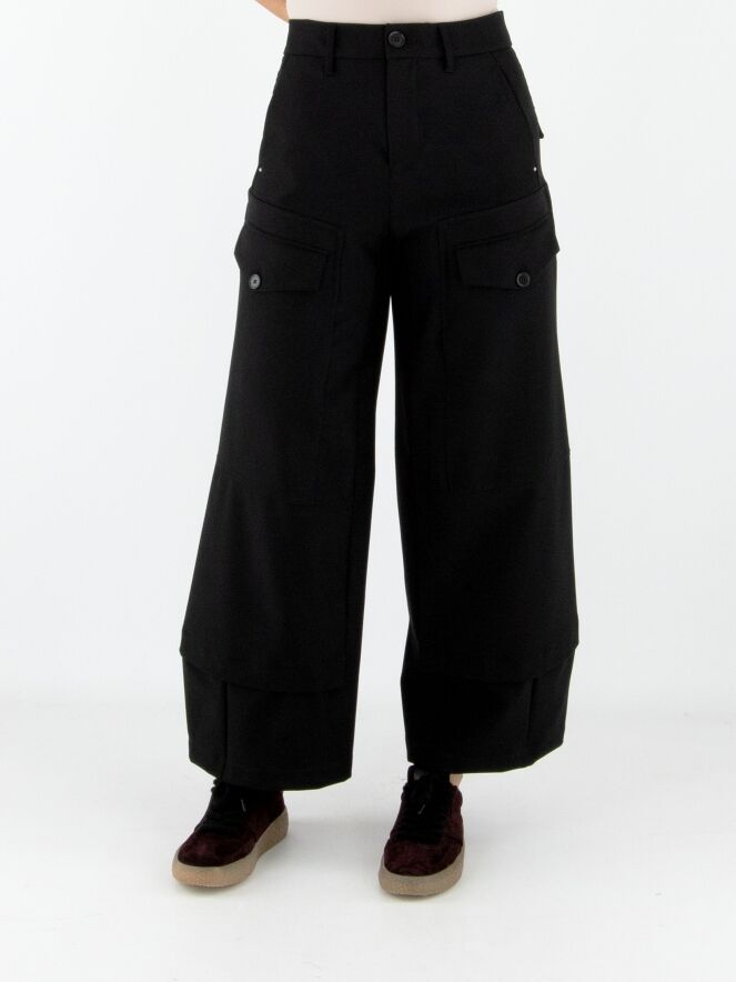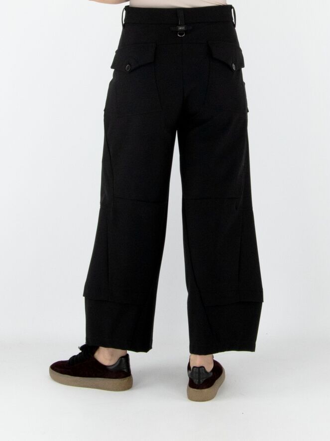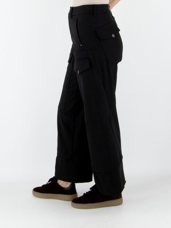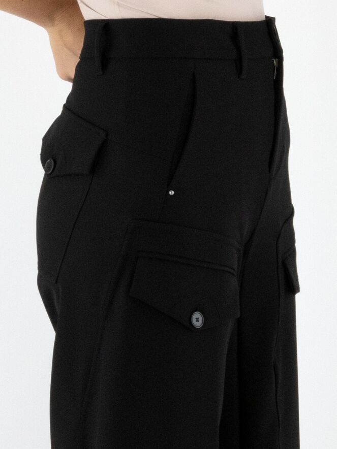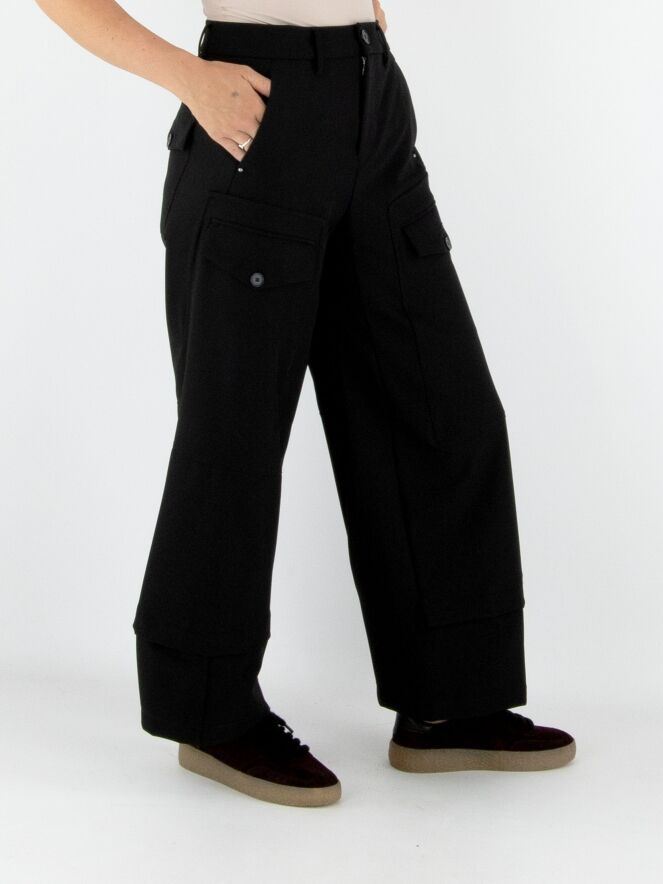 Een broek van High in zwart. Op het bovenbeen zitten twee zakken met een omslag en knoopsluiting. Onder de taille bevinden zich steekzakken. Aan de onderkant van de pijpen is een overslagbies, wat het effect geeft dat er een tweede stof onderuit komt. Deze broek mag op 30 graden worden gewassen.