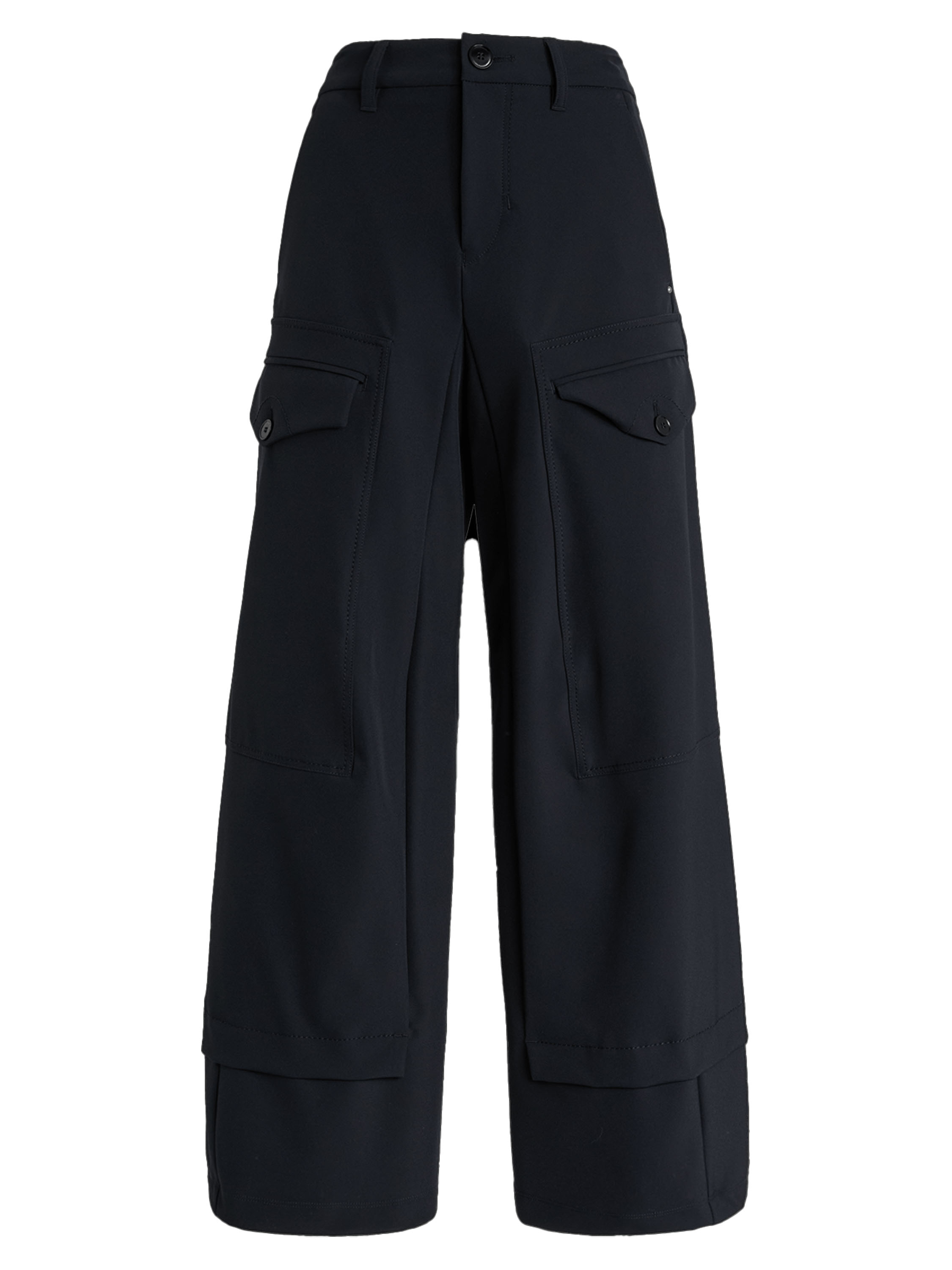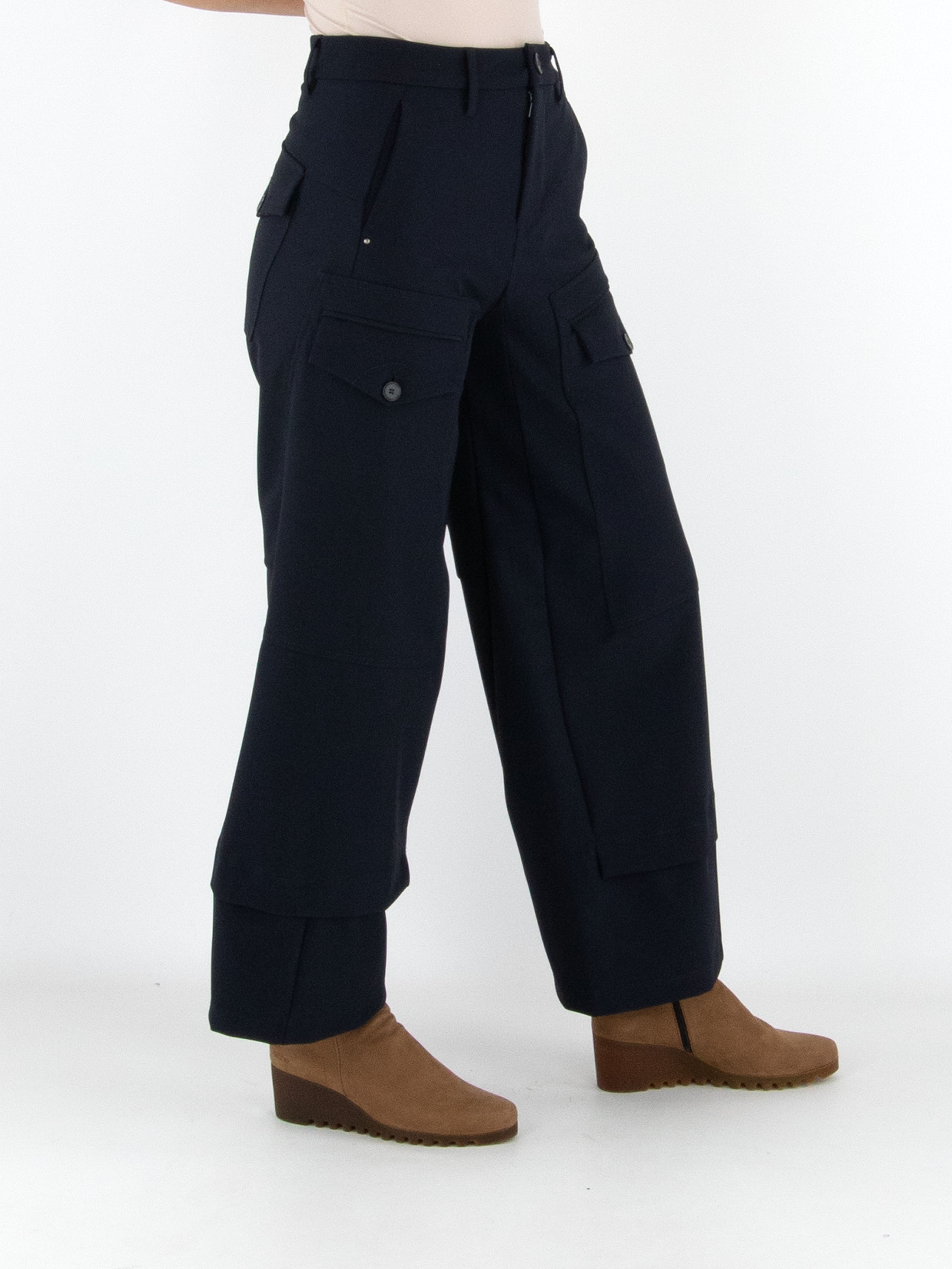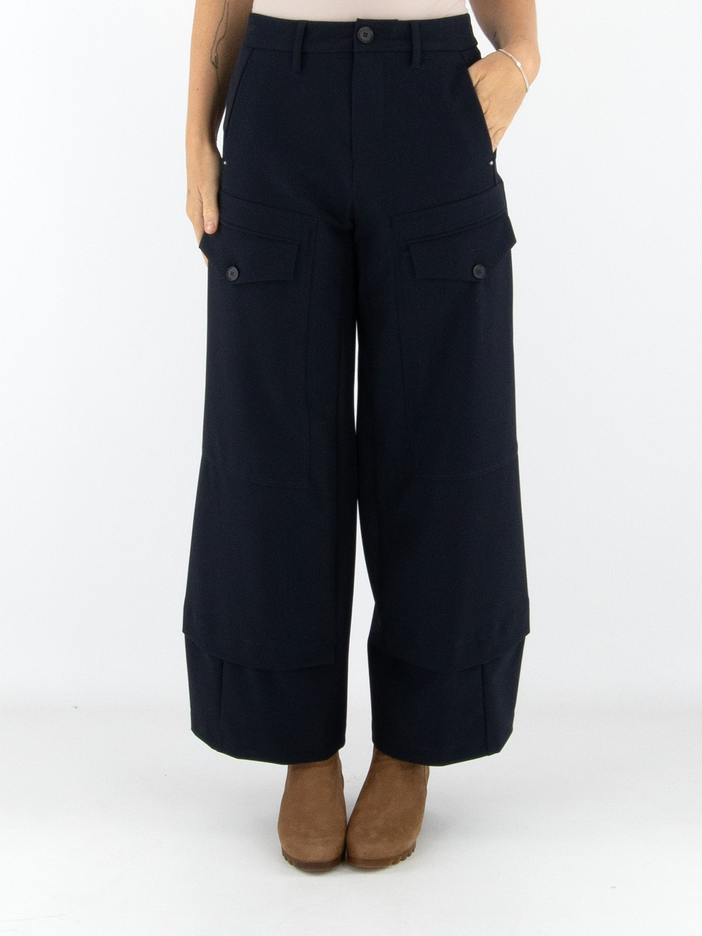 Een broek van High in de kleur marineblauw. Op het bovenbeen zitten twee zakken met een omslag en knoopsluiting, wat de broek een stoere uitstraling geeft. Onder de taille bevinden zich handige steekzakken. Aan de onderkant van de pijpen is een overslagbies verwerkt, waardoor het lijkt alsof er een tweede laag stof onderuit komt. Deze broek mag op 30 graden worden gewassen.