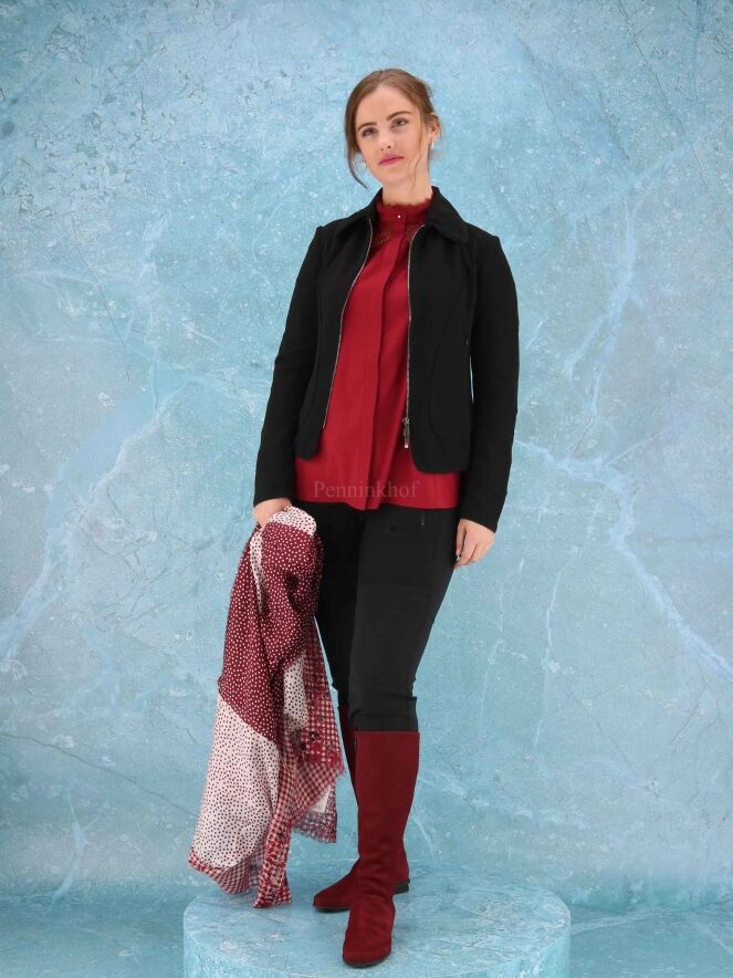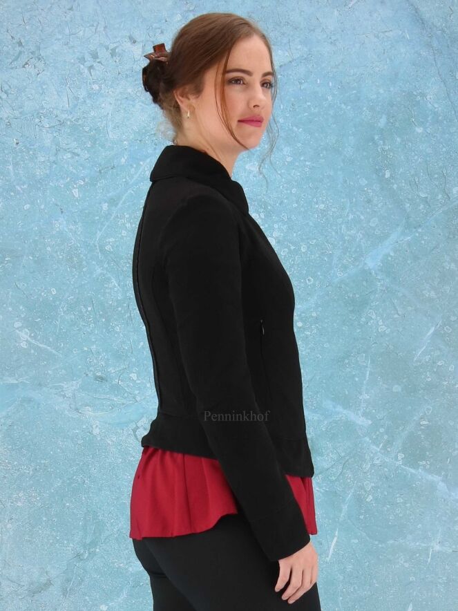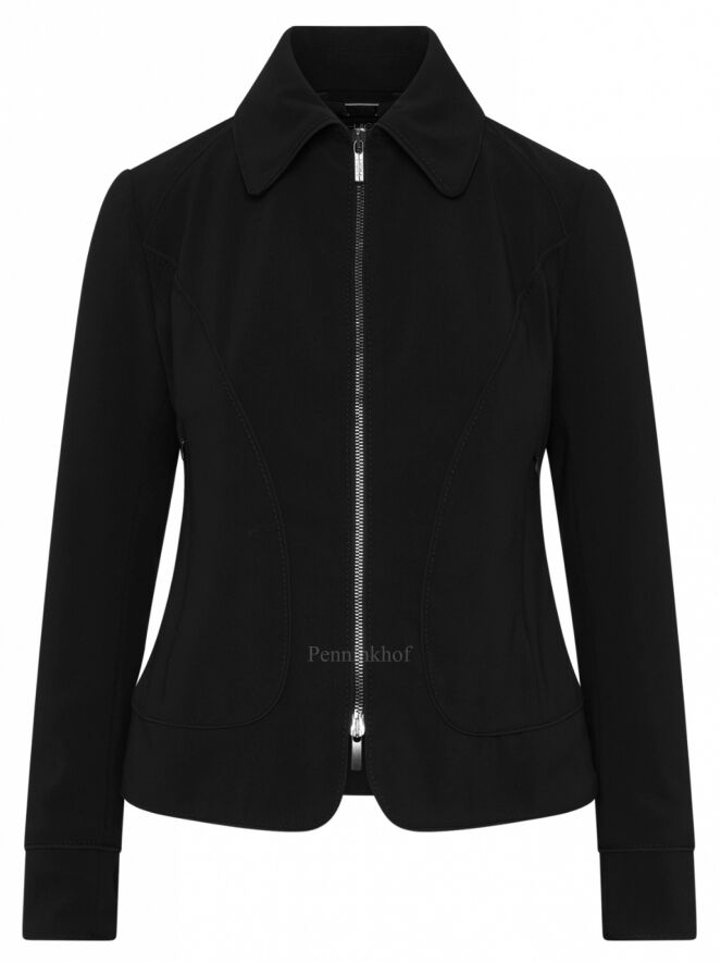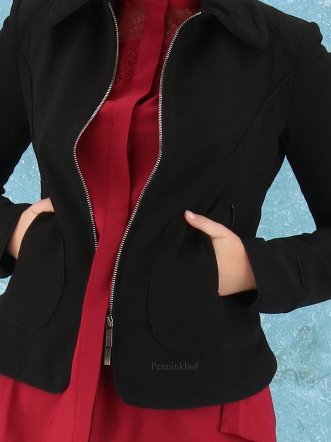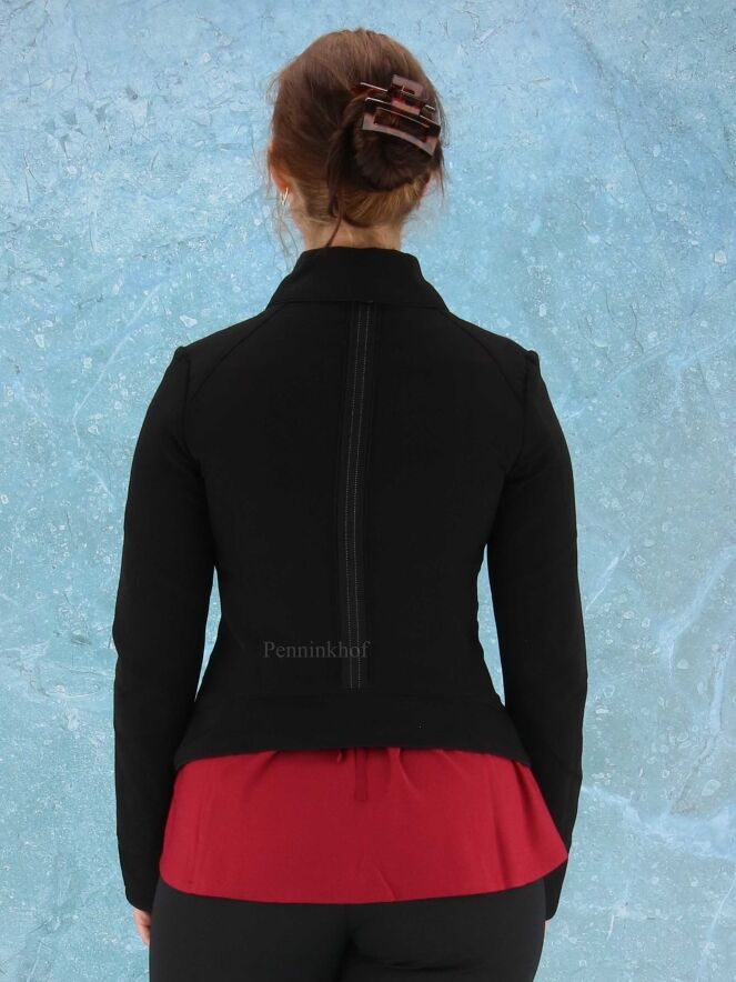 Een korte blazer van High in de kleur zwart. Langs de randen van de kraag, taillenaden en manchetten zijn "ton sur ton" biezen in de kleur zwart. De zakken hebben een verborgen ritssluiting. Aan de achterkant is in het midden van de blazer een verticale bies met 2 witte stikdraden. Deze blazer mag op de hand worden gewassen.