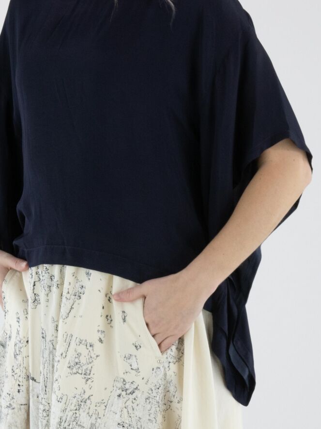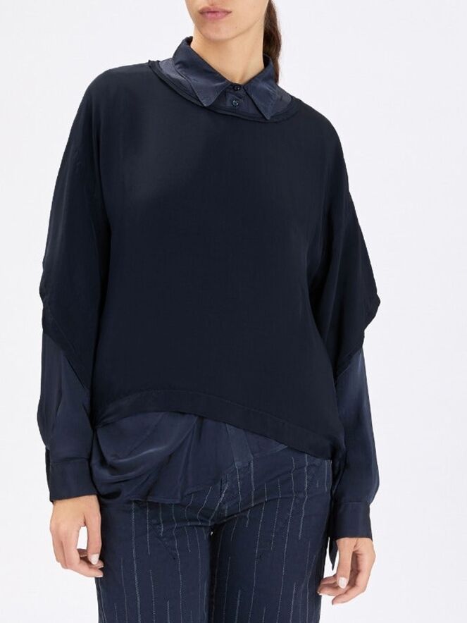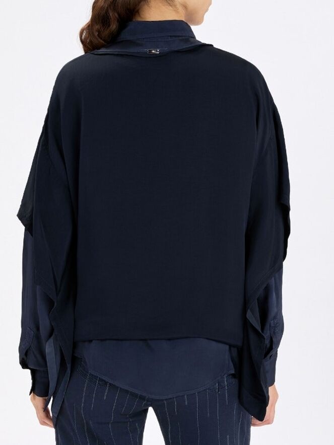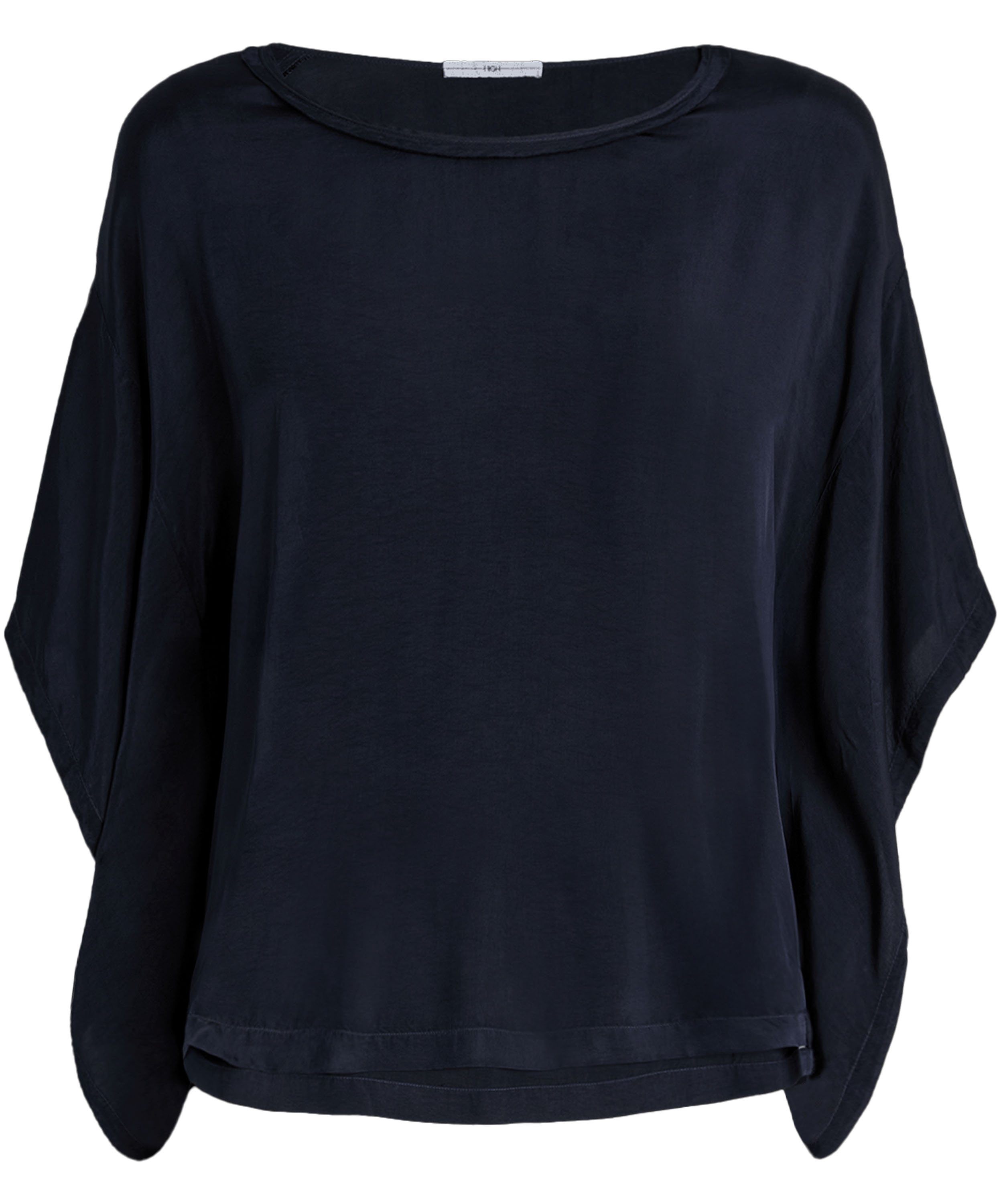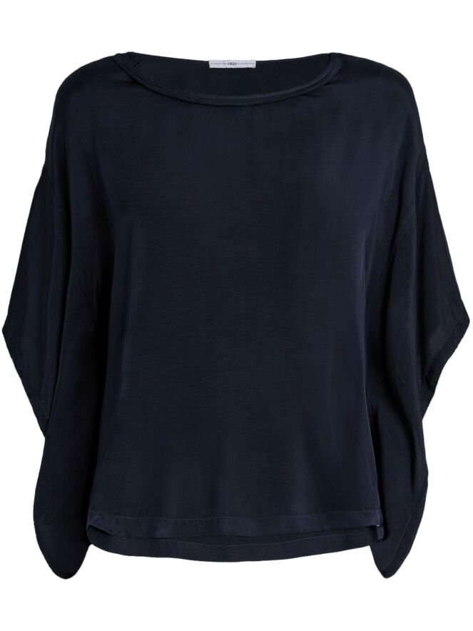 Mat satijnen shirt van High in de kleur marineblauw. Het shirt heeft een ronde hals en elegante vleermuismouwen, wat zorgt voor een soepele en vrouwelijke uitstraling. Dit exclusieve designer shirt kan op 30 graden worden gewassen.