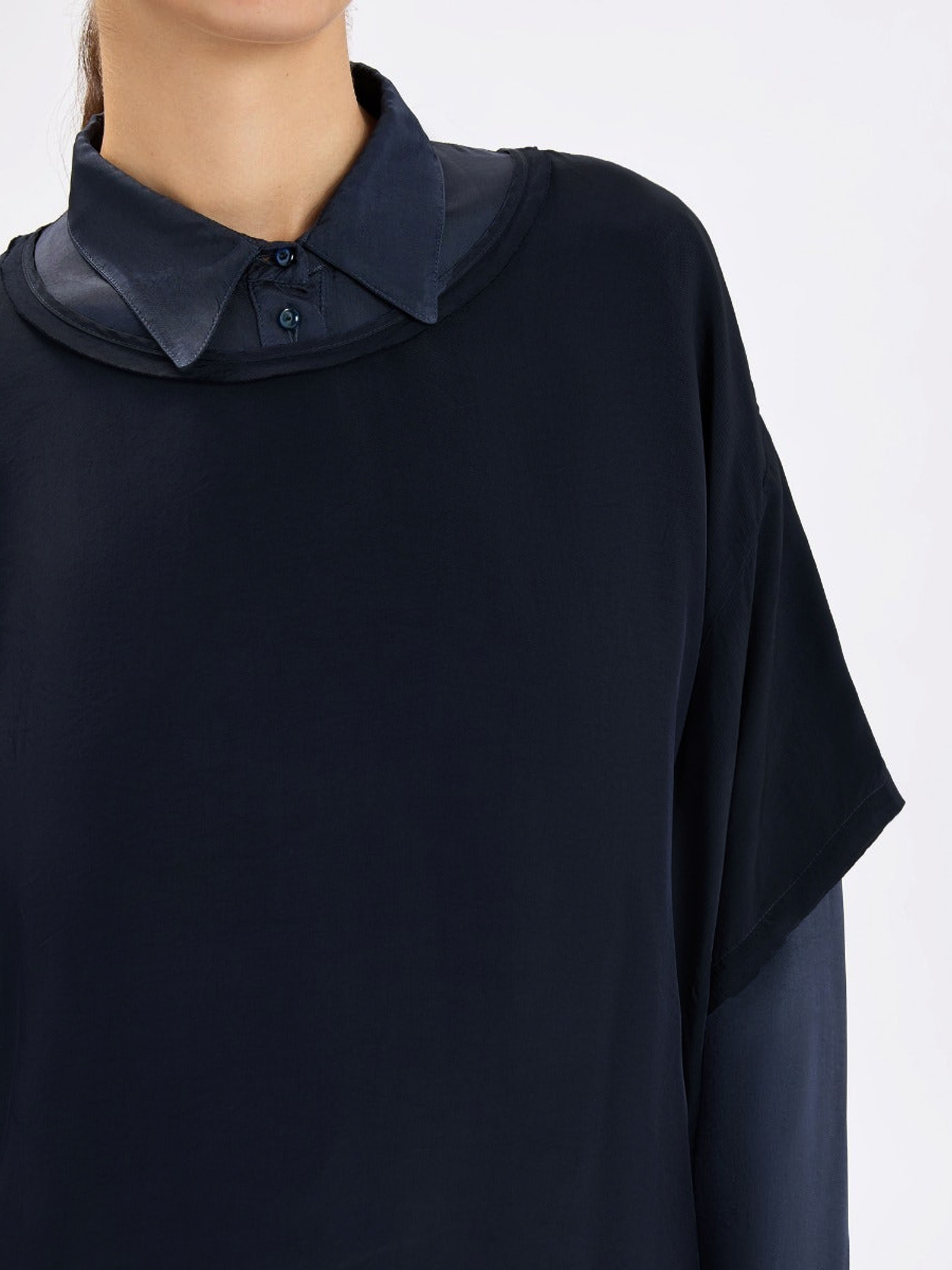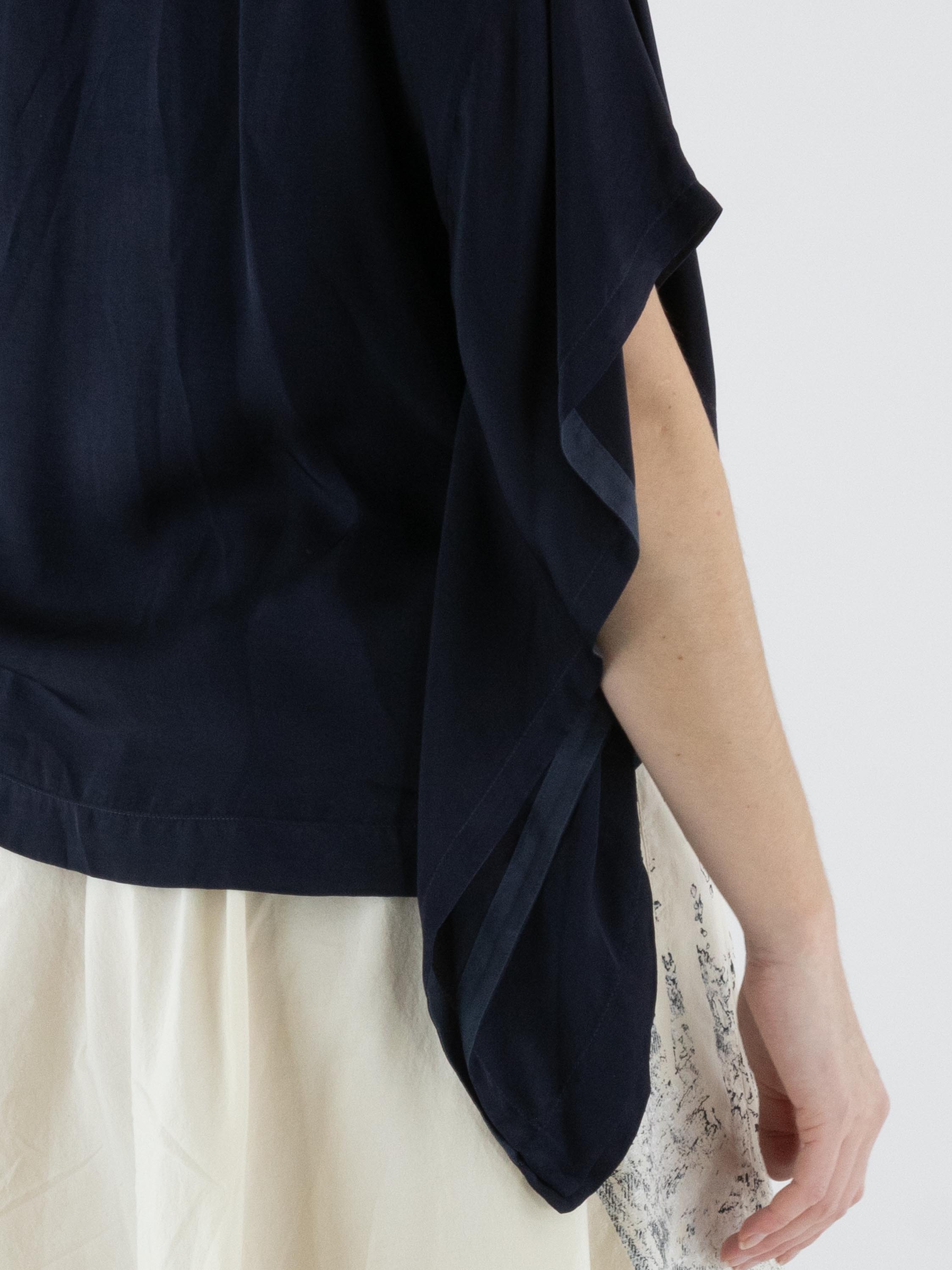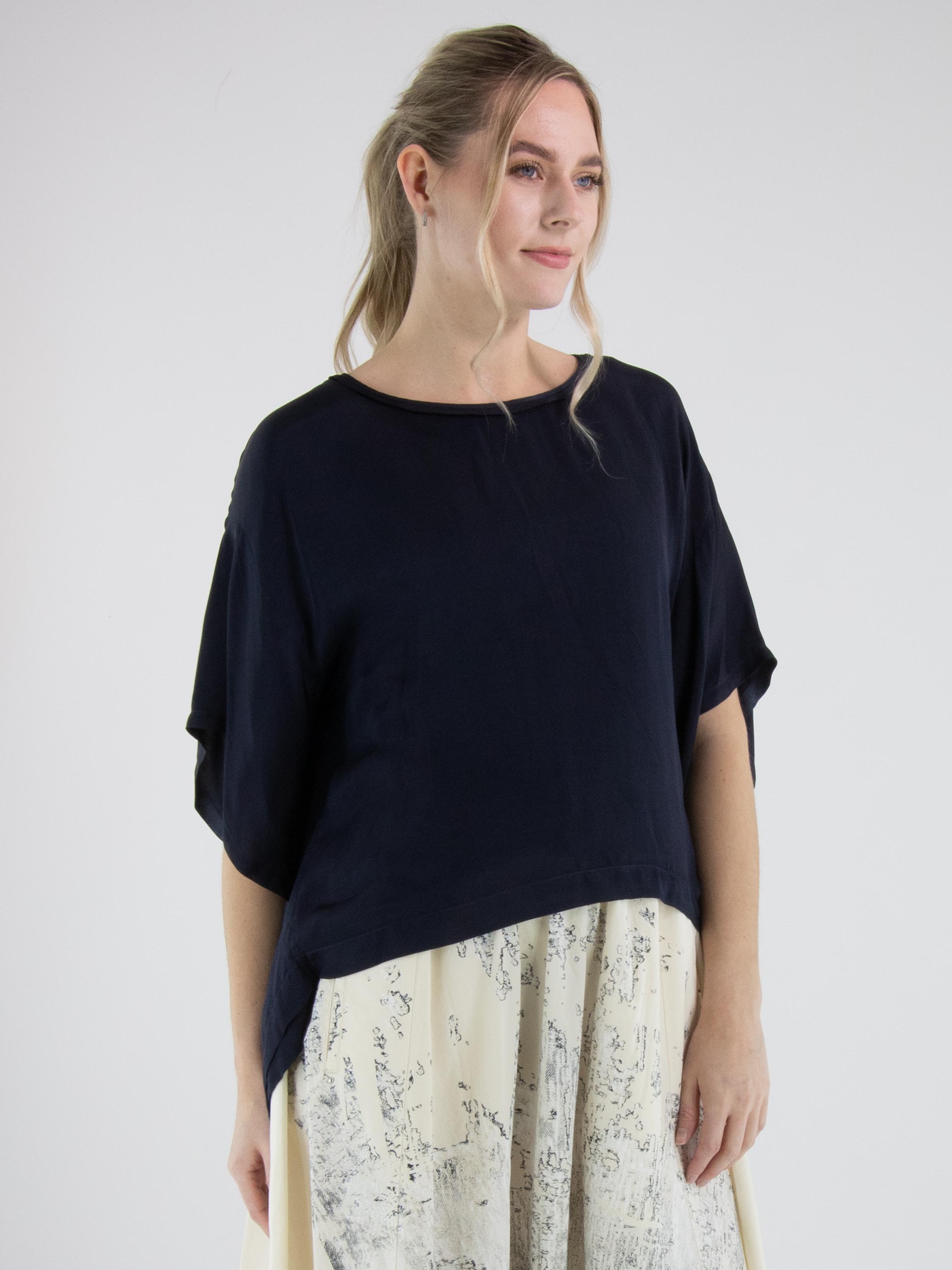 Mat satijnen shirt van High in de kleur marineblauw. Het shirt heeft een ronde hals en elegante vleermuismouwen, wat zorgt voor een soepele en vrouwelijke uitstraling. Dit exclusieve designer shirt kan op 30 graden worden gewassen.
