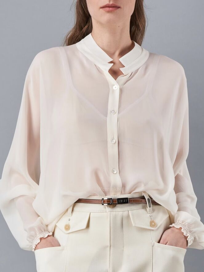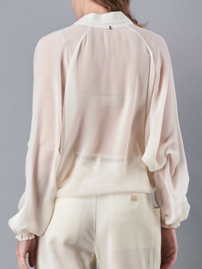 Een luxe transparante blouse van High in een roomwitte kleur. Aan de onderkant en aan de uiteinden van de lange mouwen is een fijn geplooide elastische bies. Deze blouse mag niet worden gewassen.