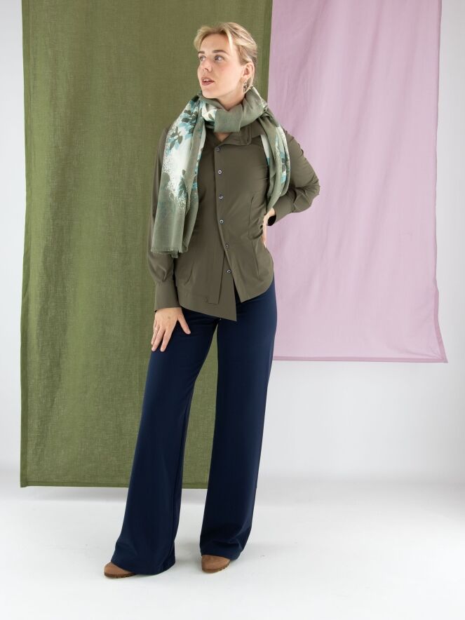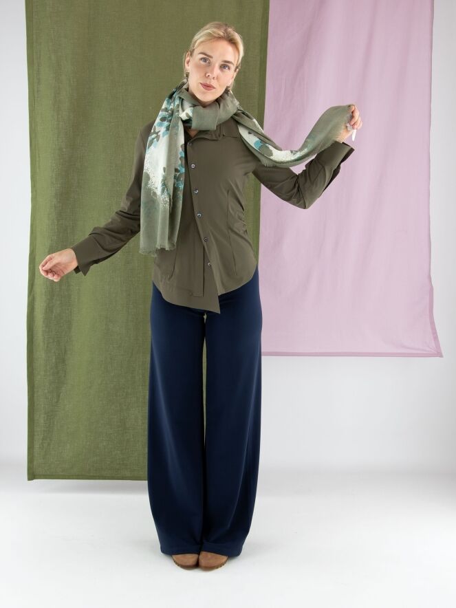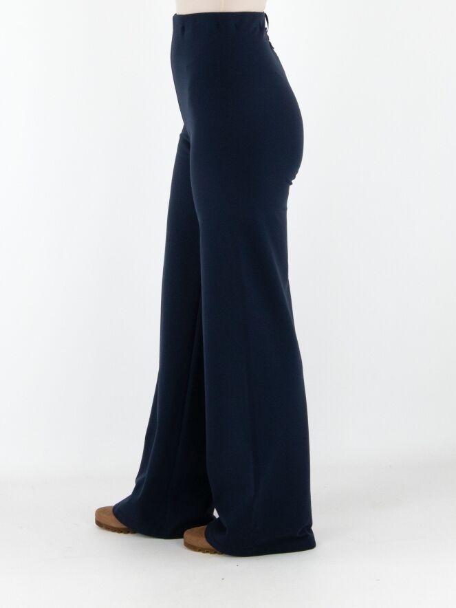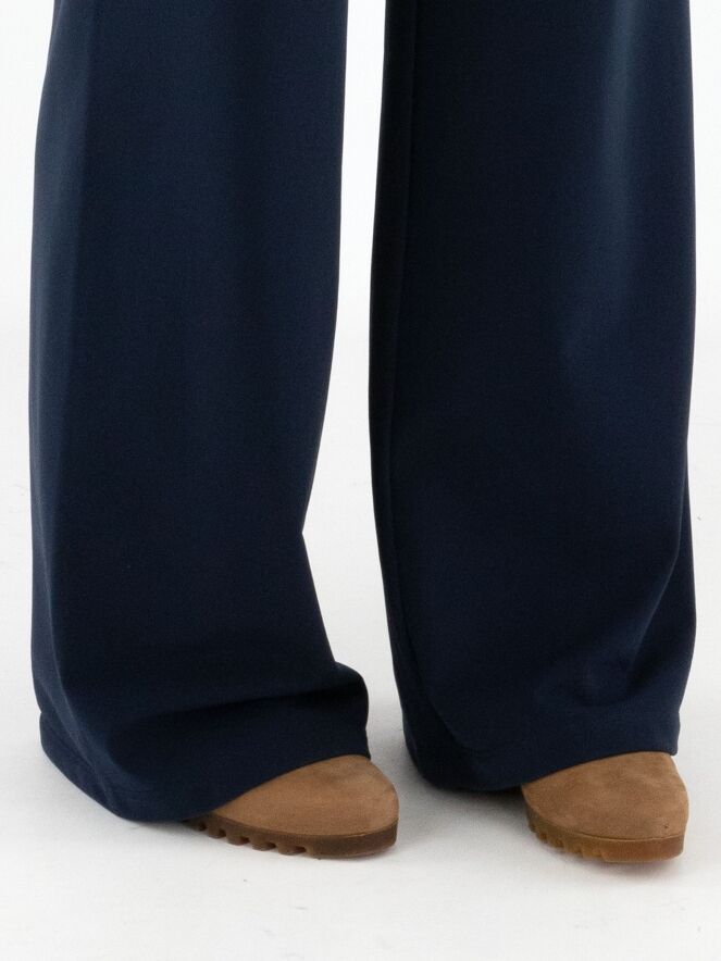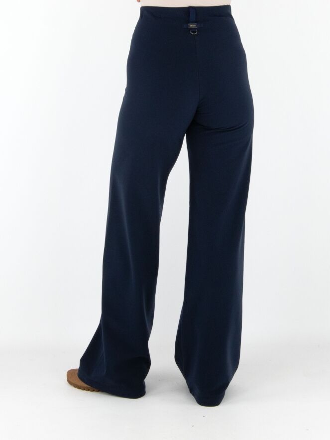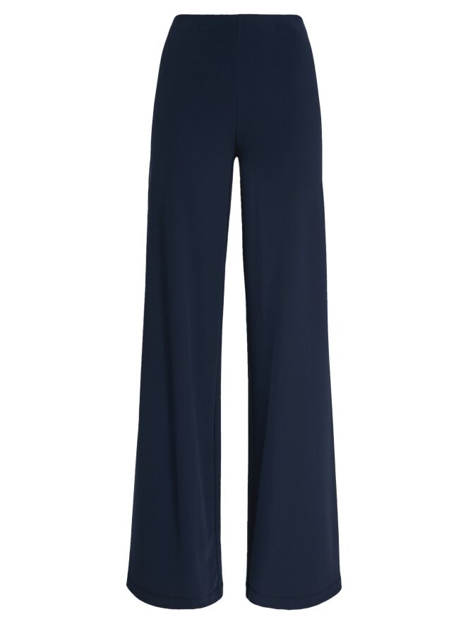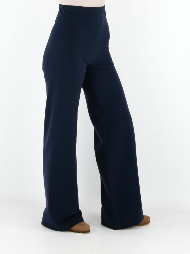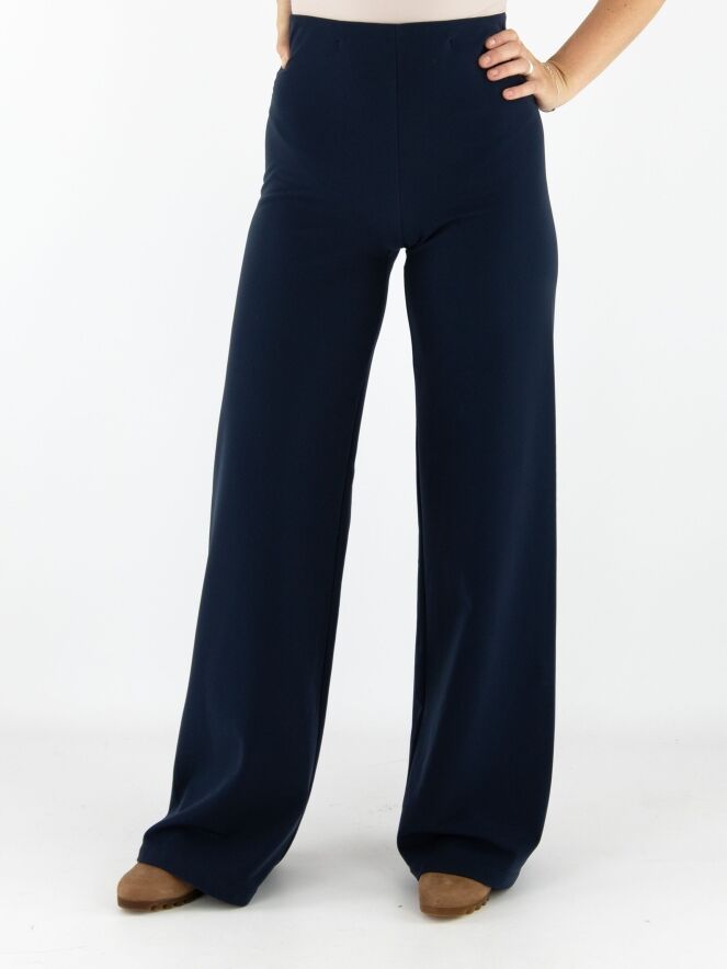 Een broek van High in de kleur nachtblauw. In de taille zit een elastische band. De broek is recht gesneden en mag op 30 graden worden gewassen.