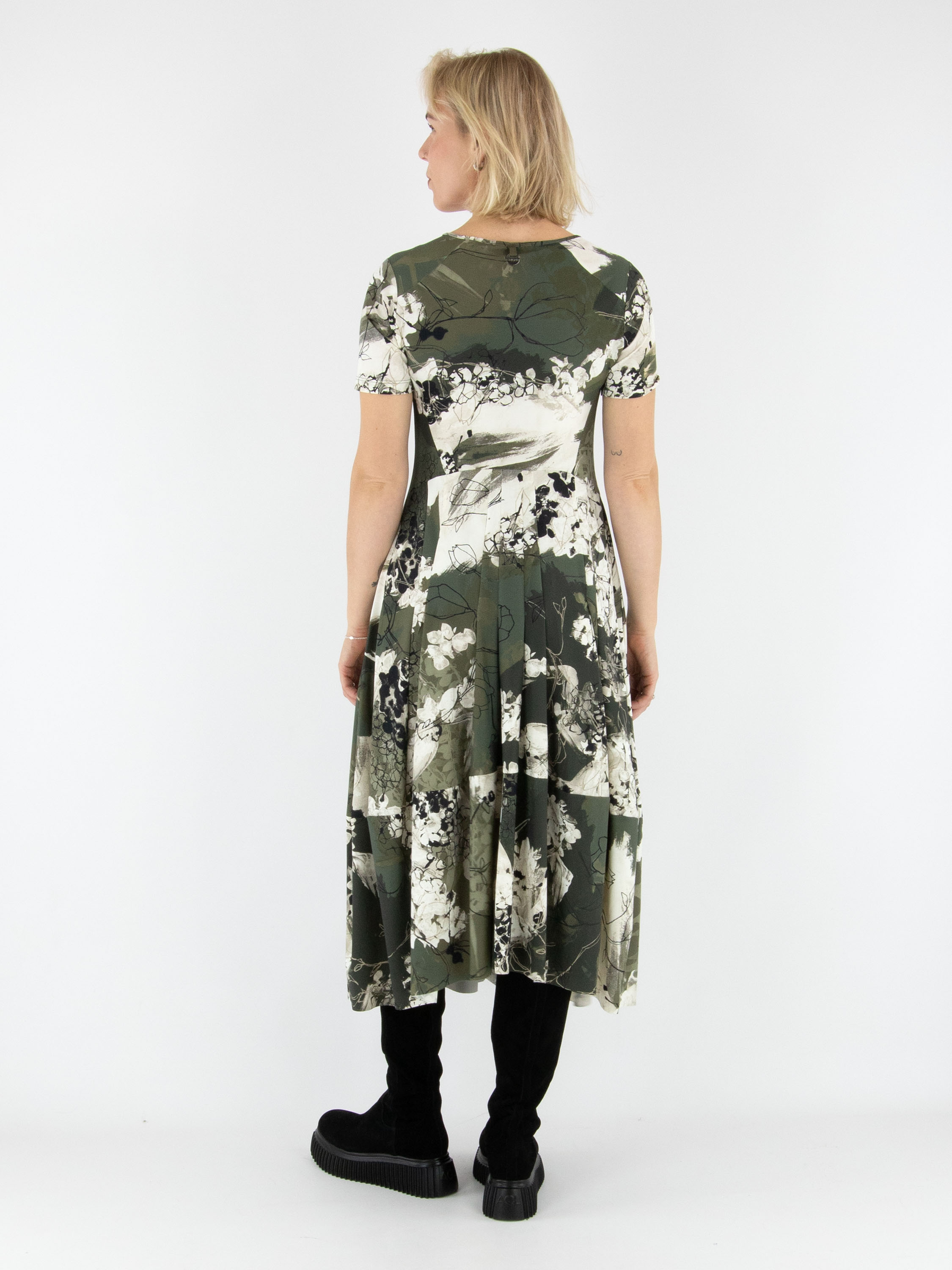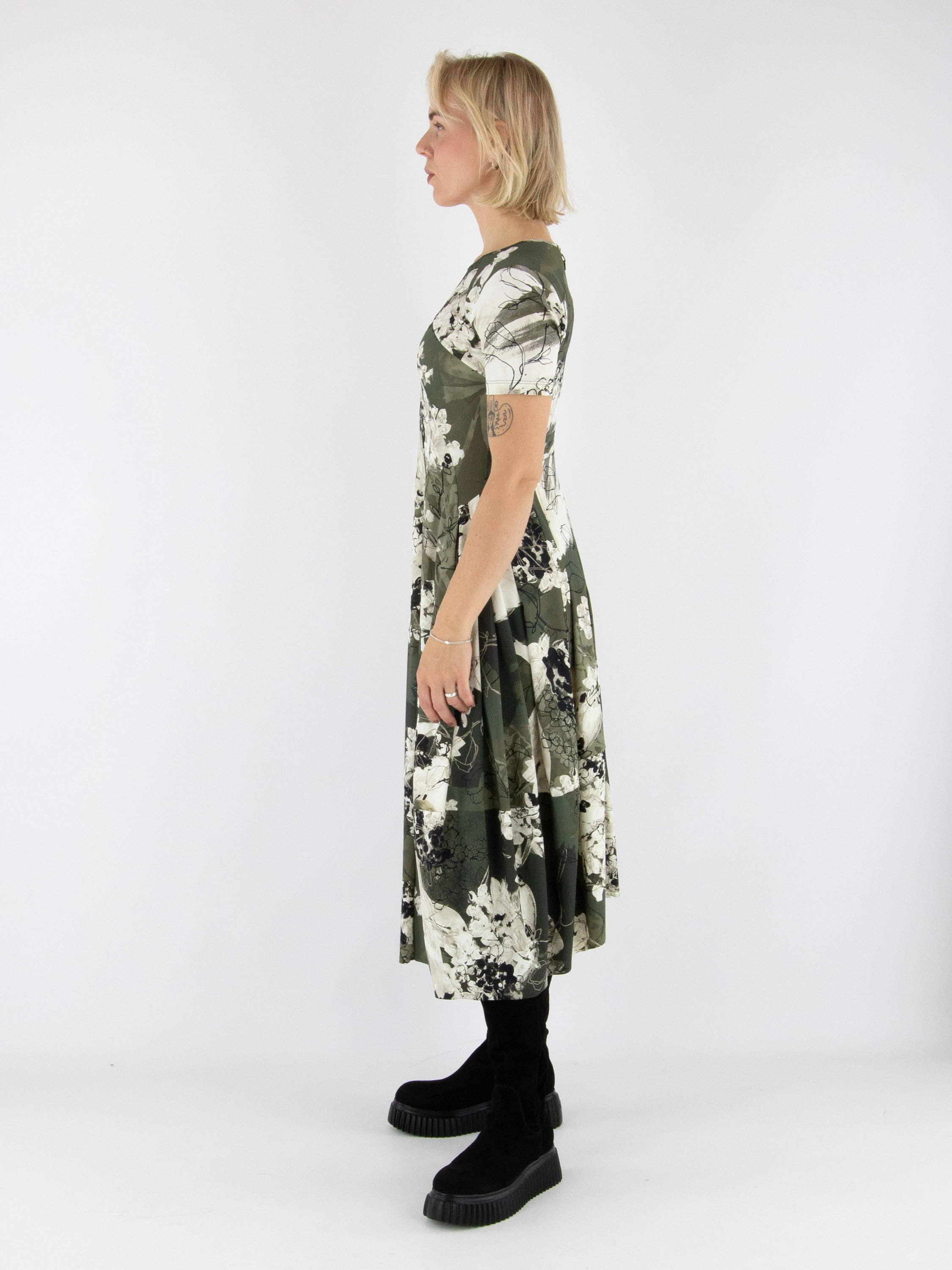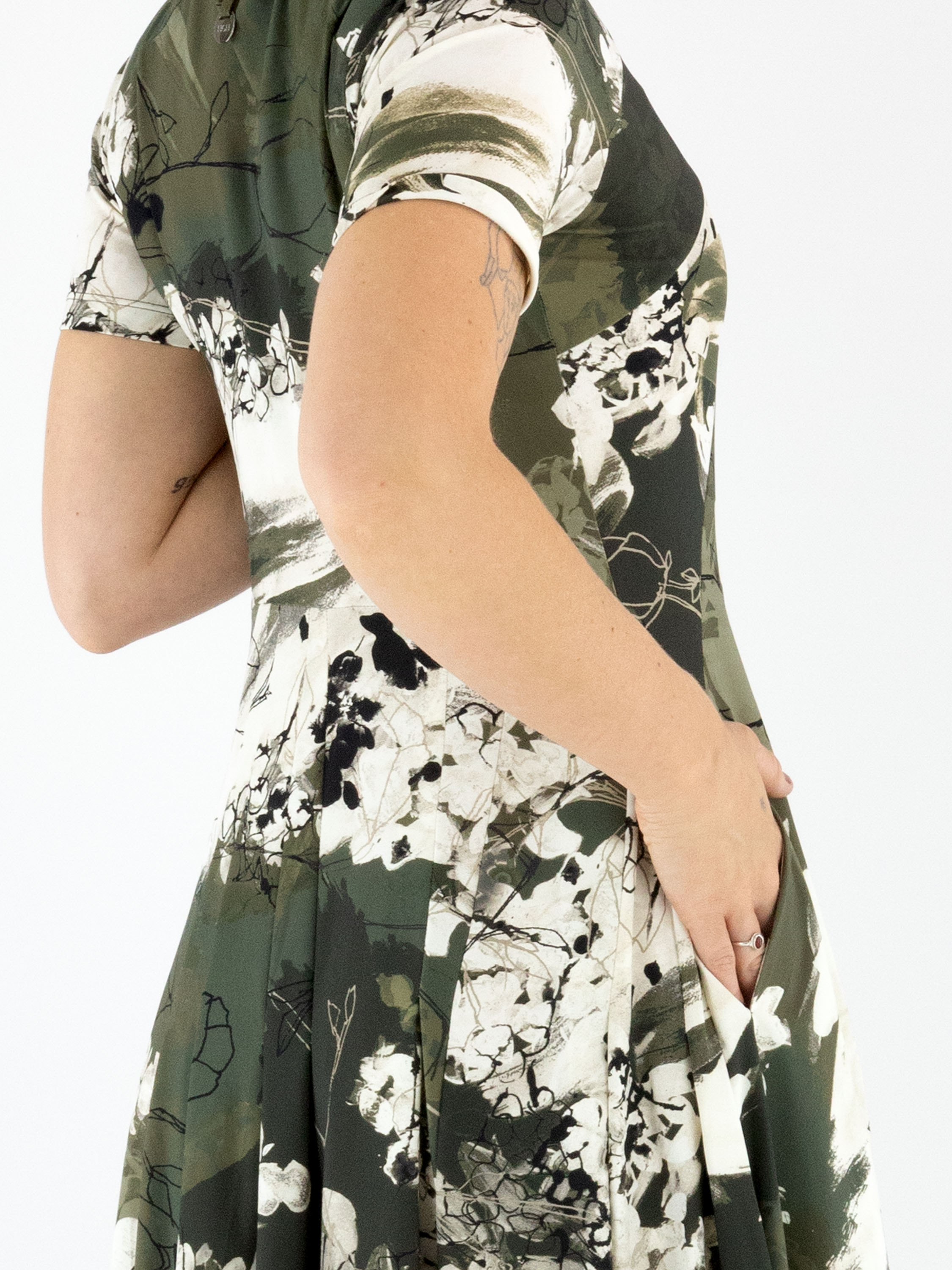 Jurk van High met een grafische bloemenprint in tinten zwart en olijfgroen op een roomwitte achtergrond. De jurk heeft een ronde hals en korte mouwen en is voorzien van steekzakken in de taille. Vanaf de taille loopt het model uit in een elegant balloneffect, wat zorgt voor een moderne en vrouwelijke uitstraling. Deze exclusieve designerjurk kan op 30 graden worden gewassen.