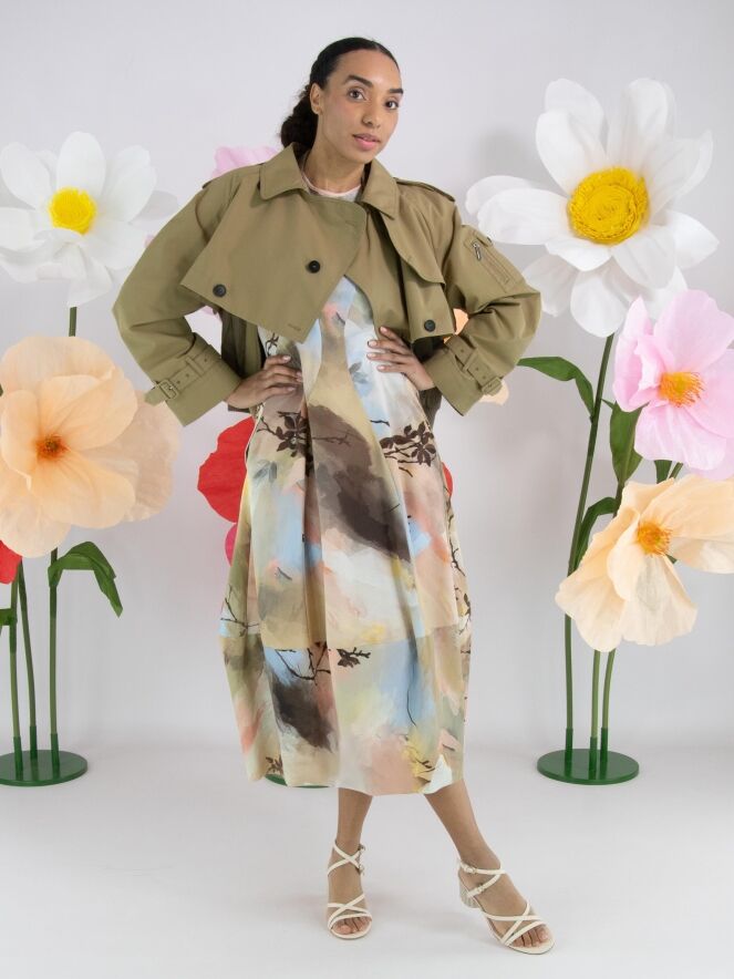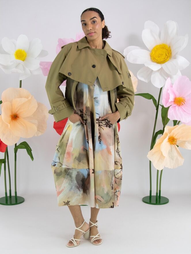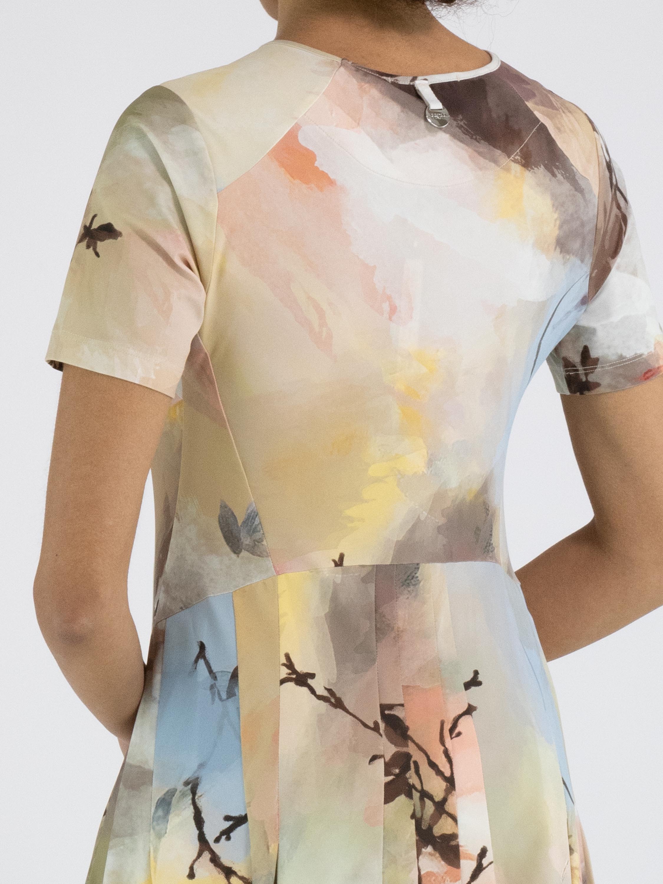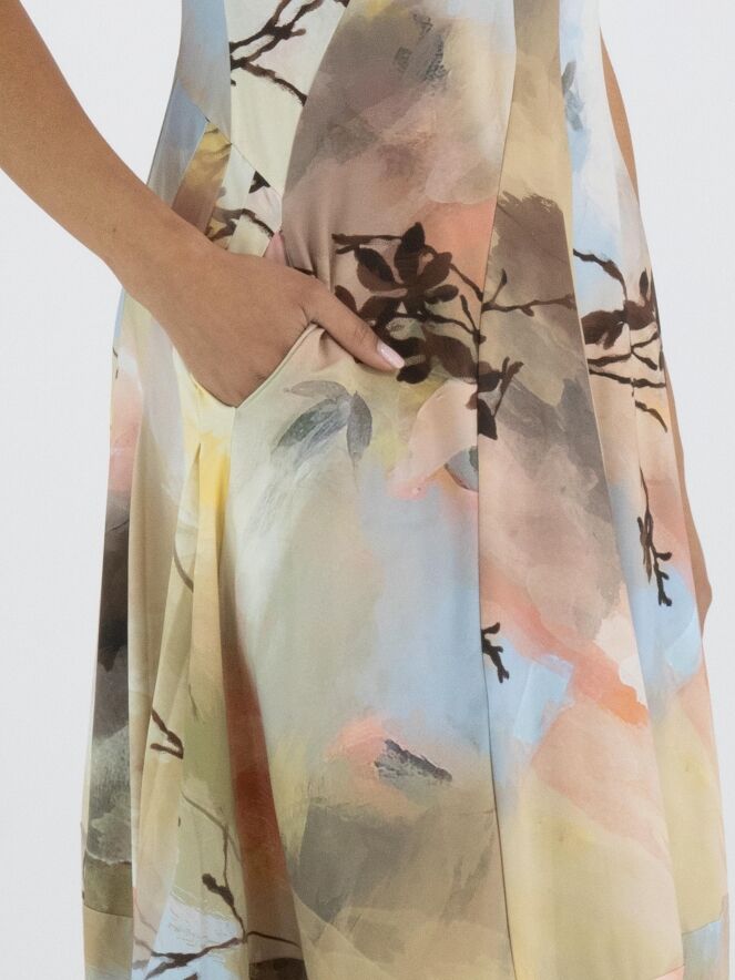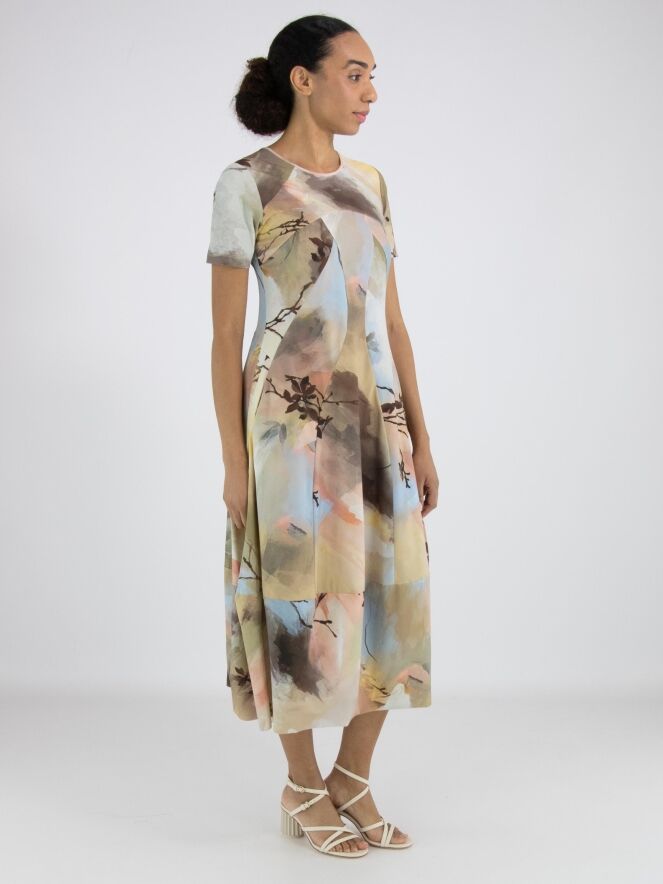 Een jurk van High Tech in een grafische multicolor aquarelprint met als hoofdkleuren meerdere tinten taupe, pastelblauw en zalmtinten. De jurk heeft een ronde hals en korte mouwen. Ter hoogte van de taille zijn steekzakken. Vanuit de taille heeft de jurk een ballonvorm. Deze jurk mag op 30 graden worden gewassen.