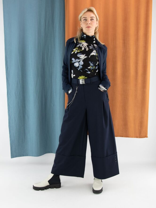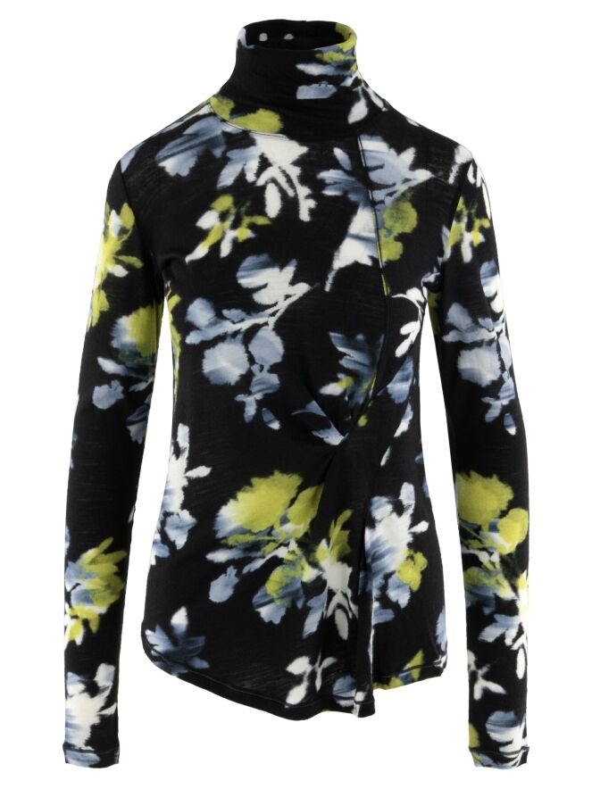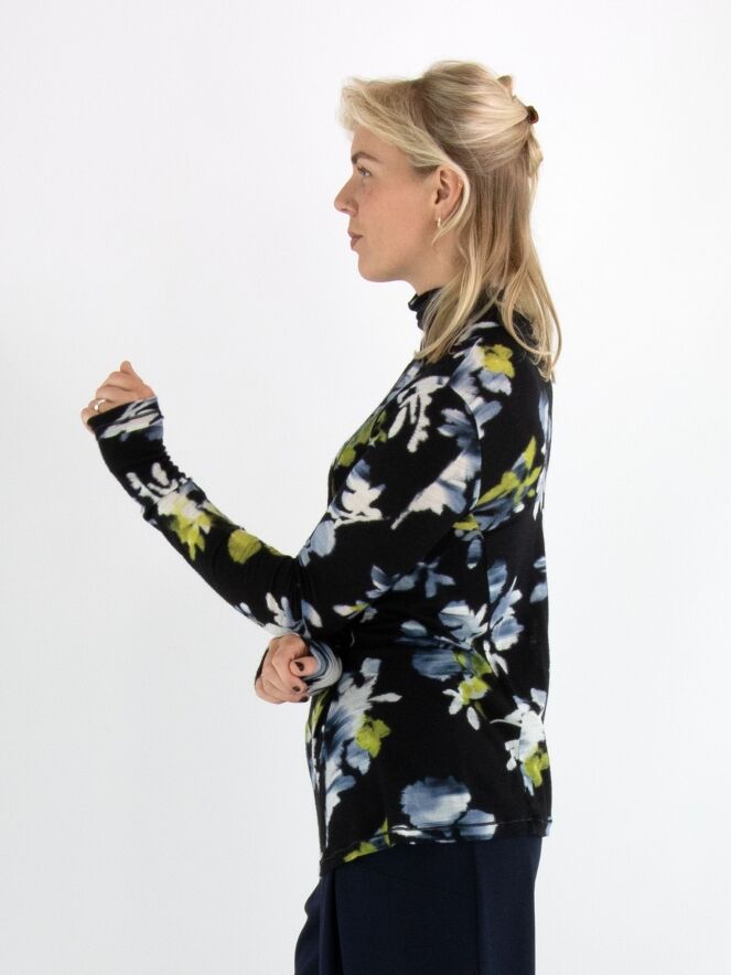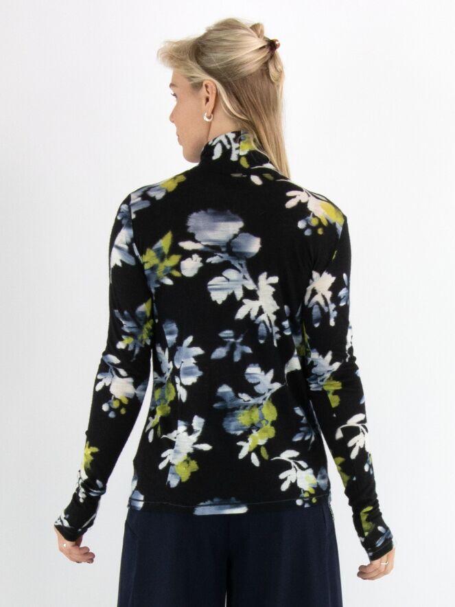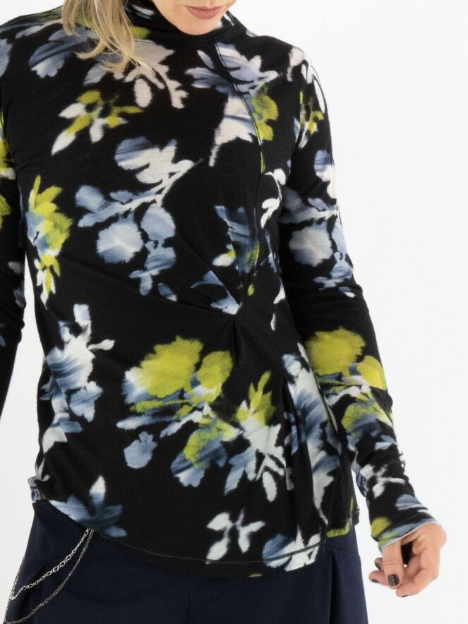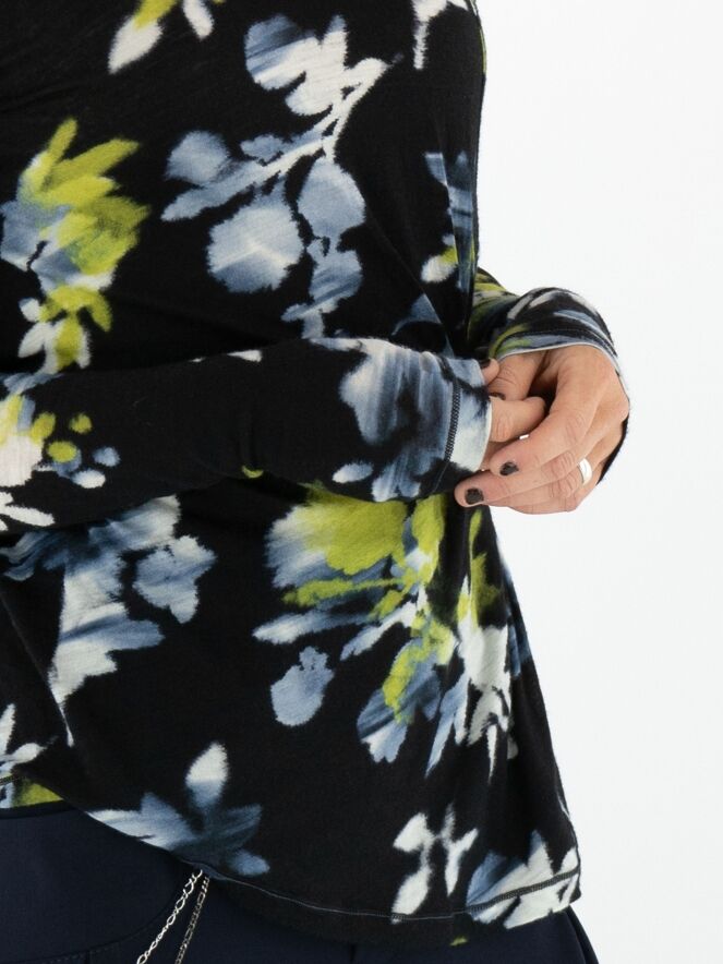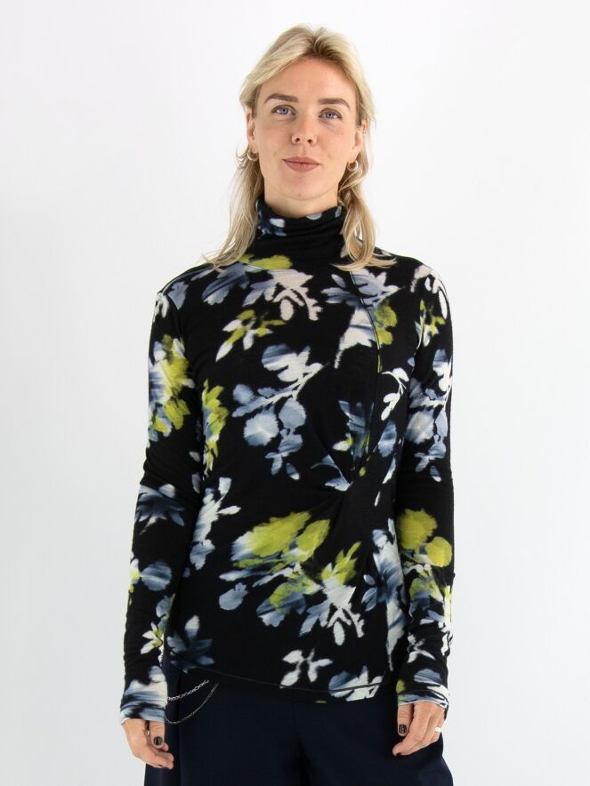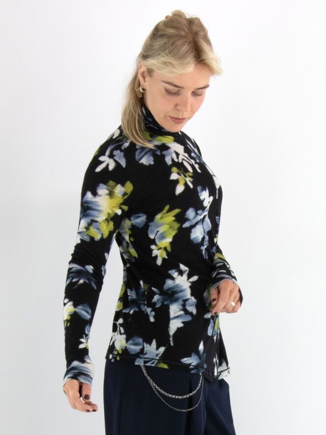 Een shirt van High in een grafische bloemenprint met de kleuren geel, wit en lichtblauw op een marineblauwe achtergrond. Het shirt heeft een hangende col en lange mouwen. Dit shirt mag met de hand worden gewassen.
