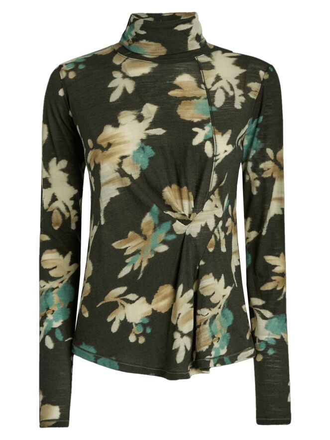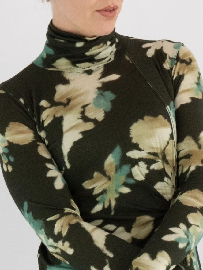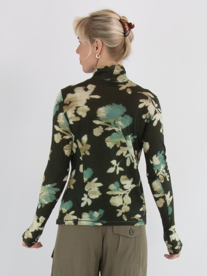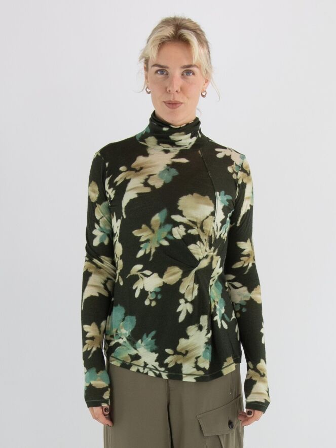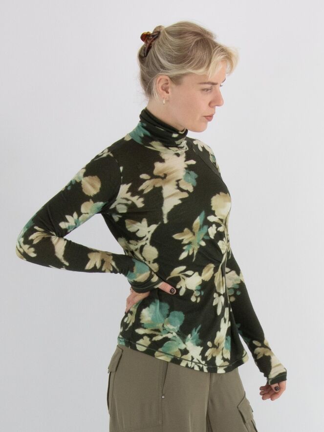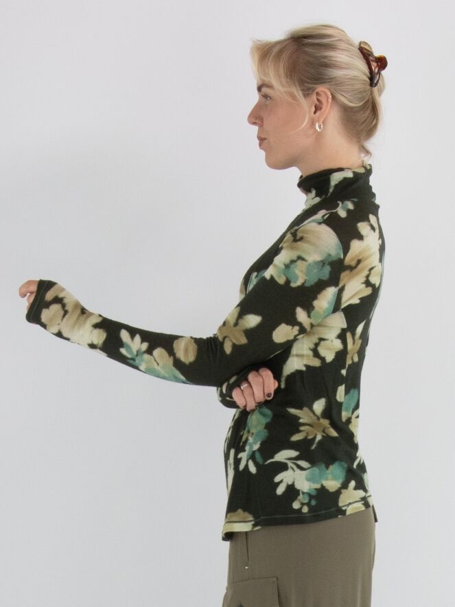 Een shirt van High in een grafische bloemenprint met de kleuren beige, taupe en turquoise op een olijfgroene achtergrond. Het shirt heeft een hangende col en lange mouwen. Dit shirt mag met de hand worden gewassen.