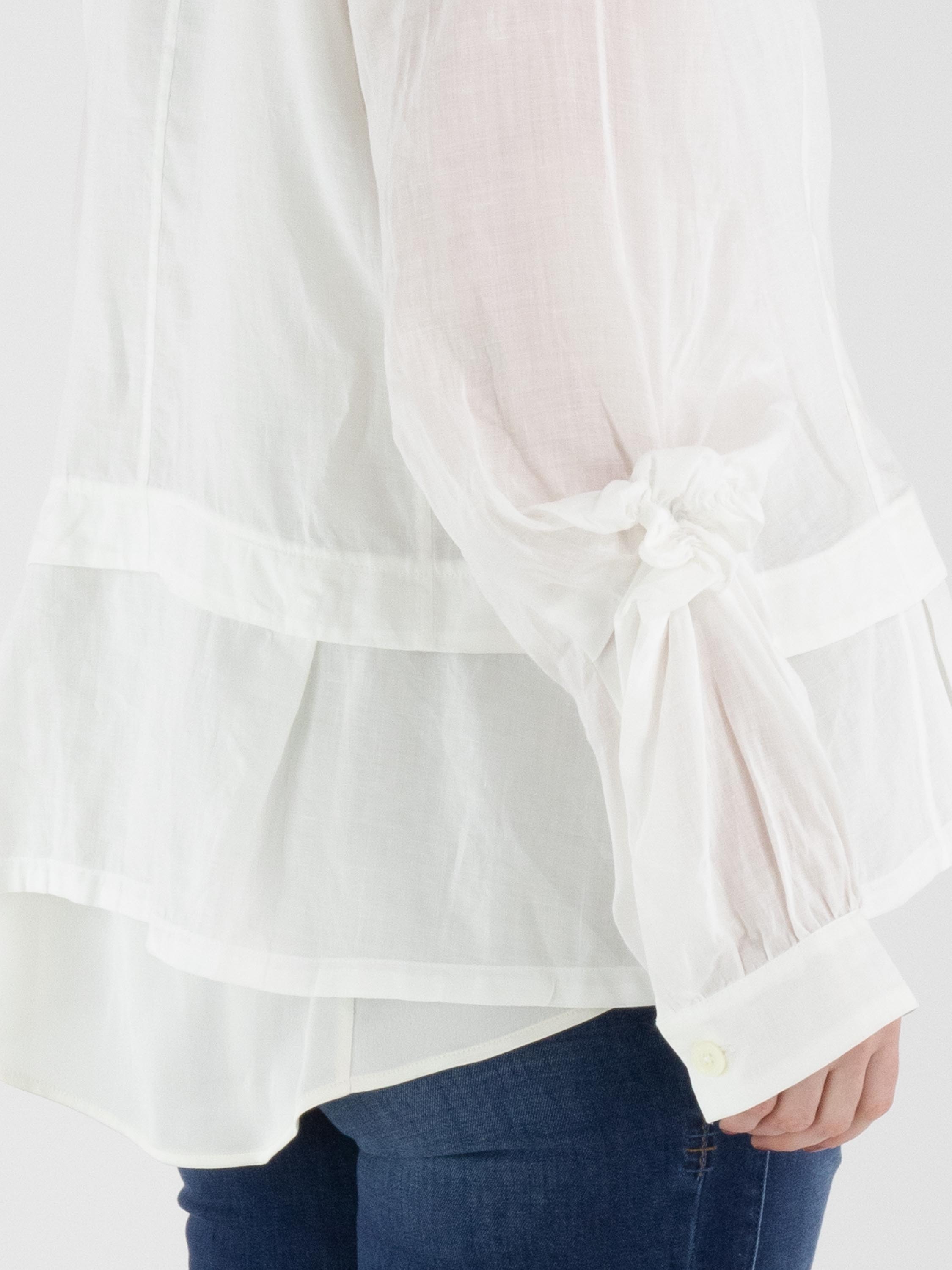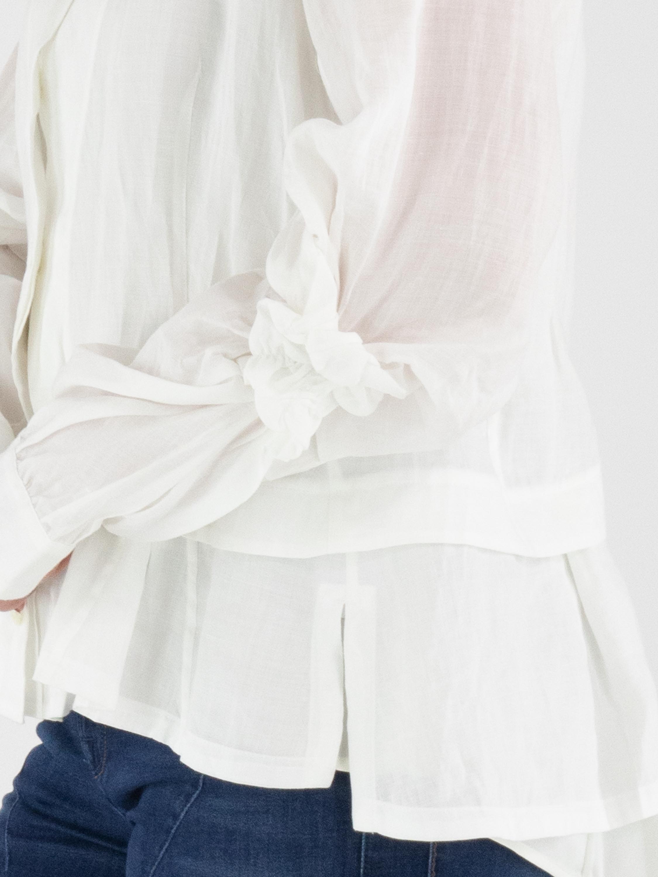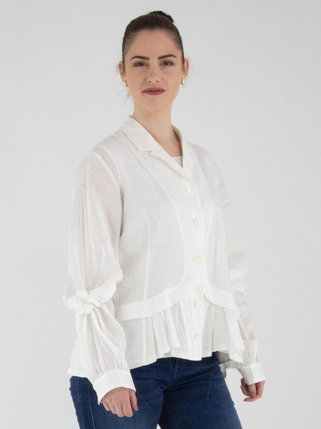 Een blouse van High in de kleur wit. In de kraag is een korte plissé verwerkt. Aan de onderkant loopt een ronde stiknaad naar de zijkanten, waaronder een tweede stof is aangebracht met meerdere plooien. Aan de achterzijde heeft deze tweede stof geen plooien. De lange mouwen zijn ter hoogte van de elleboog afgewerkt met een geplooide stikselverwerking in de vorm van een bloem. Deze blouse kan met de hand worden gewassen.