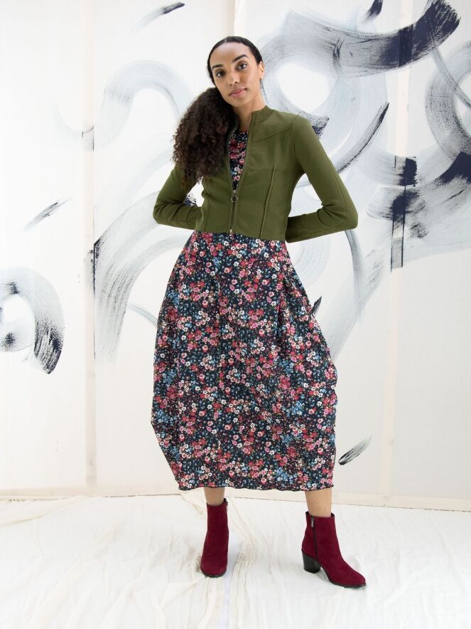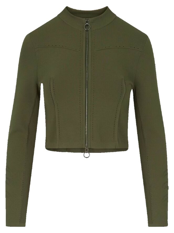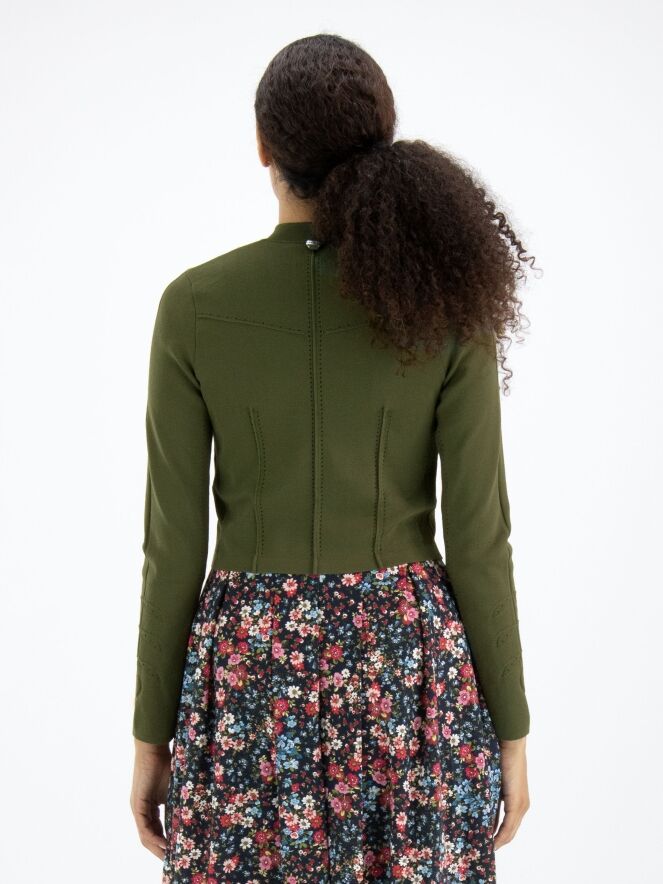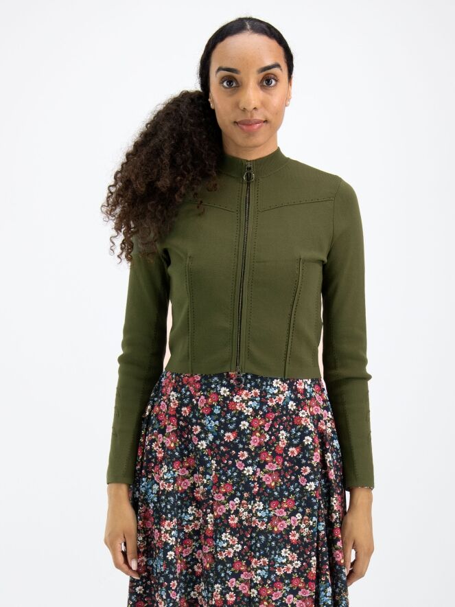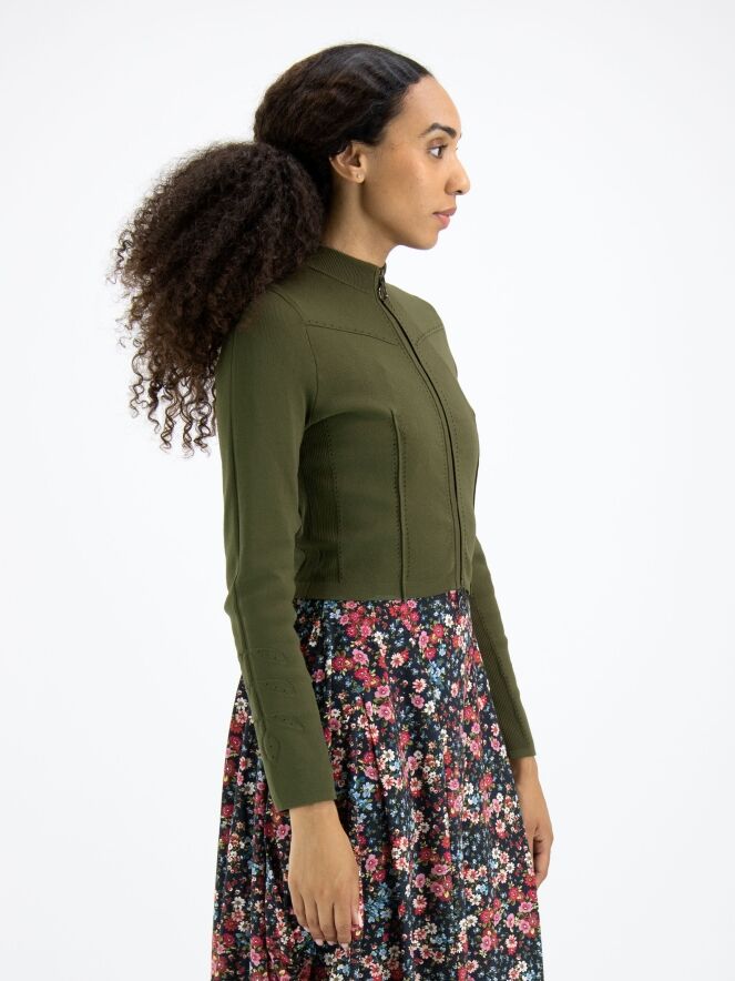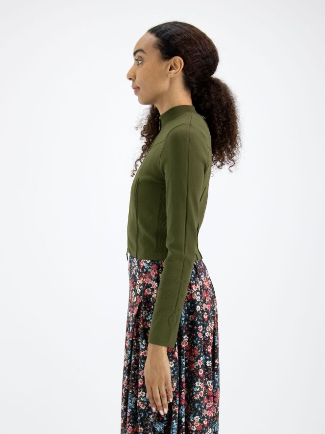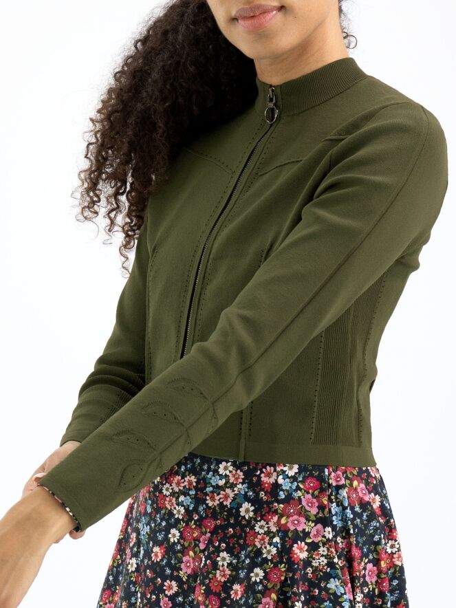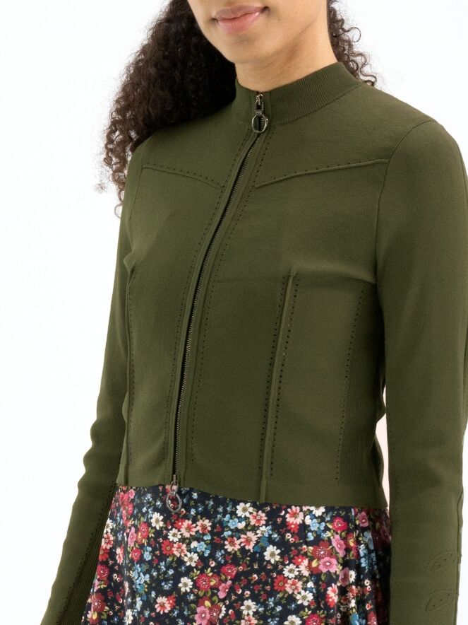Een kort vest van High in de kleur olijfgroen. Het vest heeft meerdere decoratieve omgekeerde stiknaden waarlangs ajourlijnen lopen. Langs de rand van de ronde hals is een fijn geribbelde tricot boord. De onderkant van de lange mouwen is in een fijn geribbelde elastische stof. Aan het uiteinde van de mouwen is een ajourpatroon in de vorm van bladeren. Het vest heeft een ritssluiting en mag op de hand worden gewassen.
