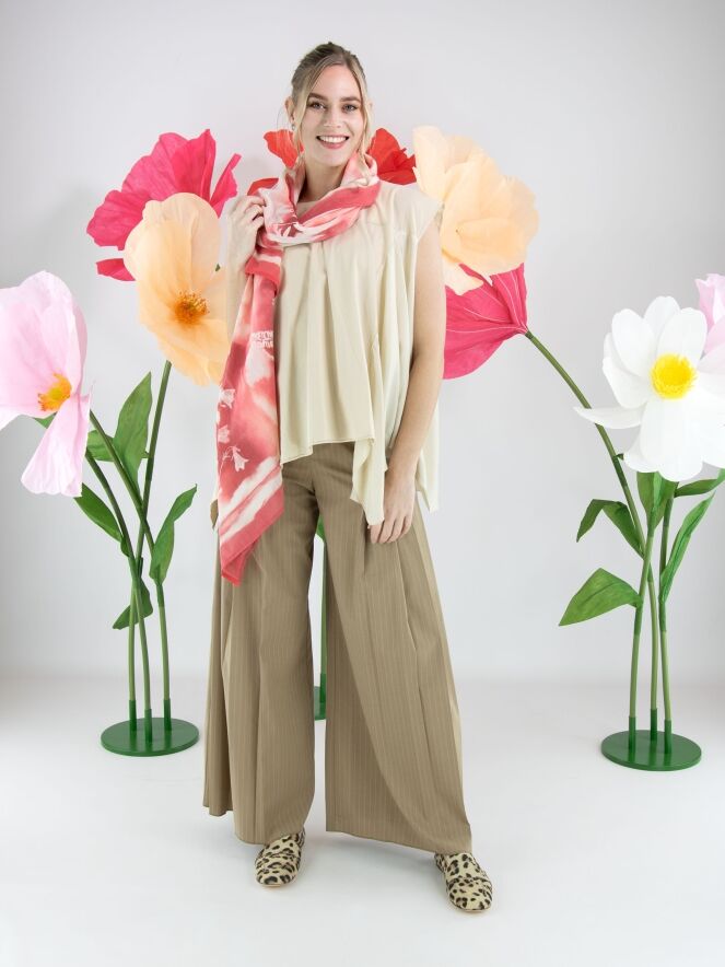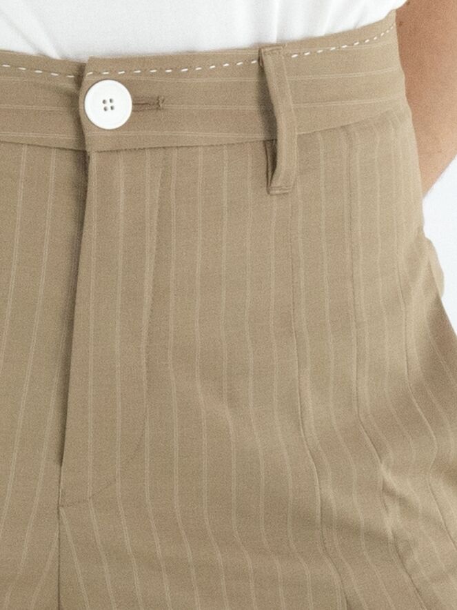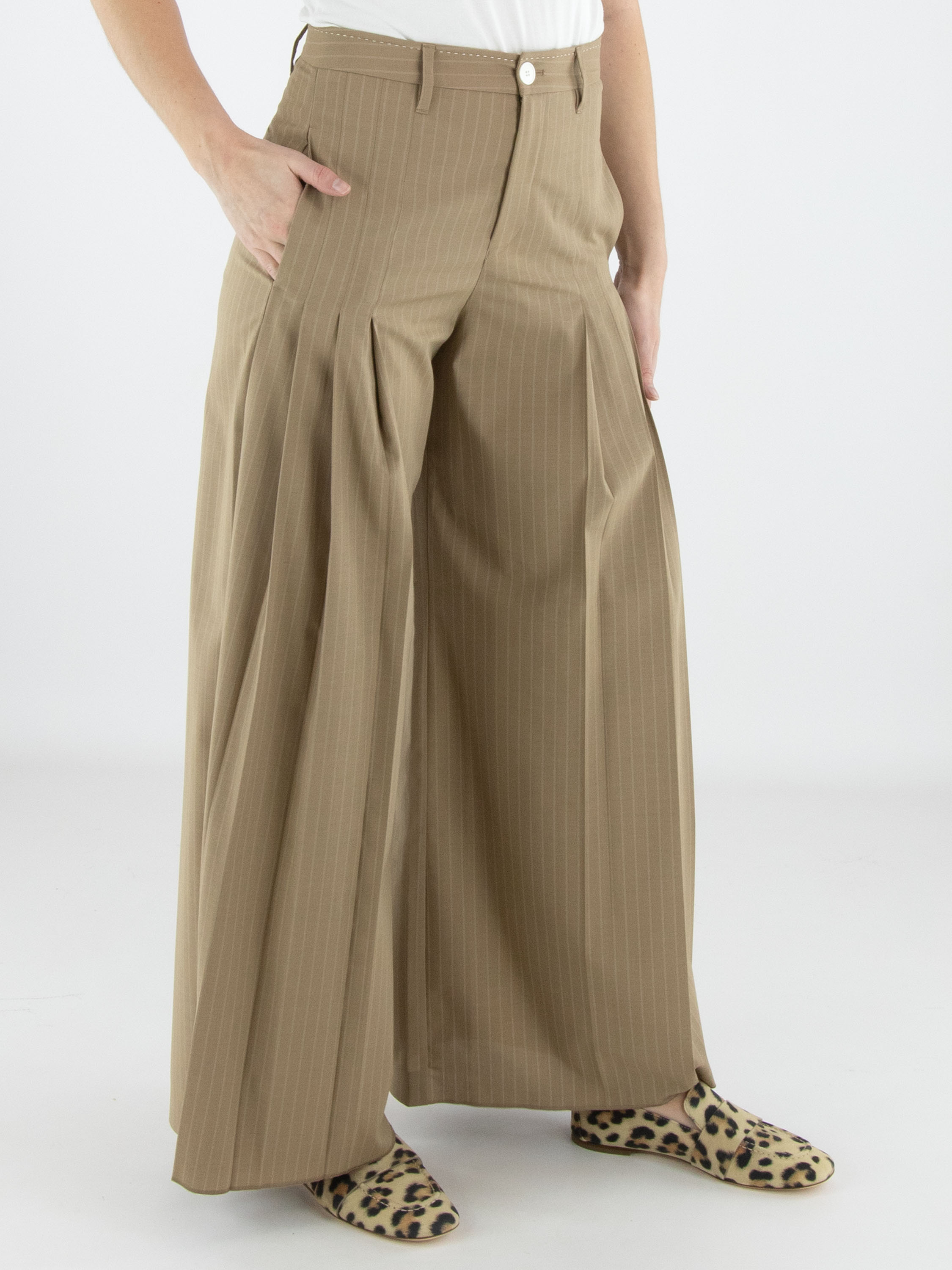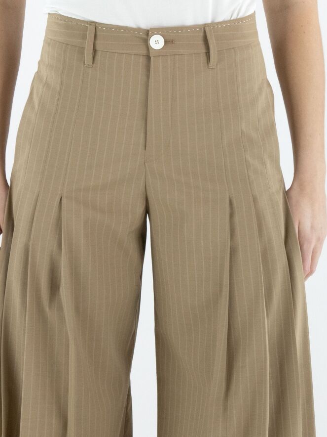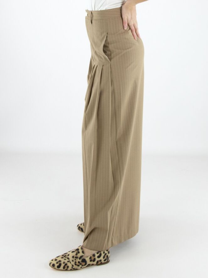 Wijde pantalon van High in een elegante krijtstreepstructuur in de kleur camel. Vanuit de voorzijde bij de heupen lopen aan beide zijden meerdere bandplooien, die richting de pijpen overgaan in een subtiel plissé-effect. Dit geeft de broek een vloeiende, vrouwelijke en eigentijdse uitstraling. Deze exclusieve designerpantalon mag niet worden gewassen.