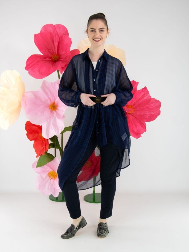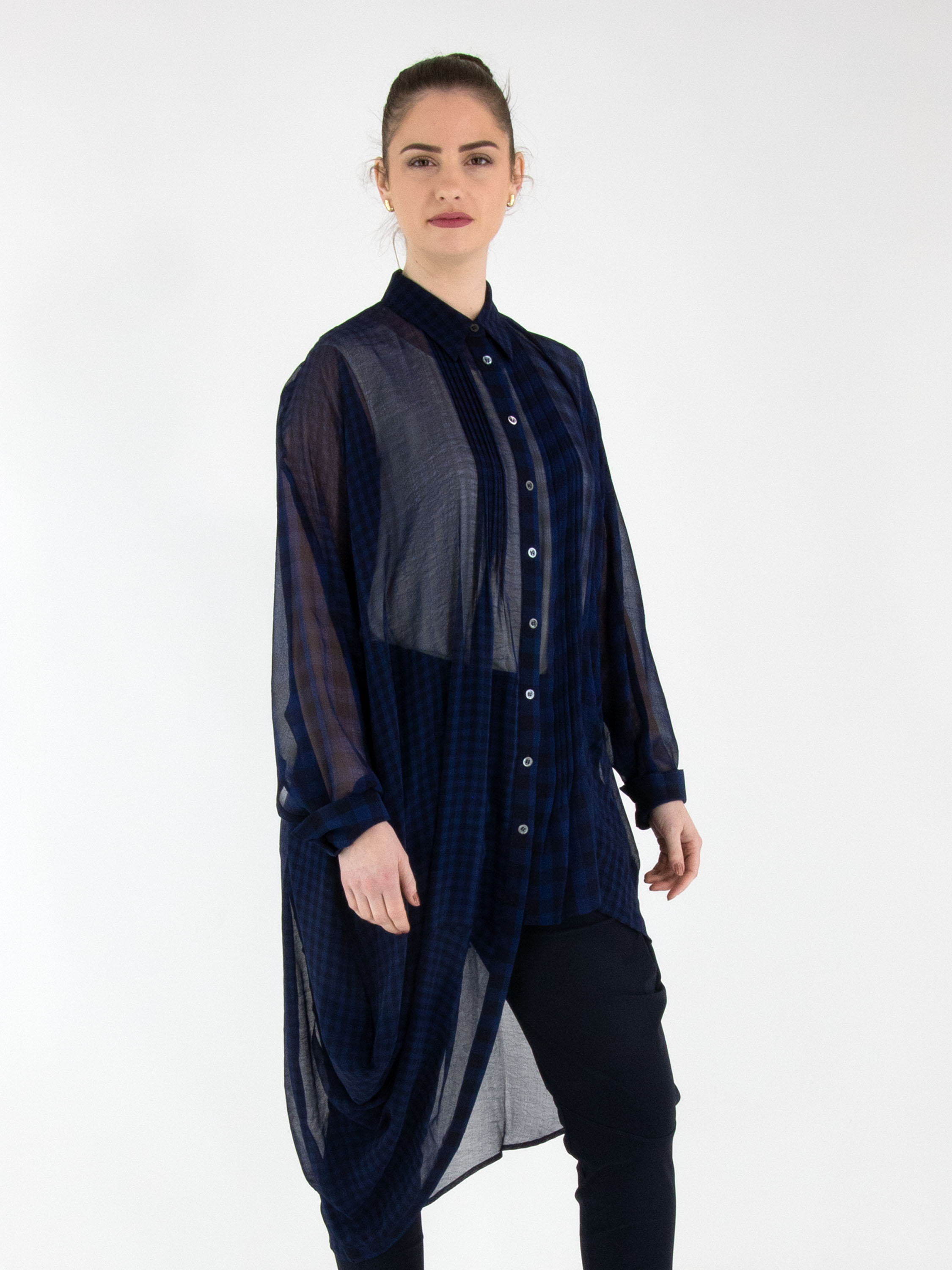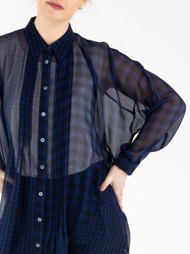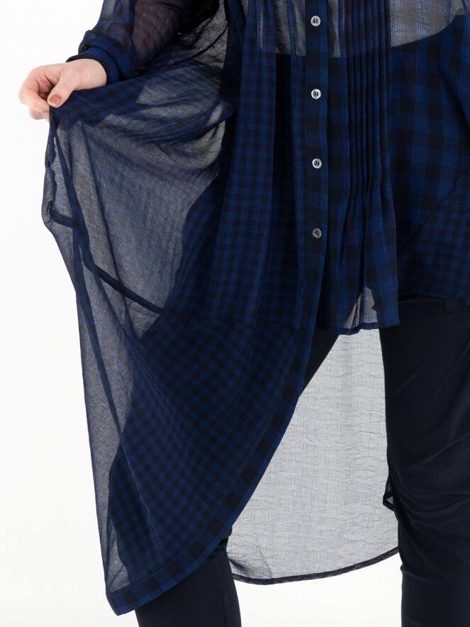 Een lange transparante blouse van High in een geblokte structuur in de kleur nachtblauw. De linkerzijde aan de voorzijde heeft een lengte van 80 cm. De rechterzijde en de achterkant hebben een lengte van 120 cm. Langs de knoopsluiting is de stof aan beide kanten fijn geplisseerd. Deze blouse mag op de hand worden gewassen.