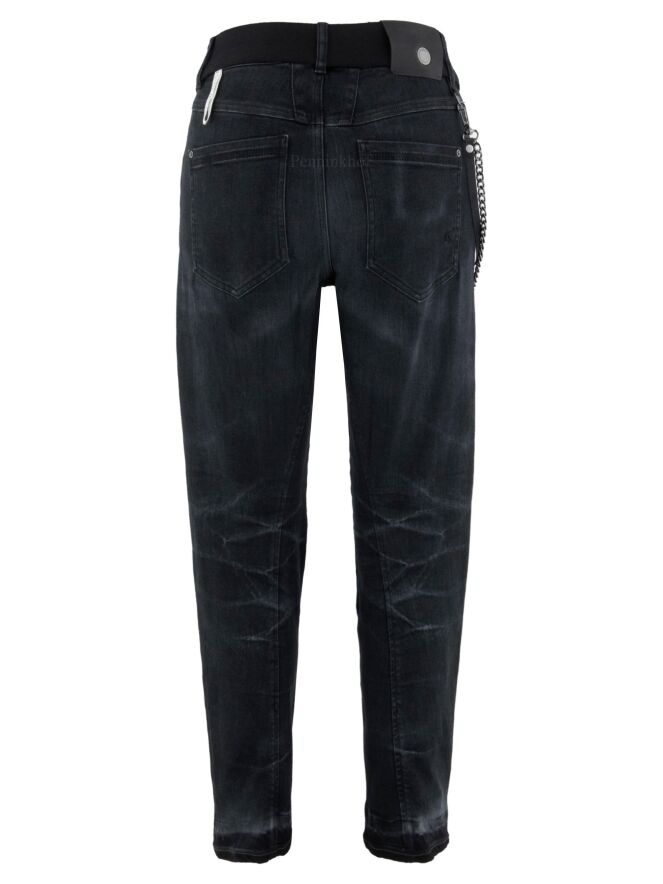 Een gewassen jeans van High in de kleur zwart. In de taille is een elastieken ceintuur met een vierkante nikkel kleurige gesp. Vanuit de rechter ceintuurlus is een ketting die naar de achterkant loopt. Deze jeans mag op 30 graden worden gewassen.