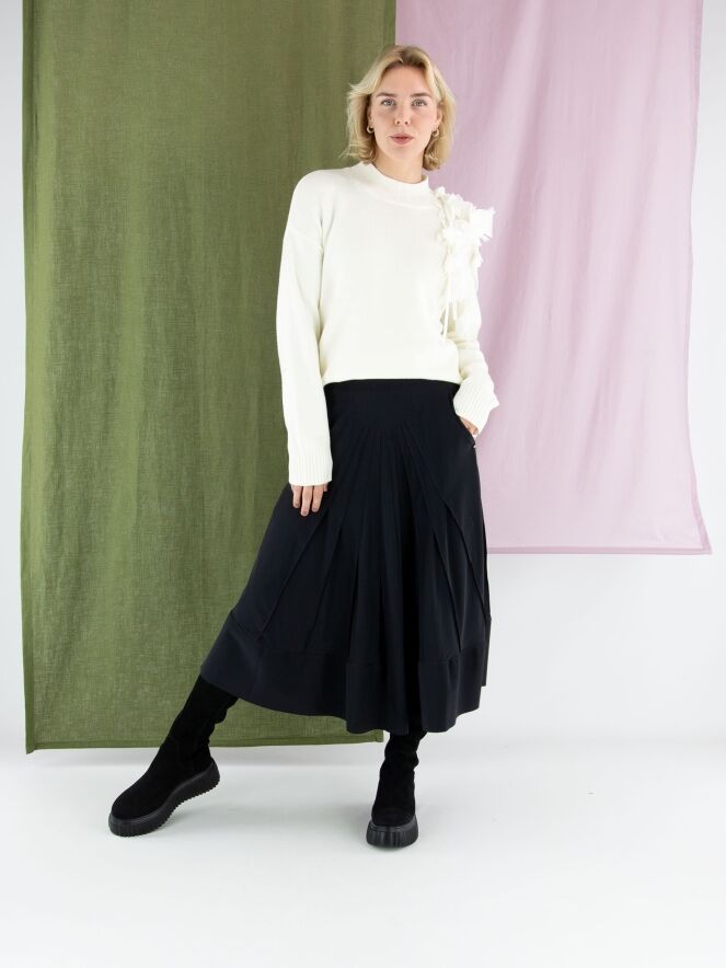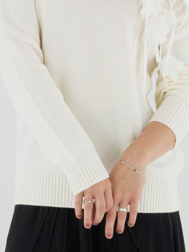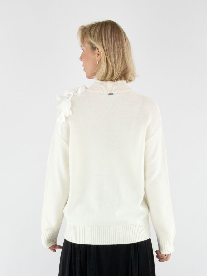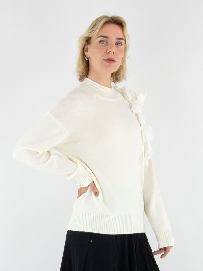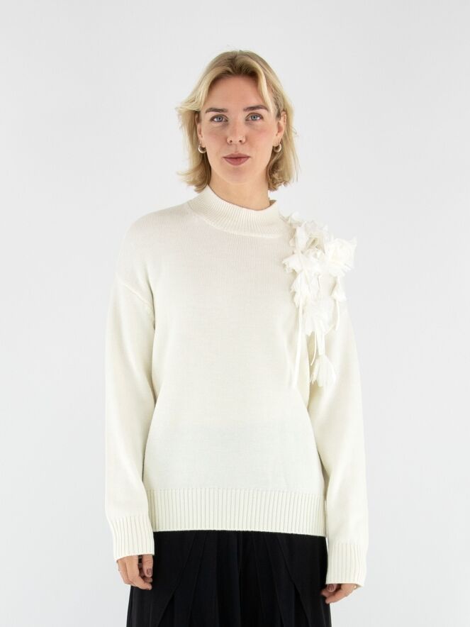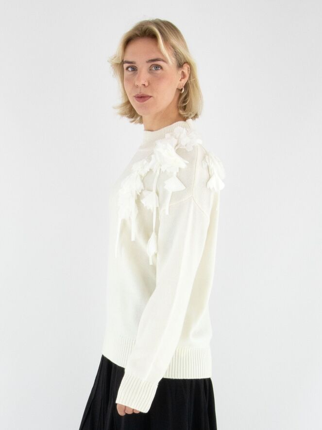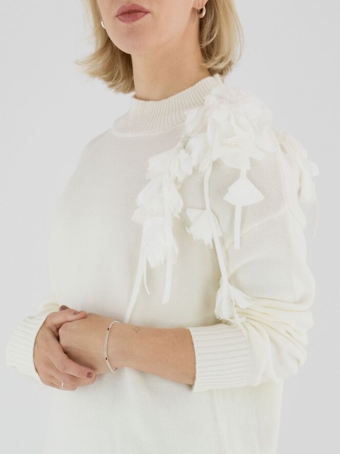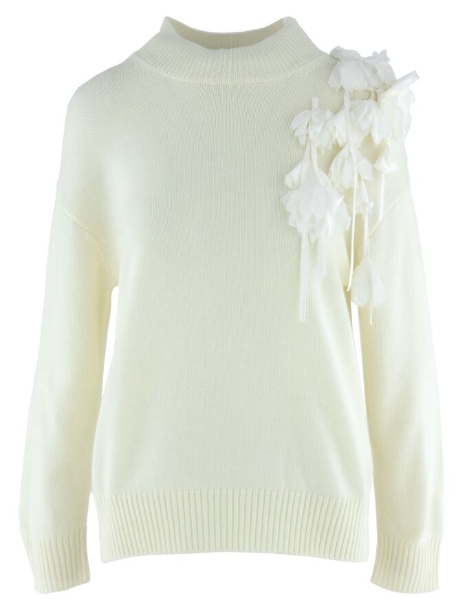 Een luxe pullover van High in de kleur roomwit. De pullover heeft een hoge ronde hals en lange mouwen. Vanuit de linker schouder vallen vijf linten in verschillende lengtes, met daarin bloemen verwerkt van een matte satijnen stof. Dit bijzondere detail geeft de trui een artistieke en exclusieve uitstraling. Deze pullover mag niet worden gewassen.