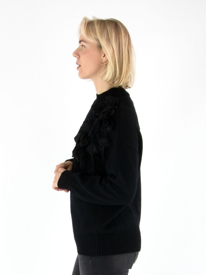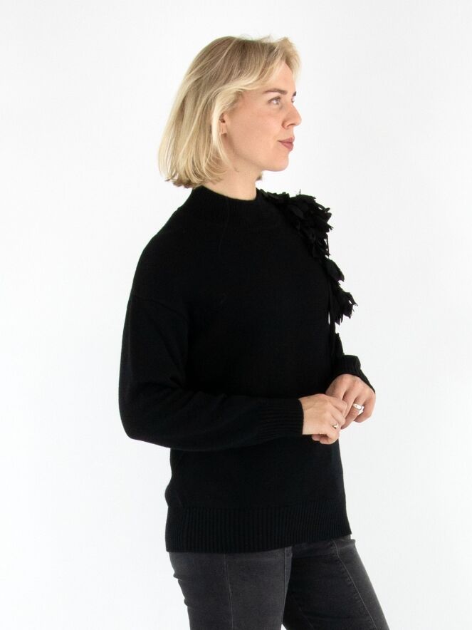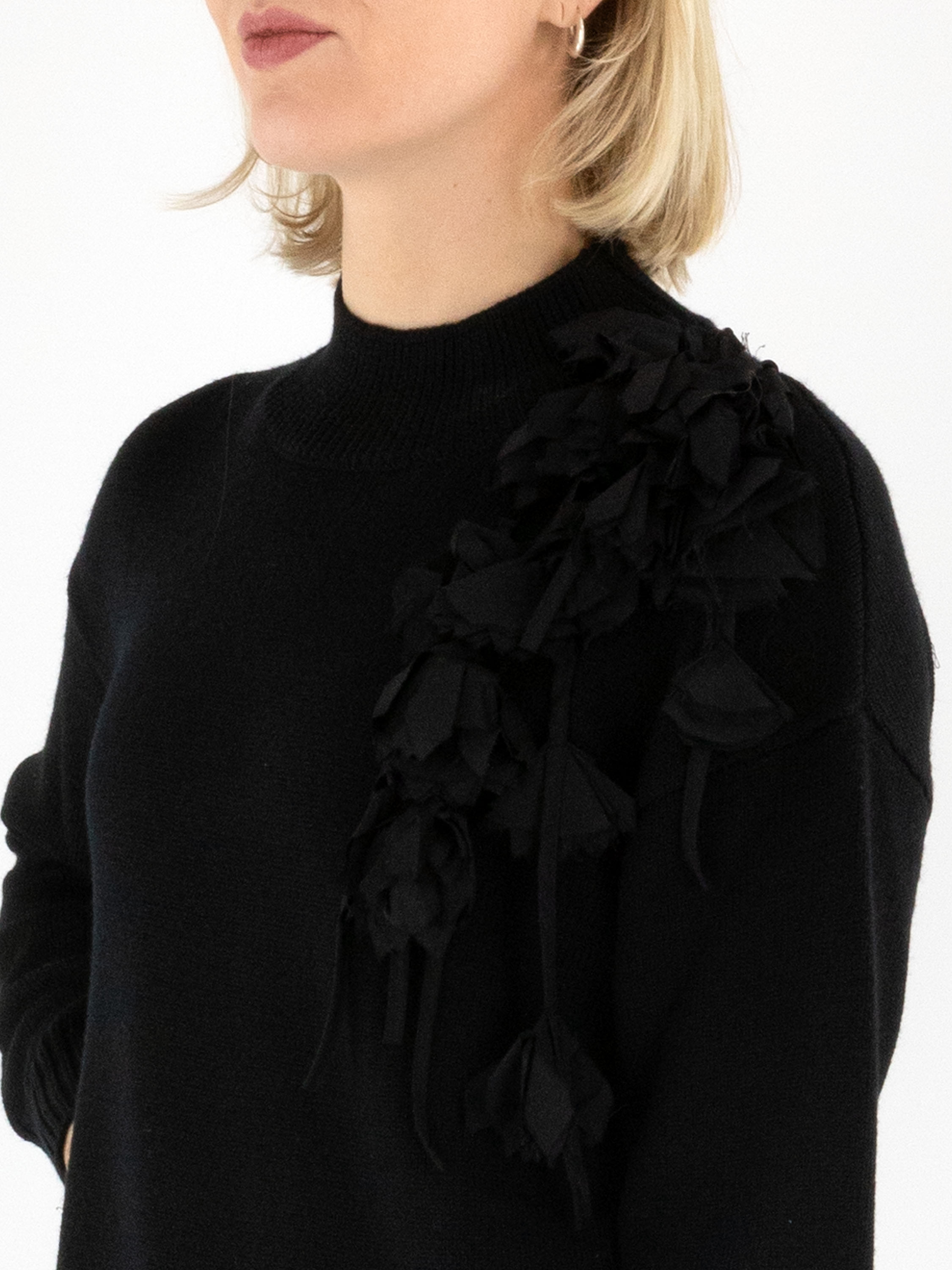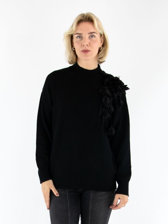 Een luxe pullover van High in de kleur zwart. De pullover heeft een hoge ronde hals en lange mouwen. Vanuit de linker schouder vallen vijf linten in verschillende lengtes, waarin bloemen zijn verwerkt van een matte satijnen stof. Dit bijzondere detail geeft de trui een artistieke en elegante uitstraling. Deze pullover mag niet worden gewassen.