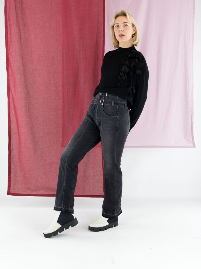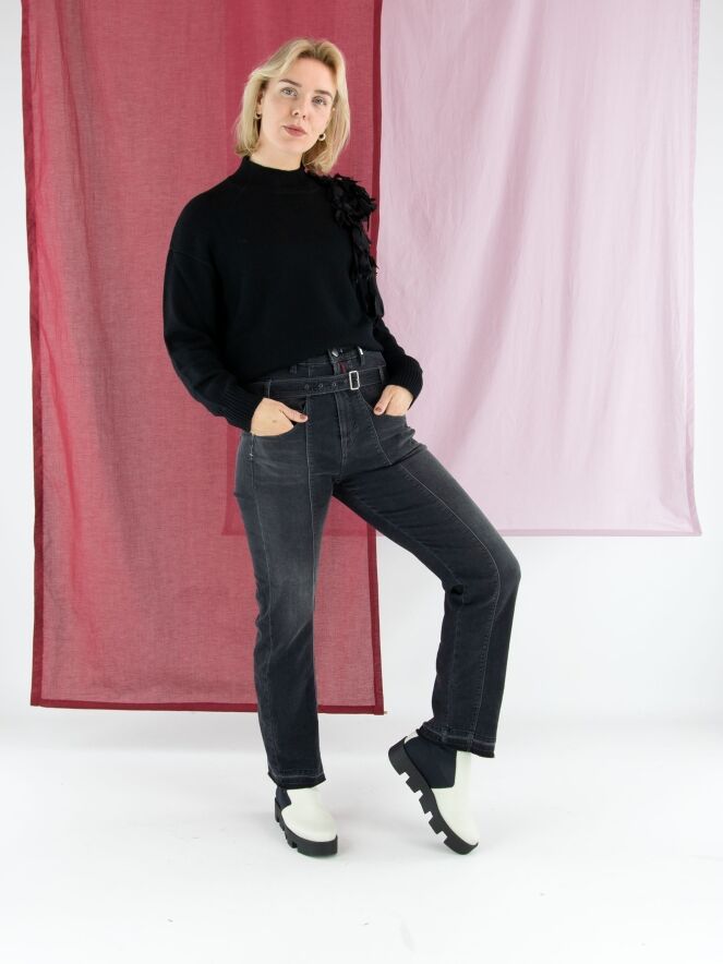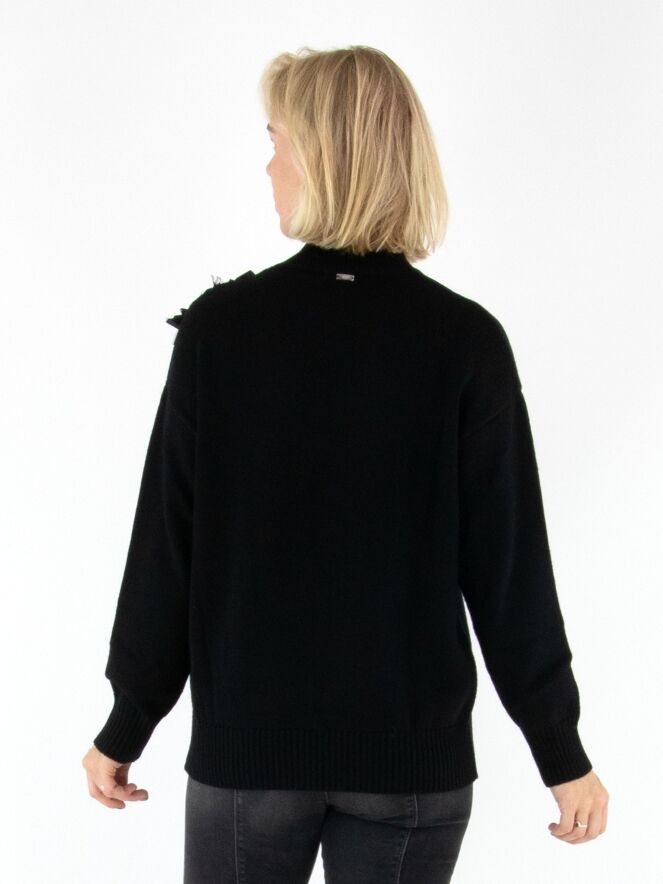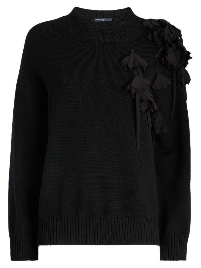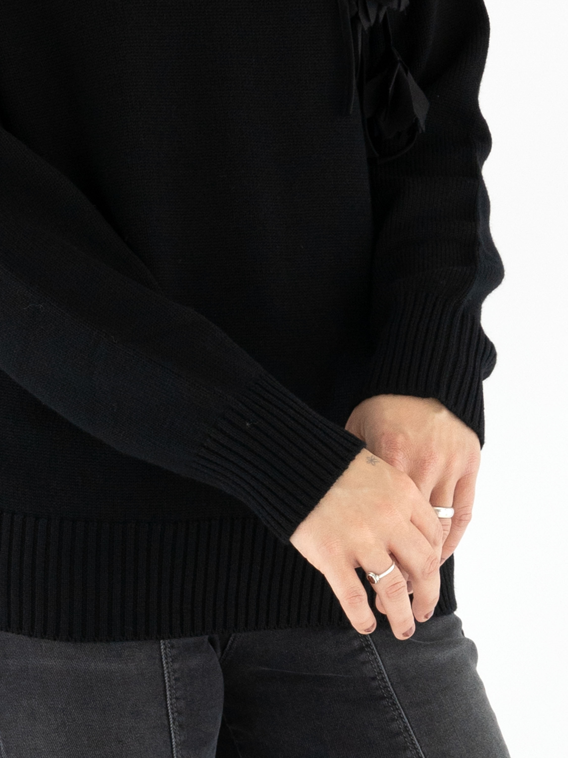 Een luxe pullover van High in de kleur zwart. De pullover heeft een hoge ronde hals en lange mouwen. Vanuit de linker schouder vallen vijf linten in verschillende lengtes, waarin bloemen zijn verwerkt van een matte satijnen stof. Dit bijzondere detail geeft de trui een artistieke en elegante uitstraling. Deze pullover mag niet worden gewassen.
