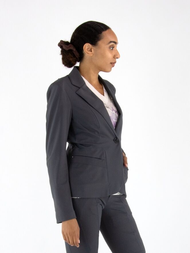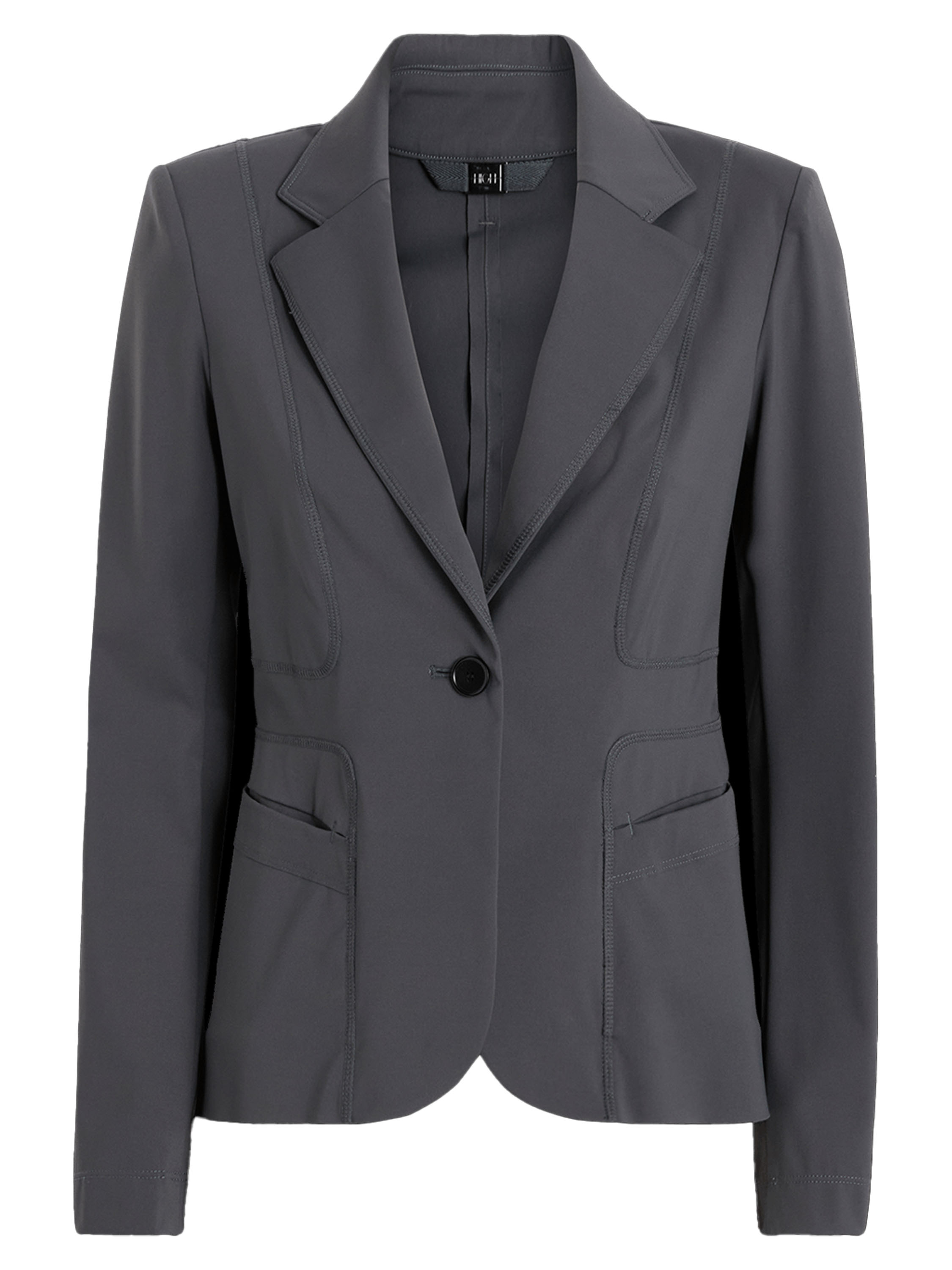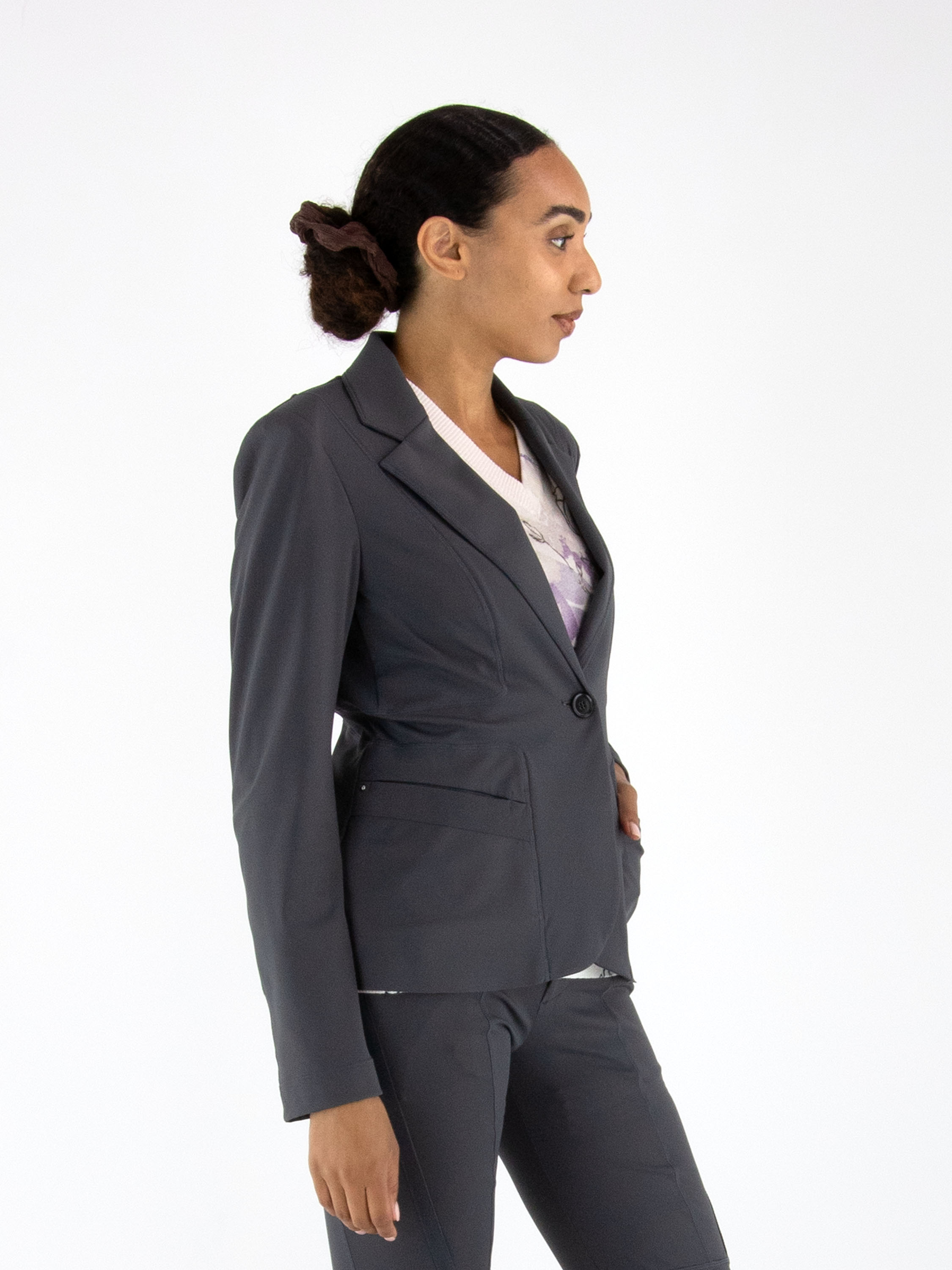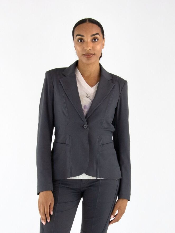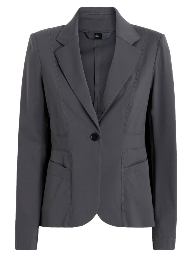 Een blazer van High in een elegante grijze kleur. De blazer is afgewerkt met decoratieve stiknaden in een blokpatroon dat doorloopt vanuit de schouders en langs de zakken. De sluiting is uitgevoerd met één knoop en de blazer is ongevoerd, wat zorgt voor een lichte en moderne uitstraling. Deze blazer mag niet worden gewassen.