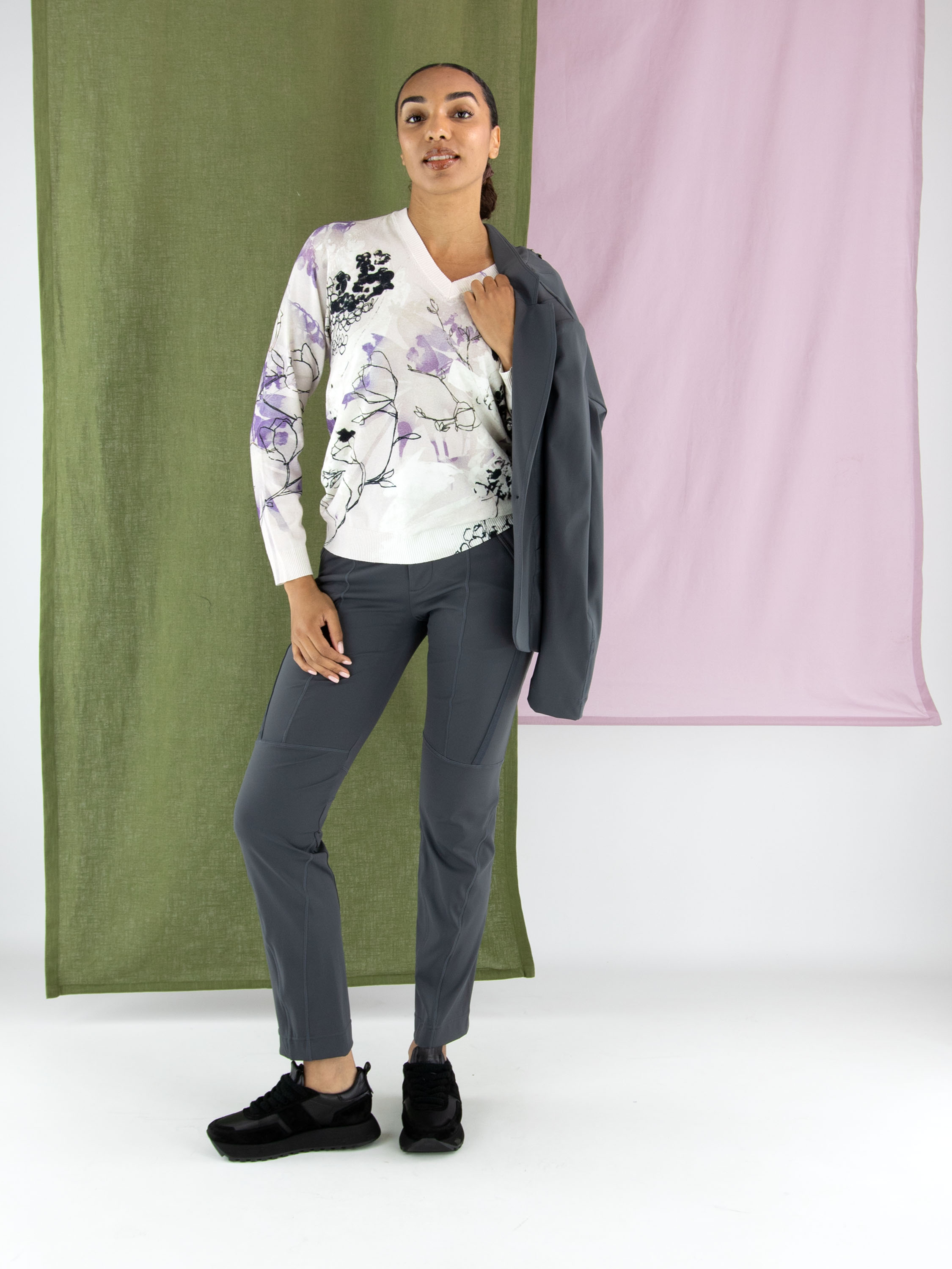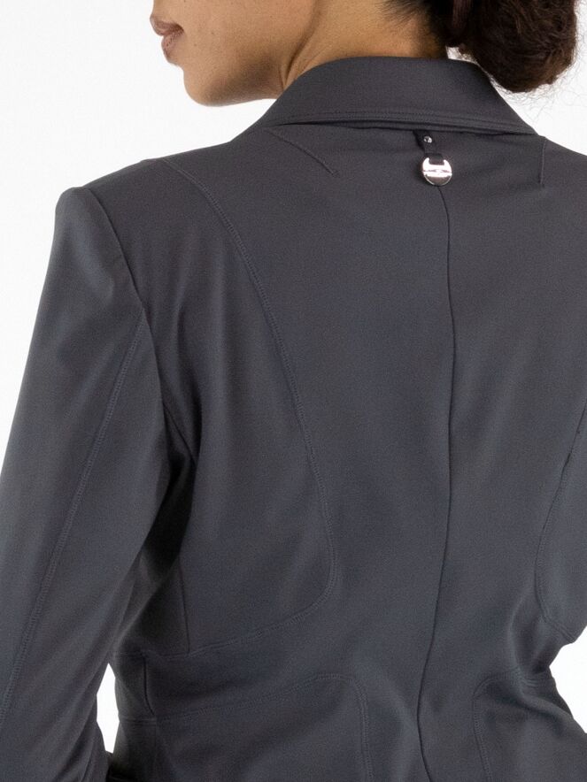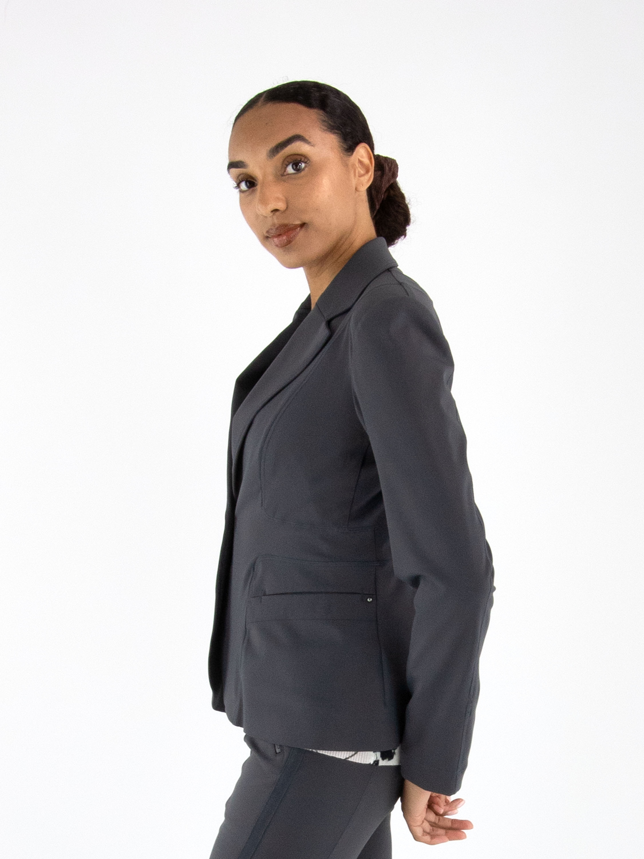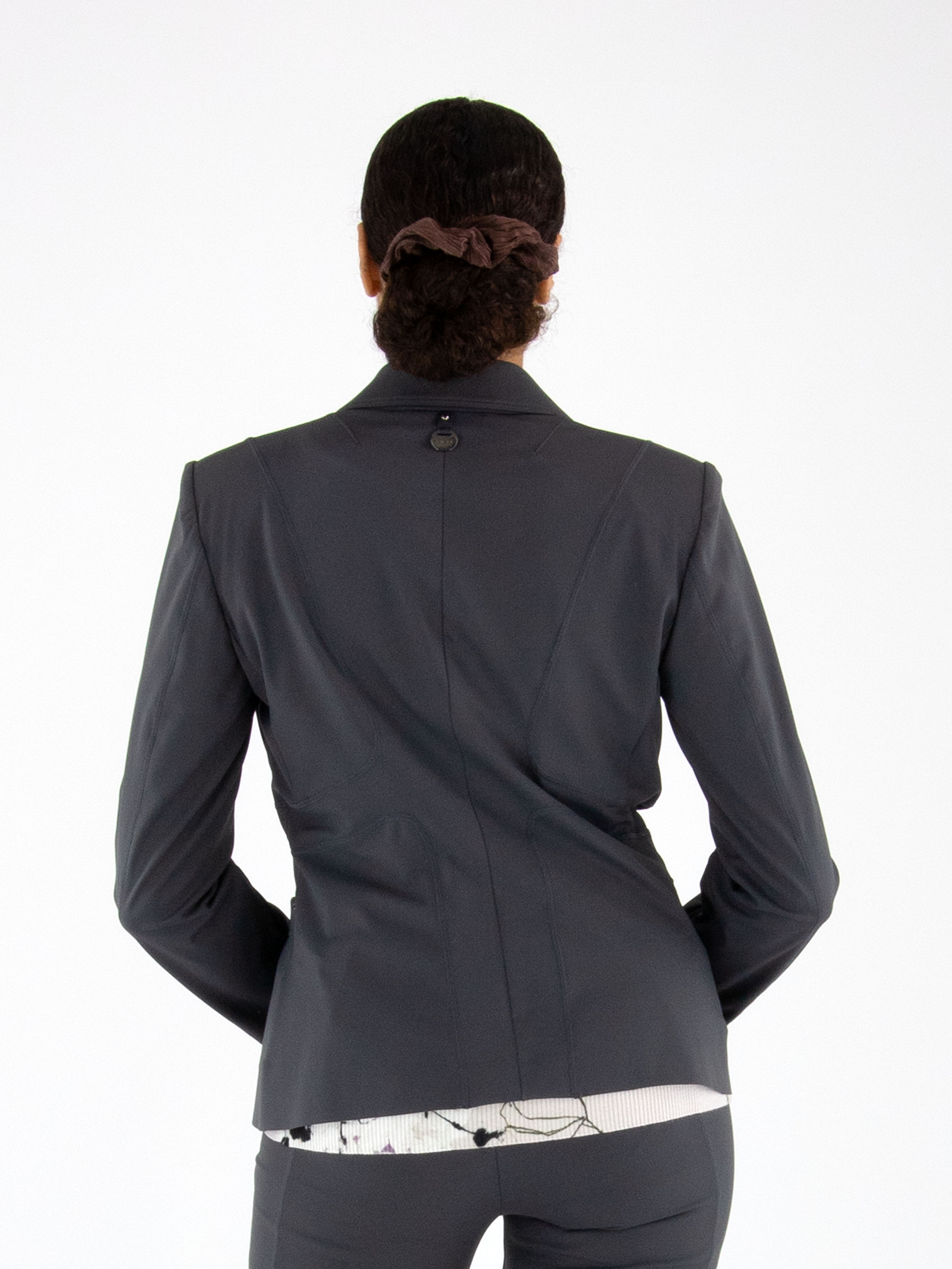 Een blazer van High in een elegante grijze kleur. De blazer is afgewerkt met decoratieve stiknaden in een blokpatroon dat doorloopt vanuit de schouders en langs de zakken. De sluiting is uitgevoerd met één knoop en de blazer is ongevoerd, wat zorgt voor een lichte en moderne uitstraling. Deze blazer mag niet worden gewassen.