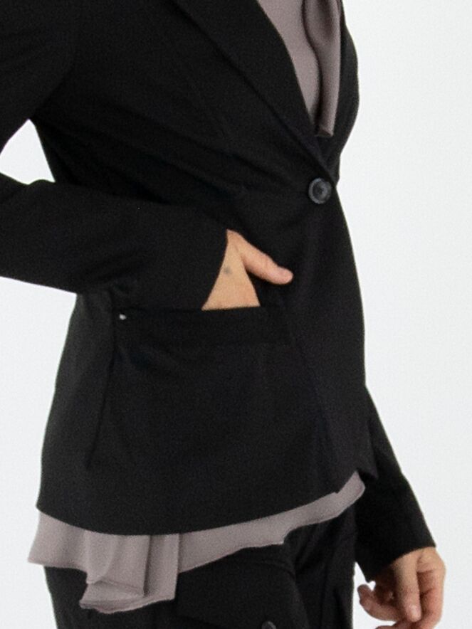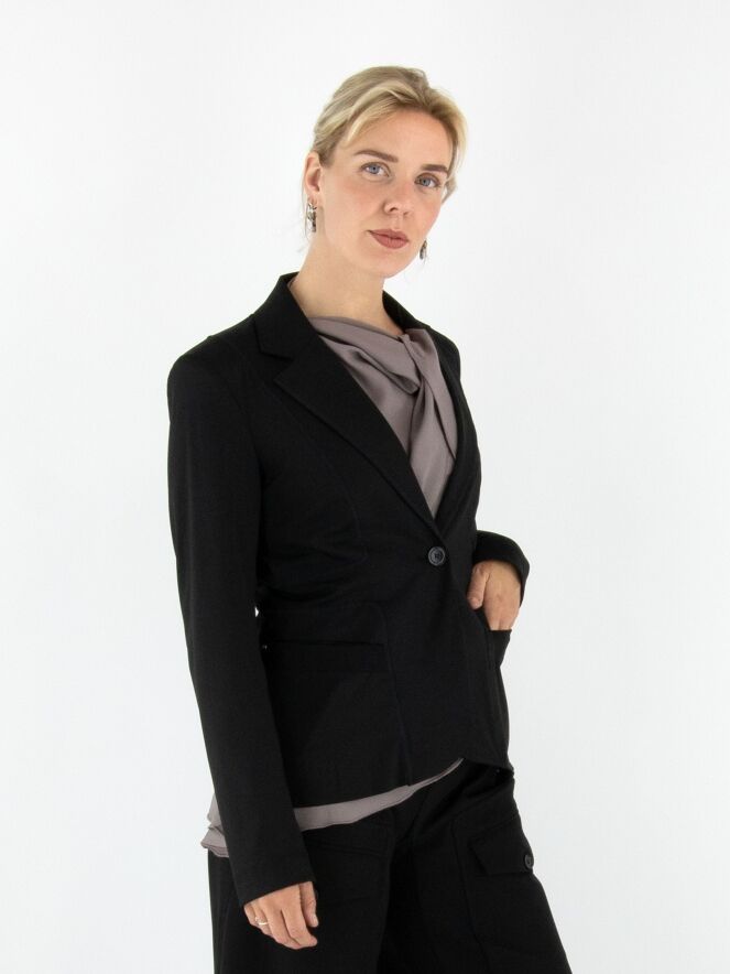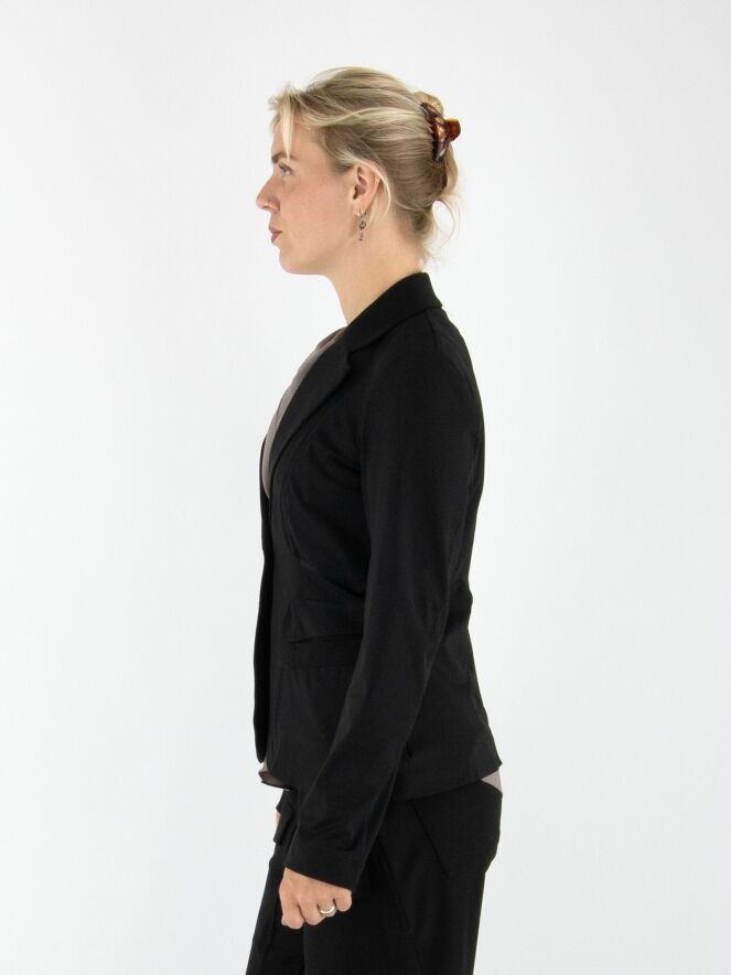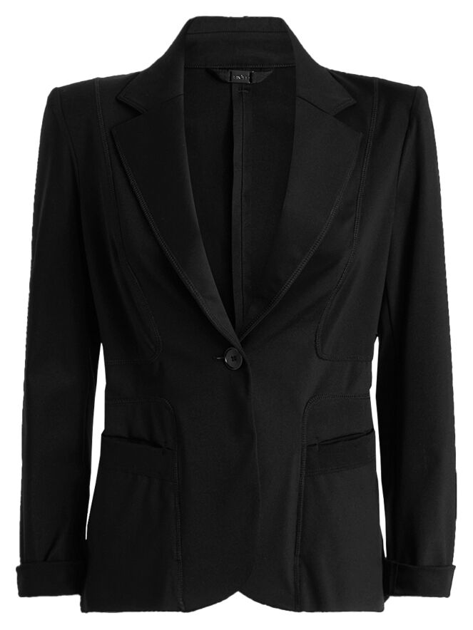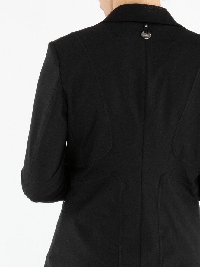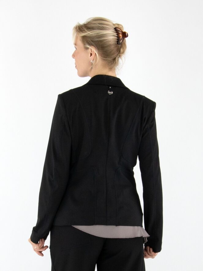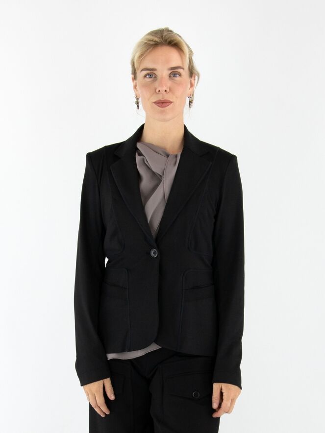 Een blazer van High in de kleur zwart. De blazer heeft decoratieve stiknaden in een blokpatroon, lopend vanuit de schouders en langs de zakken. De sluiting is met één knoop en de blazer is ongevoerd. Deze blazer mag niet worden gewassen.