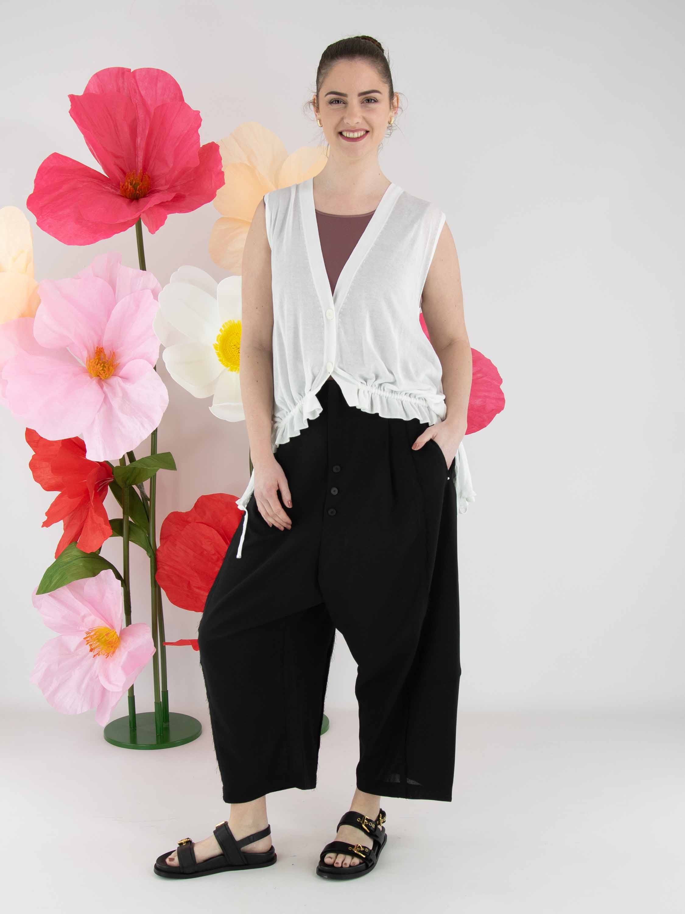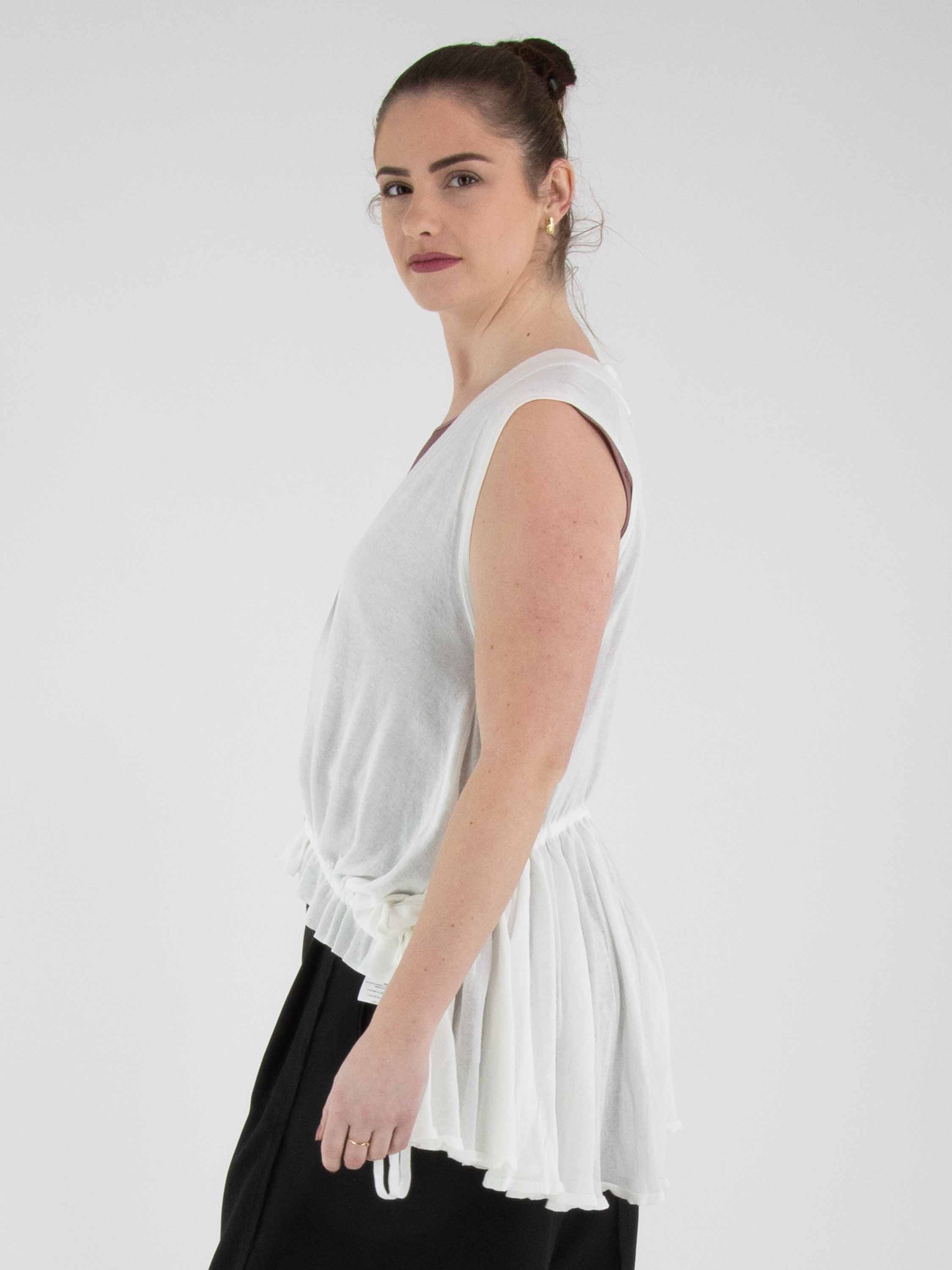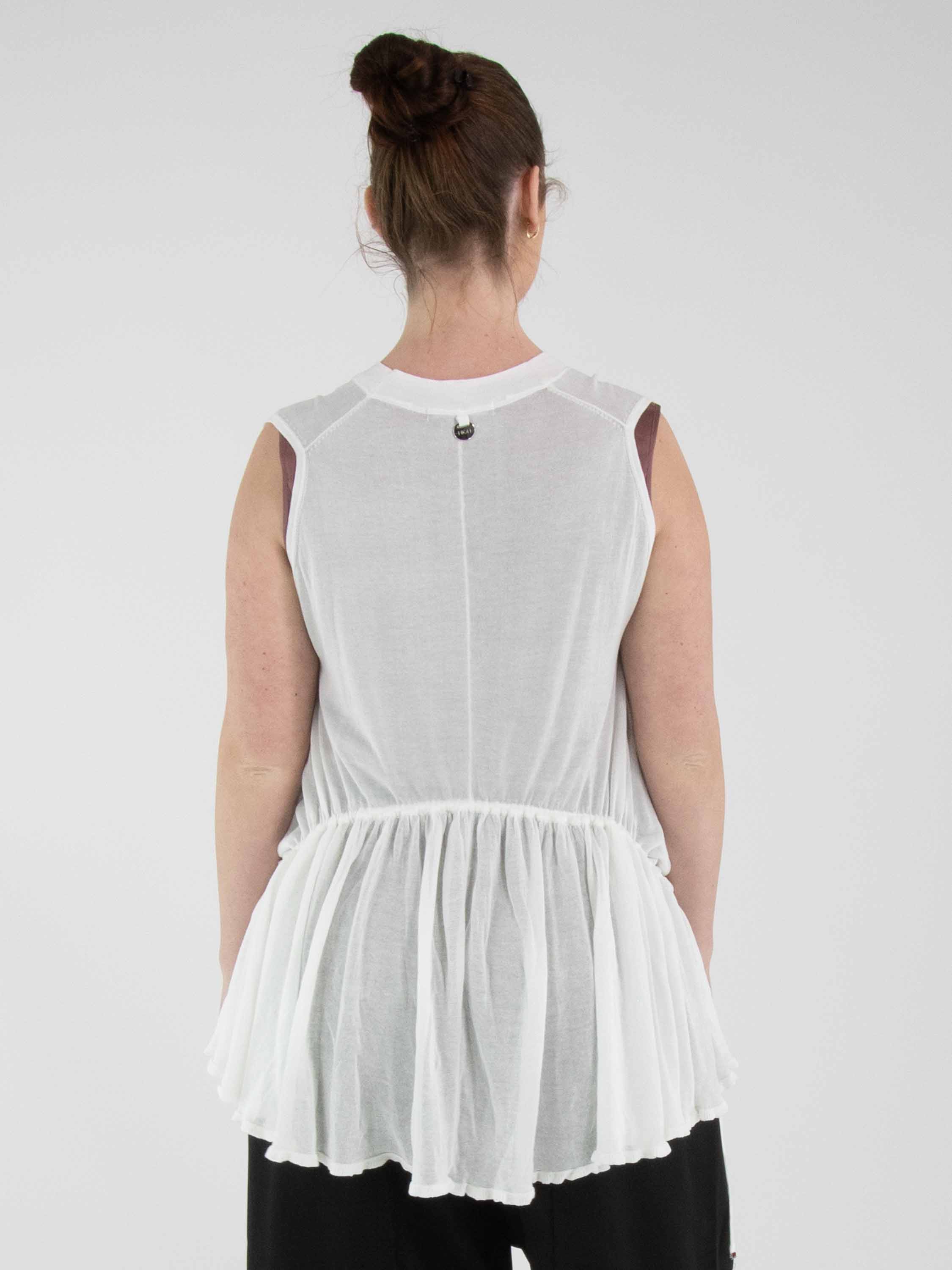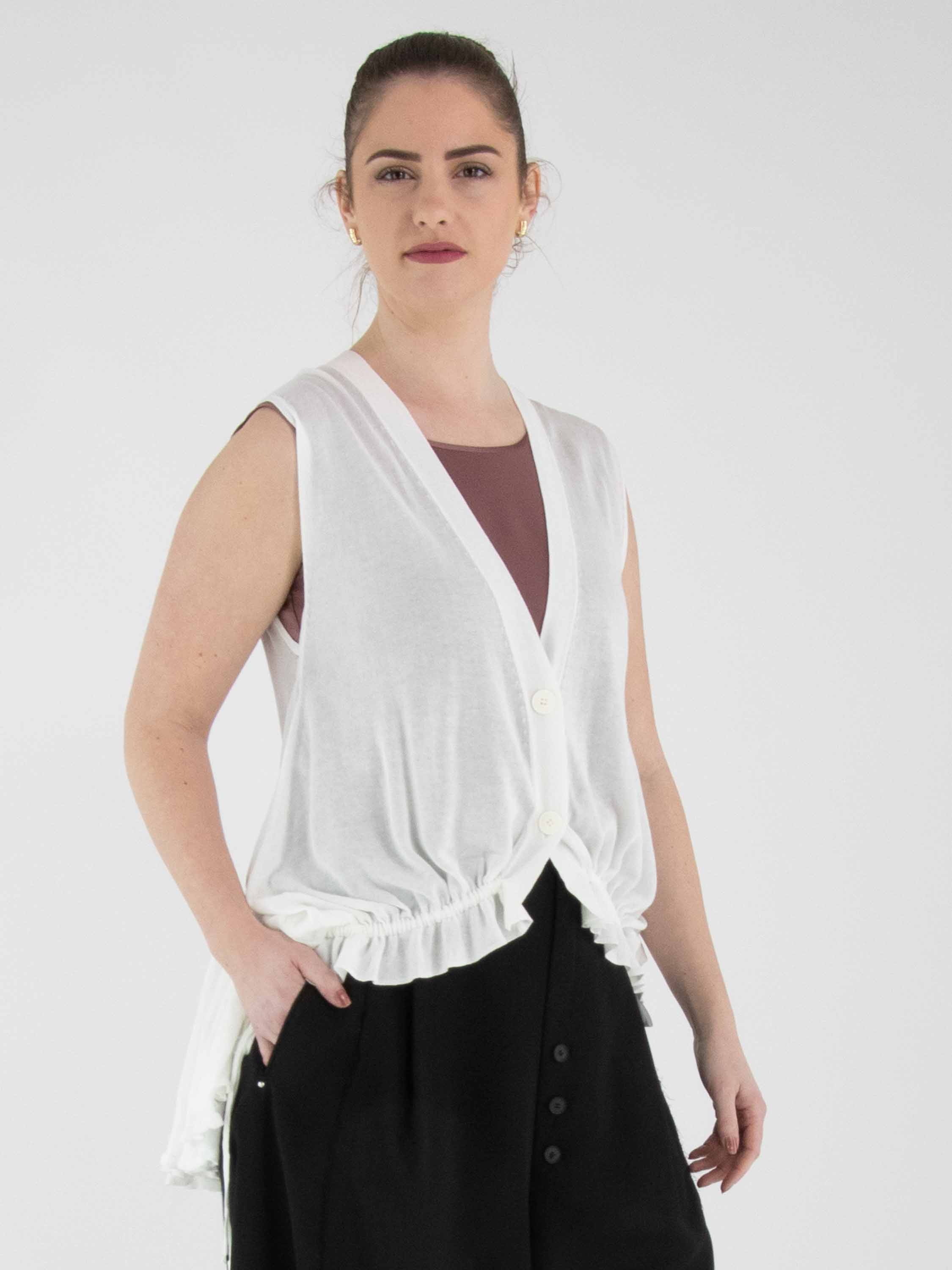 Een licht transparant vest van High in een roomwitte kleur. Het vest heeft een sluiting met twee knopen. In de boord aan de onderzijde van de voorzijde is een lint in tunnelverwerking verwerkt, waarmee een plooieffect kan worden gecreëerd. Aan de achterzijde bevindt dit lint zich in de tunnelverwerking ter hoogte van de taille. Dit vest kan met de hand worden gewassen.