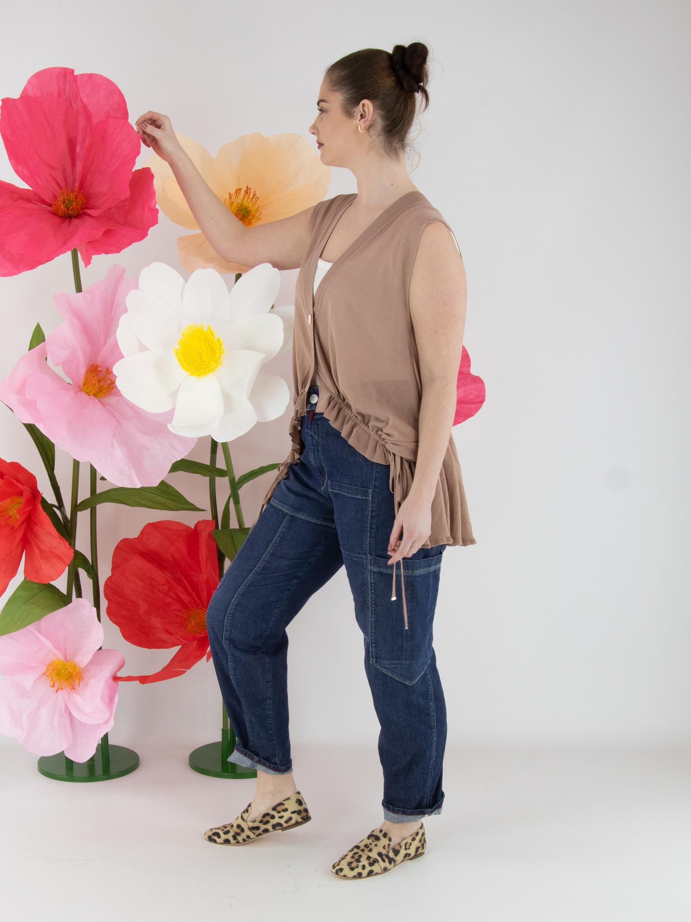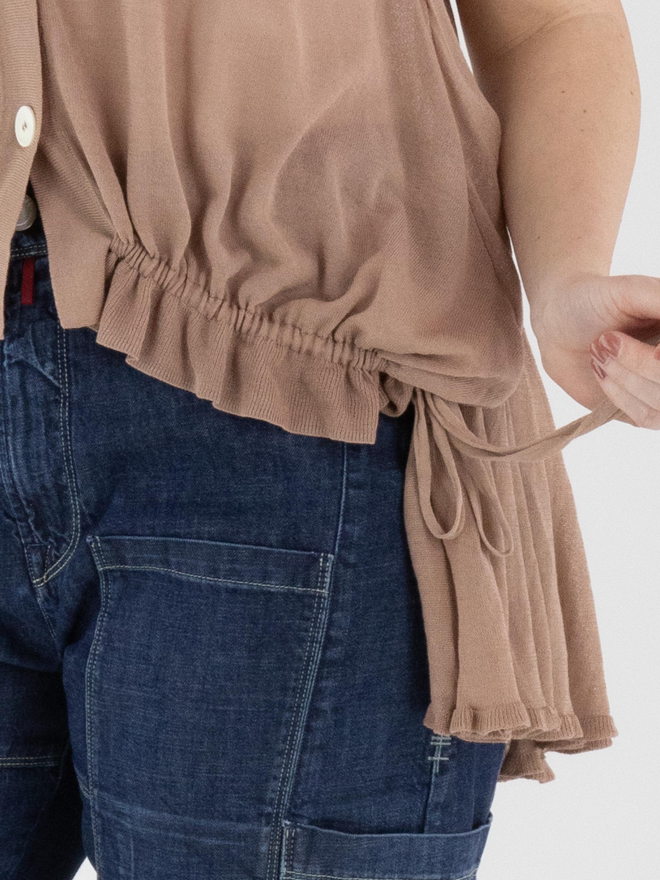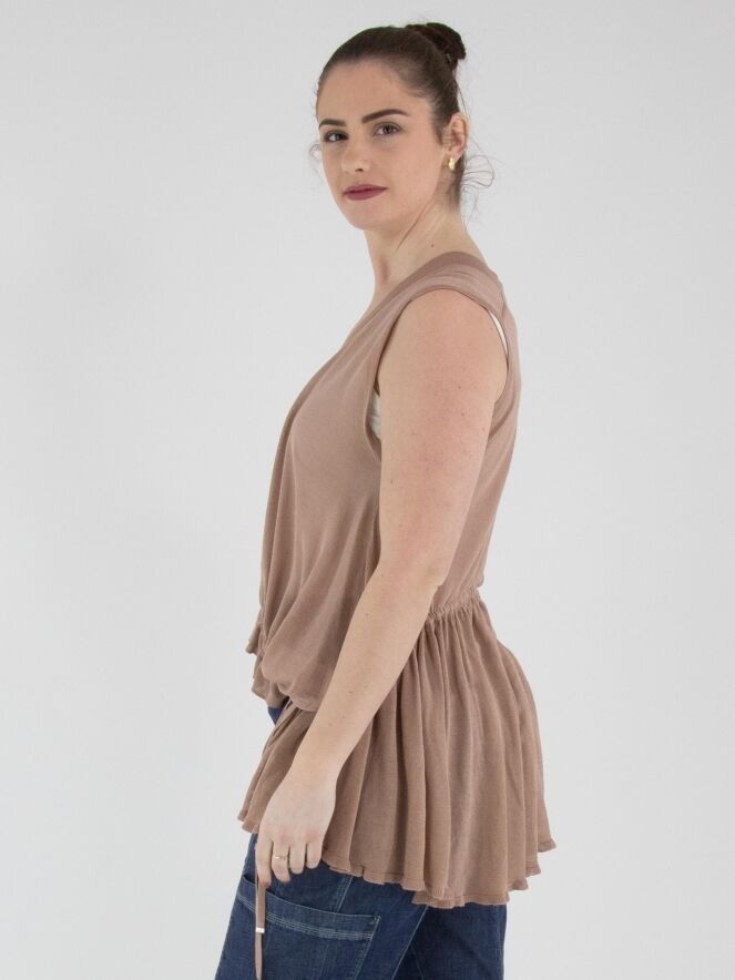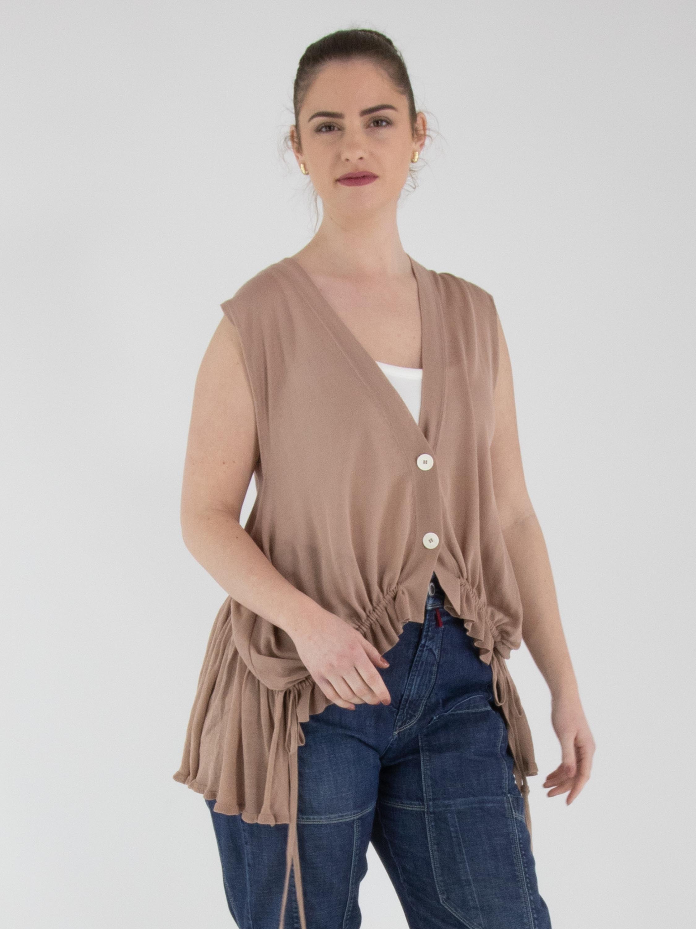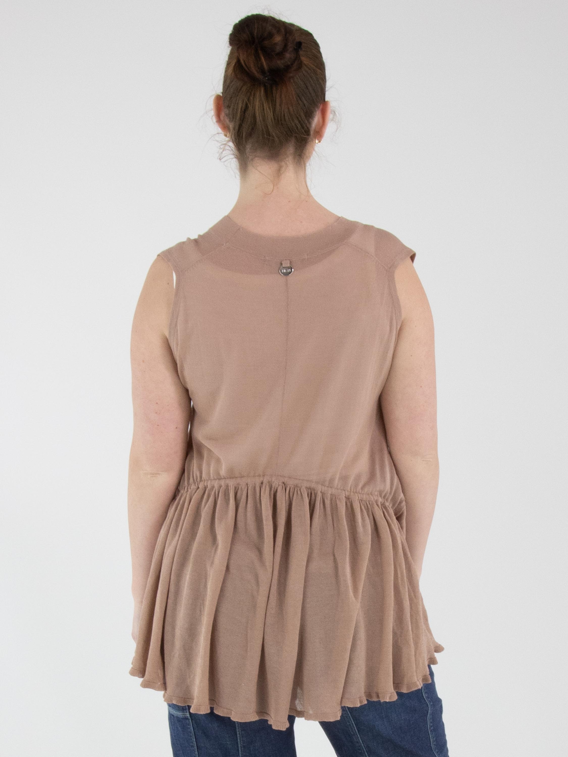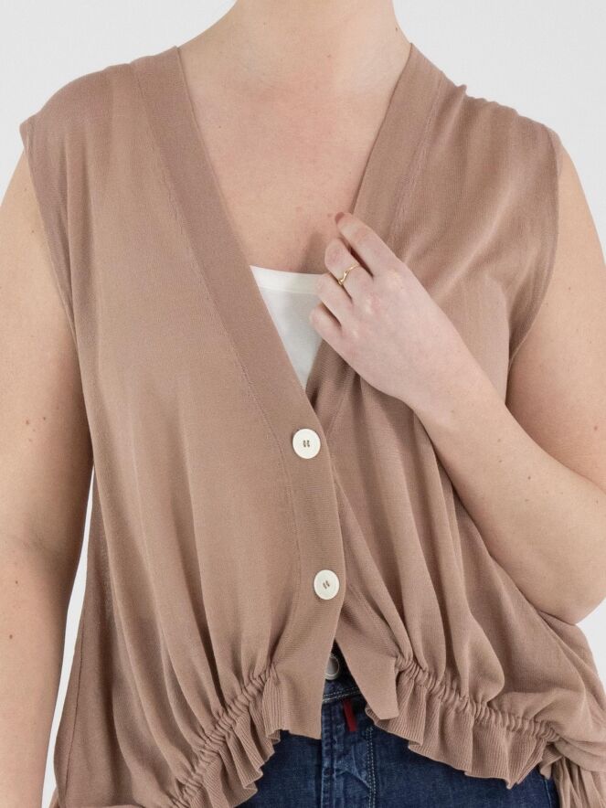 Een licht transparant vest van High in een zachte mauvekleur. Het vest heeft een sluiting met twee knopen. In de boord aan de onderzijde van de voorkant is een lint in tunnelverwerking verwerkt, waarmee een plooieffect kan worden gecreëerd. Aan de achterkant bevindt dit lint in de tunnelverwerking zich ter hoogte van de taille. Dit vest kan met de hand worden gewassen.